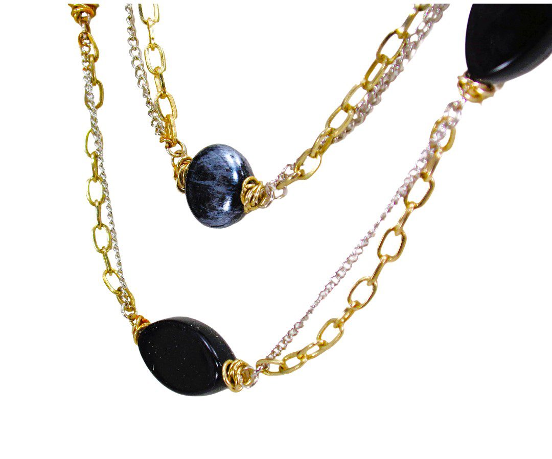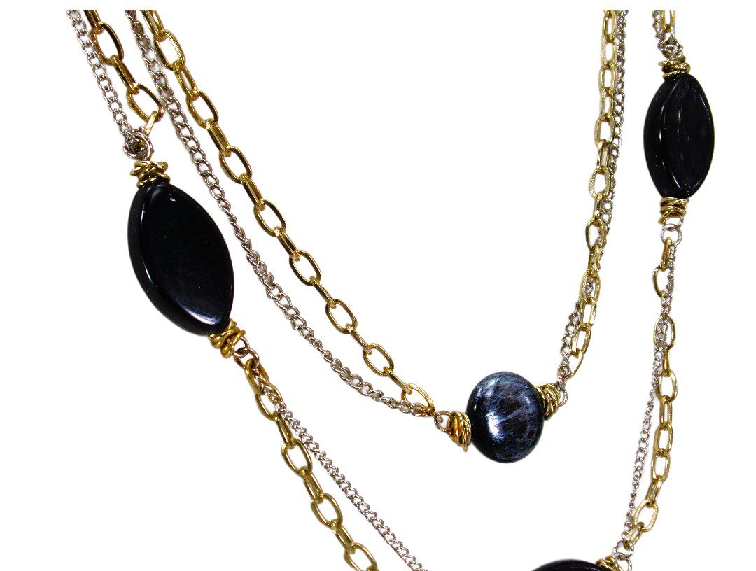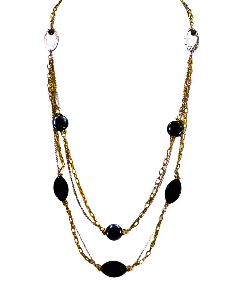 BLACK BEAD LAYERED NECKLACE WITH SILVER AND GOLD CHAIN