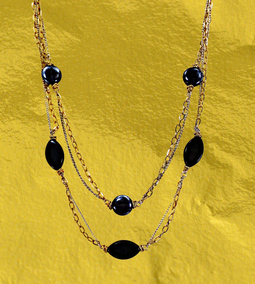 Elevate any look with this beautifully handcrafted layered black beaded necklace, designed to transition effortlessly from office polish to evening elegance. Featuring a striking mix of gold and silver plated chains, this unique design creates depth, movement, and modern contrast that instantly enhances any outfit.