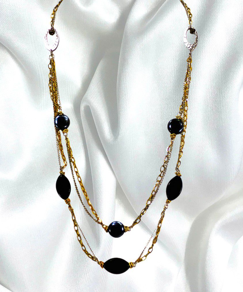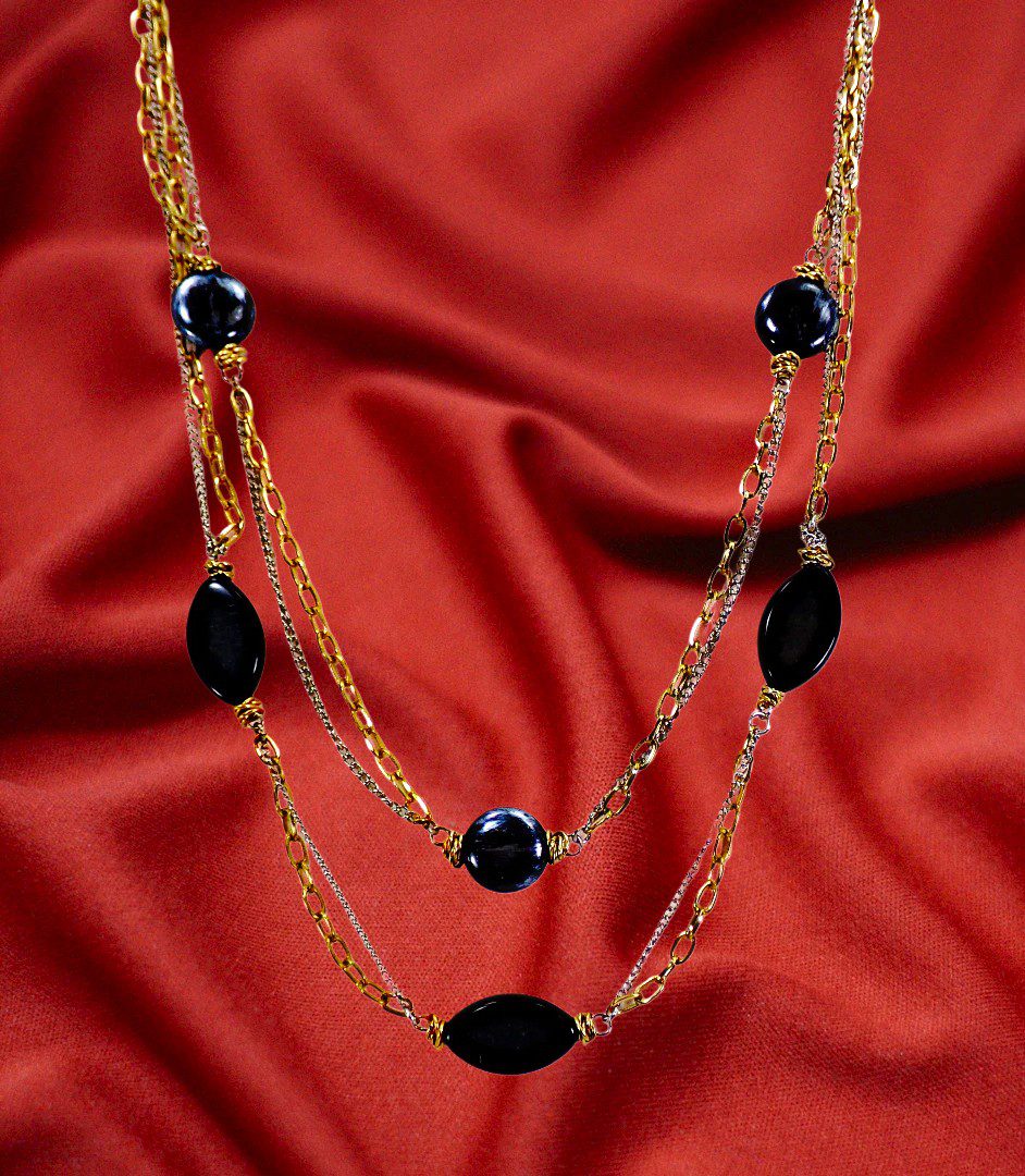 Be the first to review “BLACK BEAD LAYERED NECKLACE WITH SILVER AND GOLD CHAIN”