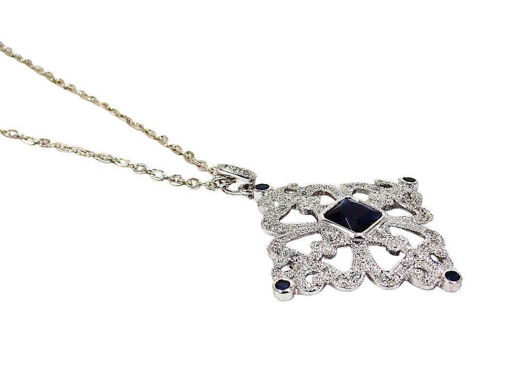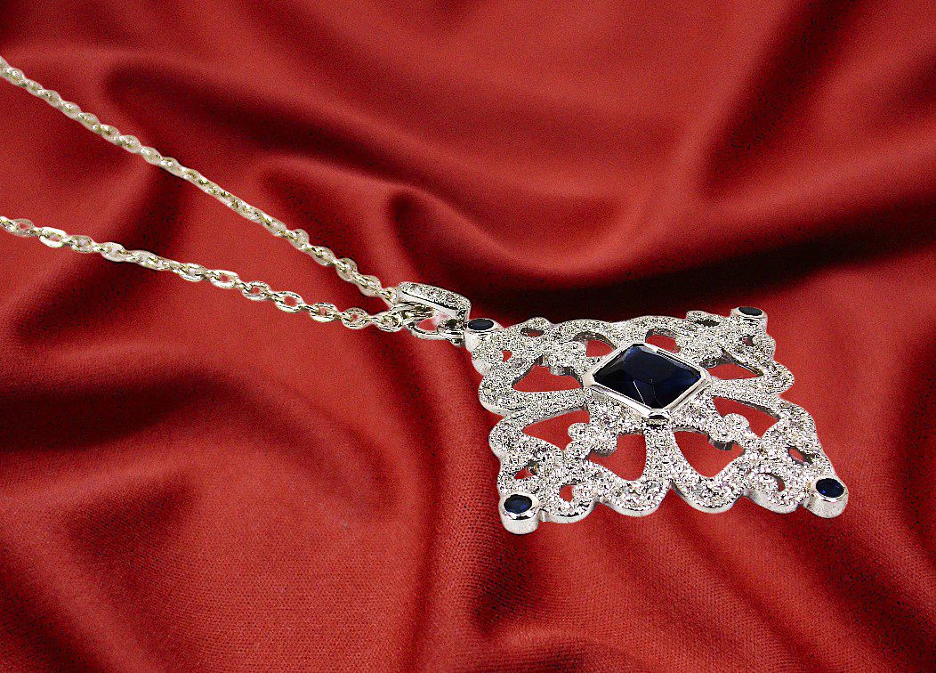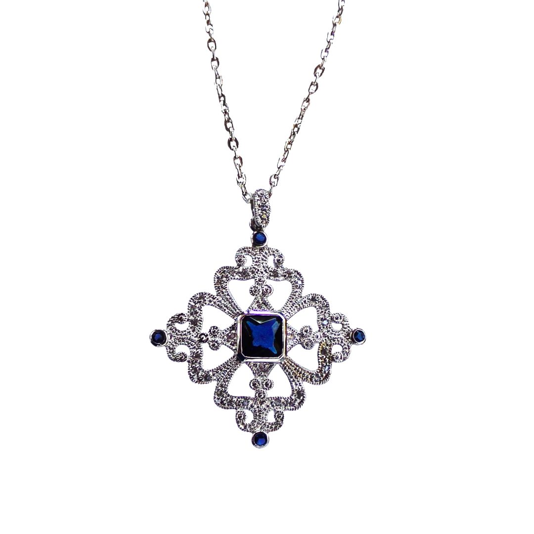 At the heart of the pendant sits a brilliant blue cushion-cut cubic zirconia, catching the light with every movement and adding a rich pop of color that feels both regal and refined. The combination of deep blue sparkle and brilliant clear accents gives this piece a luxurious, heirloom-inspired look — without the heirloom price.