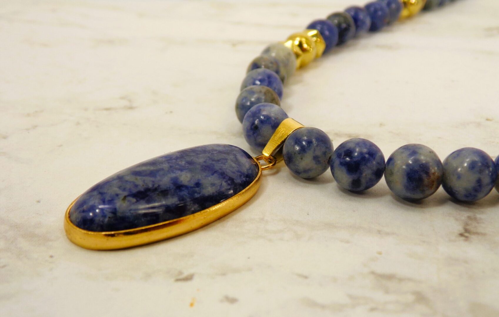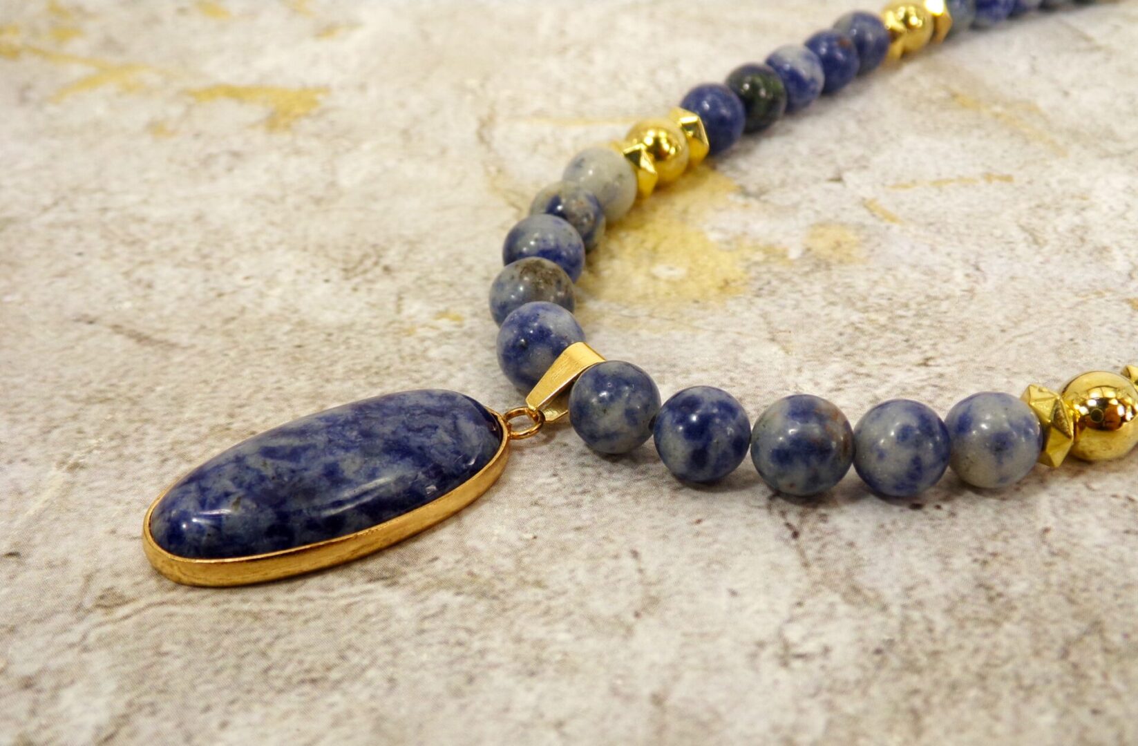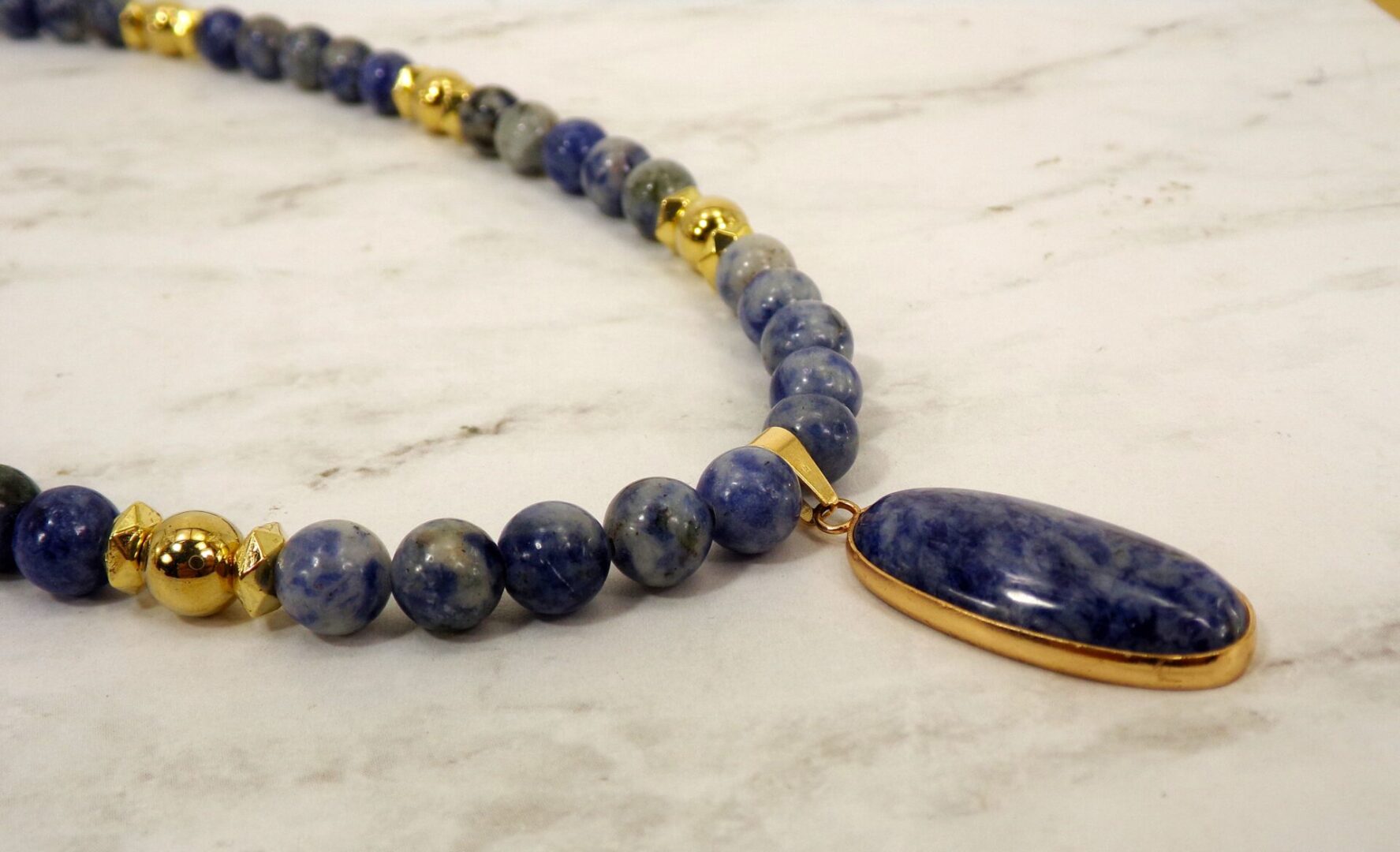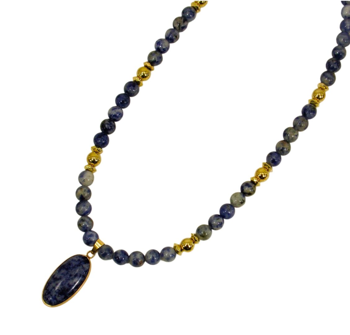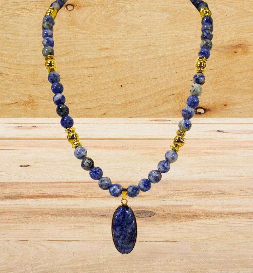 Radiate confidence and calm with this exquisite blue sodalite stone pendant necklace, a timeless blend of natural beauty and refined elegance. Each piece is crafted with smooth polished sodalite beads—renowned for their deep blue color and subtle white marbling—complemented by gold-plated accents that add warmth and sophistication.