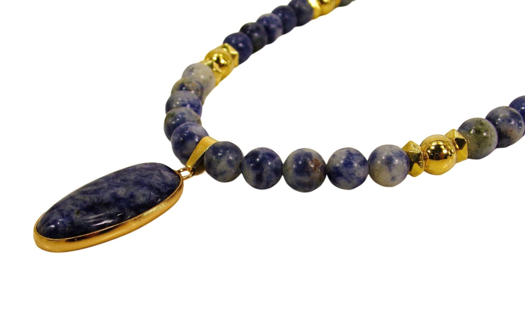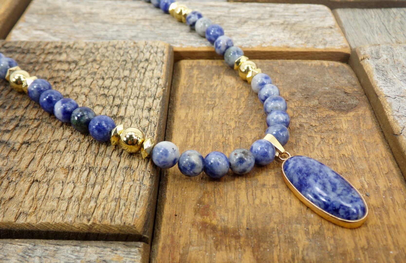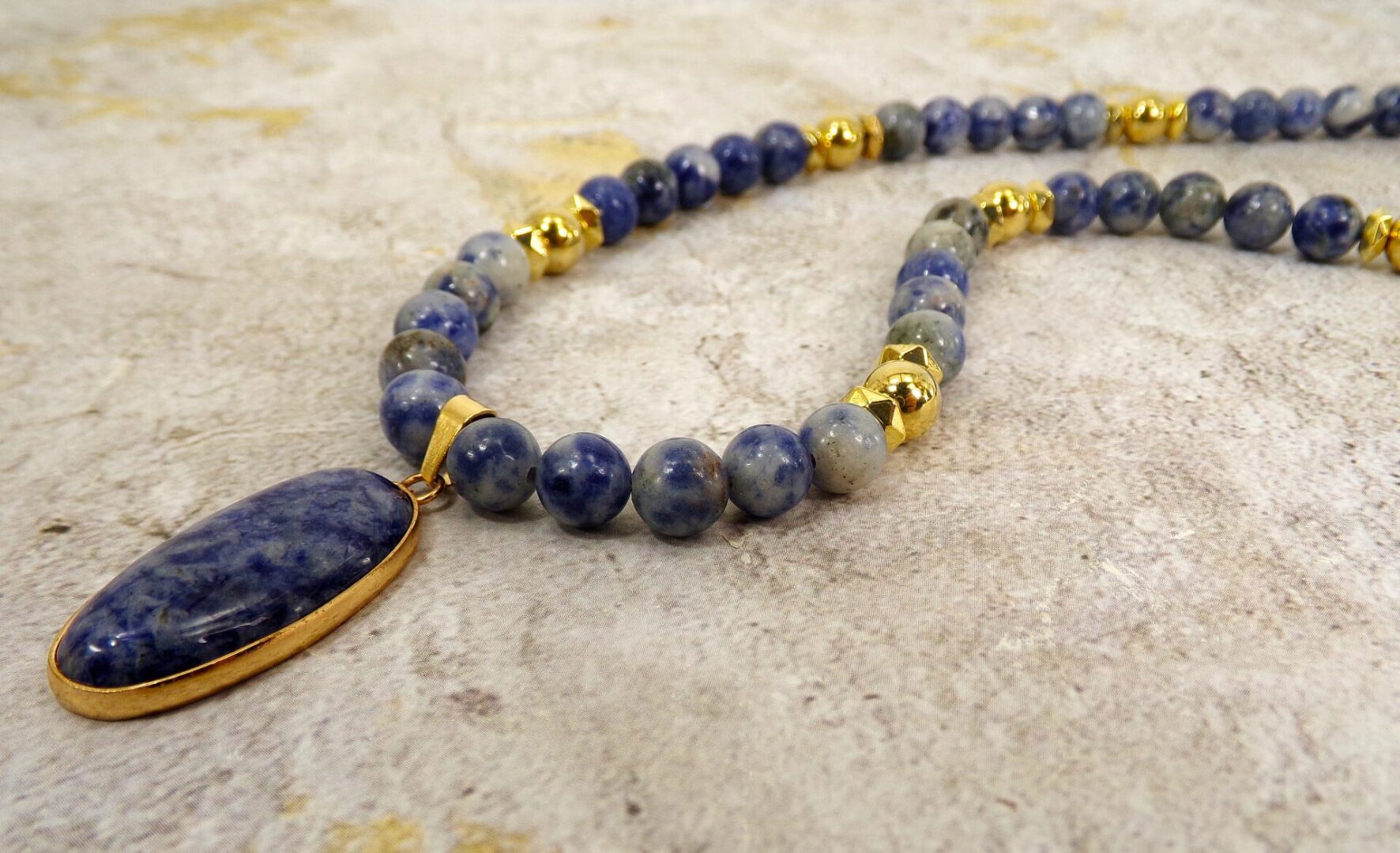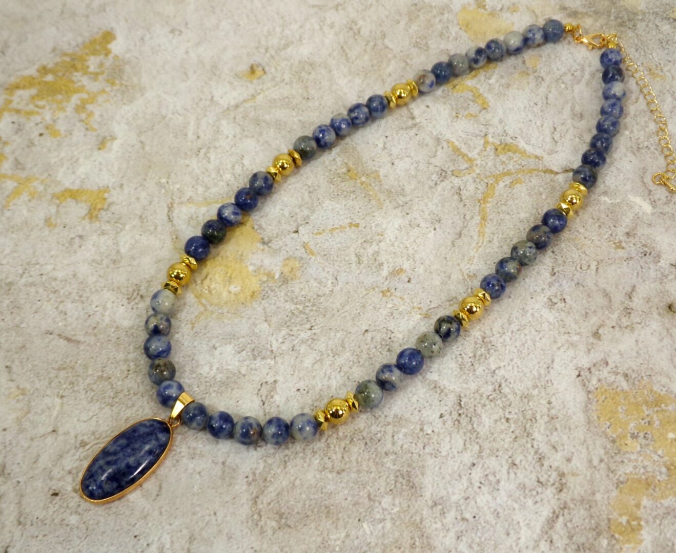 Radiate confidence and calm with this exquisite blue sodalite stone pendant necklace, a timeless blend of natural beauty and refined elegance. Each piece is crafted with smooth polished sodalite beads—renowned for their deep blue color and subtle white marbling—complemented by gold-plated accents that add warmth and sophistication.