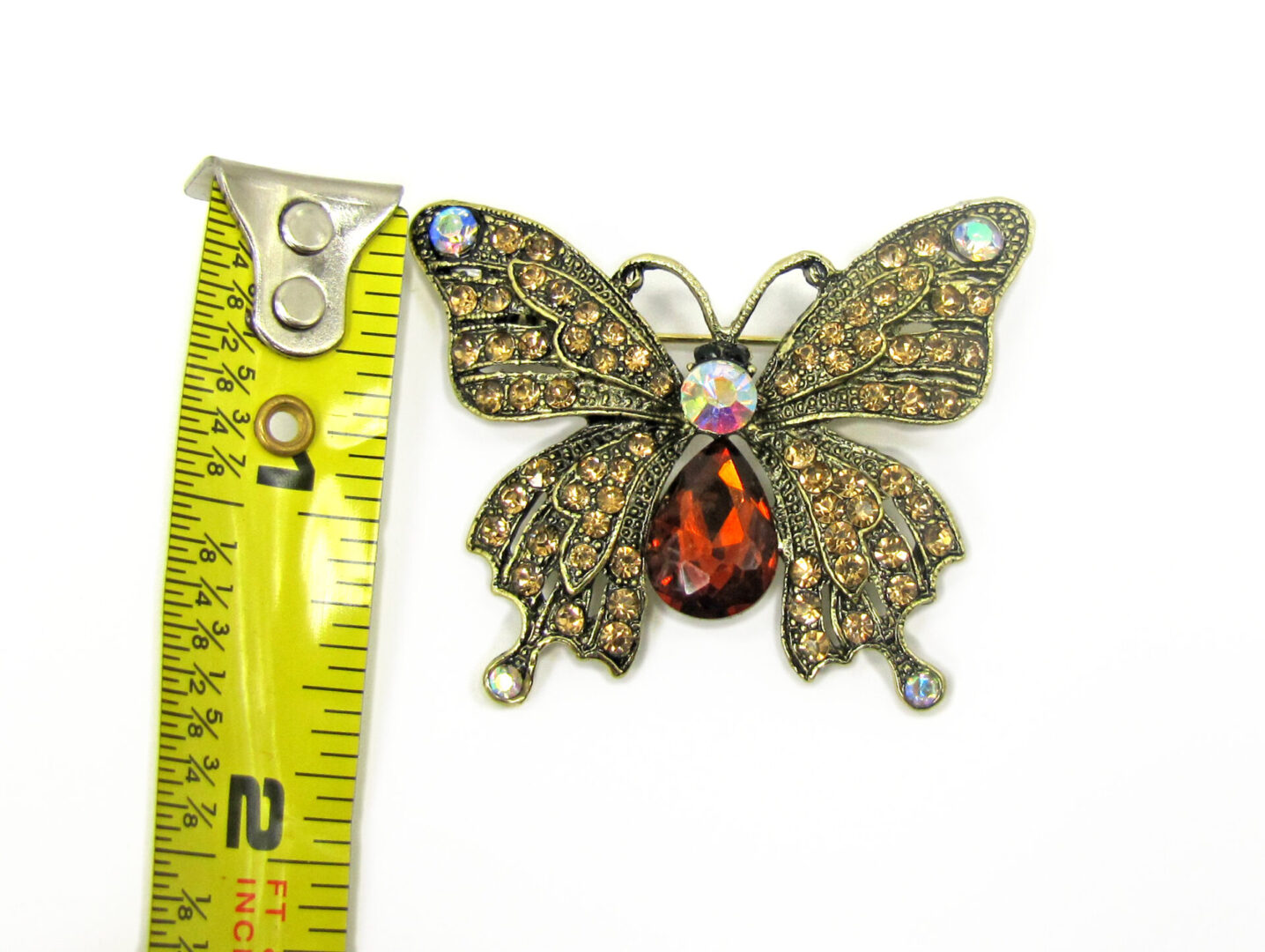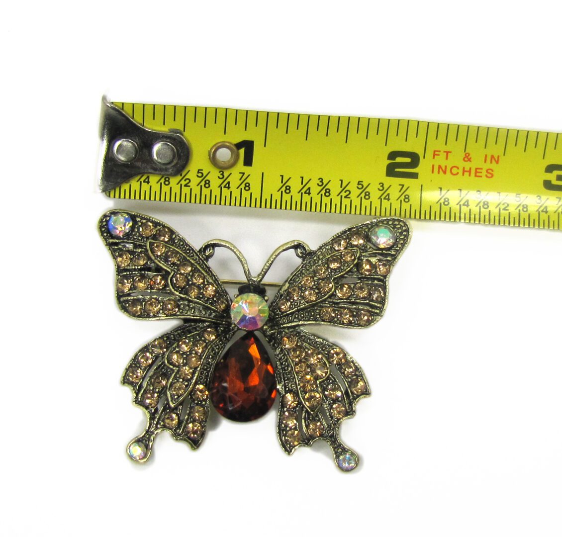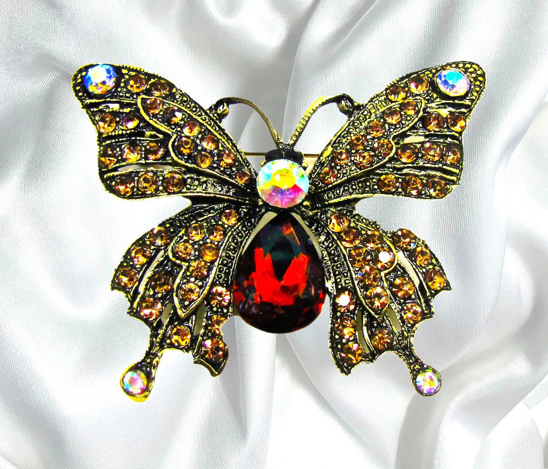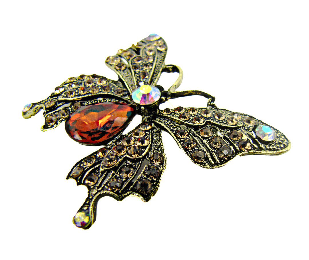 Vintage inspired butterfly brooch pin design. Add a touch of timeless elegance and vintage charm to any outfit with this exquisite butterfly brooch. Crafted in an antique gold-tone finish, this intricately detailed piece features shimmering brown and champagne-colored crystals that catch the light beautifully, while Aurora Borealis accents add a captivating iridescent sparkle.