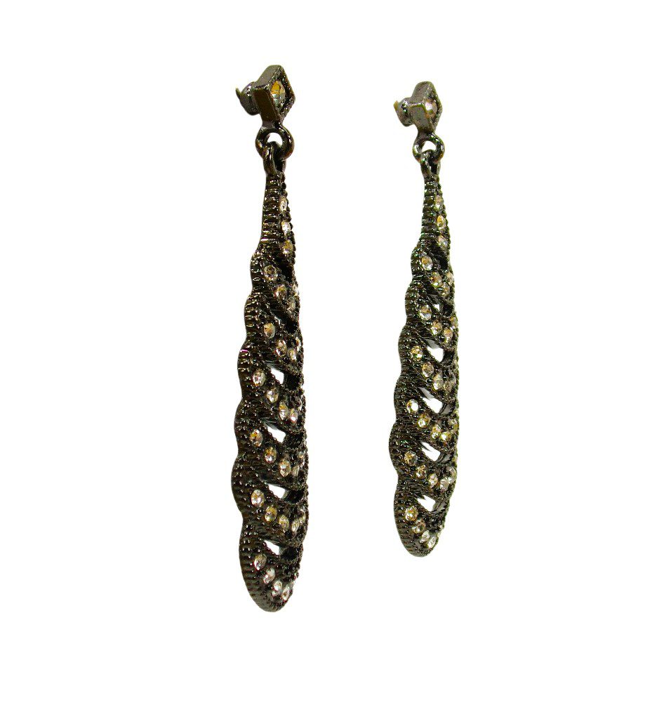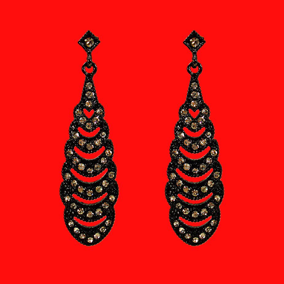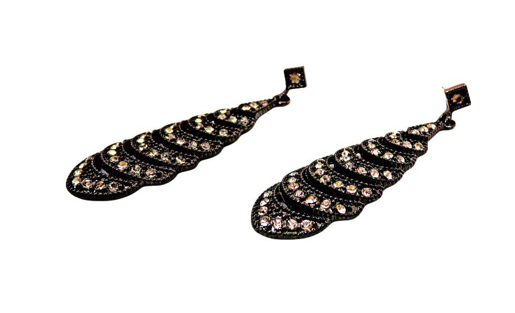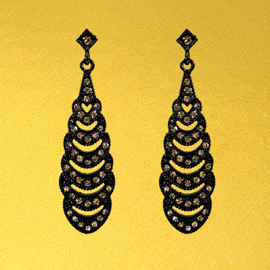 Long elegant crystal earrings. They are designed with small round clear crystal and finished in a timeless black color finish.