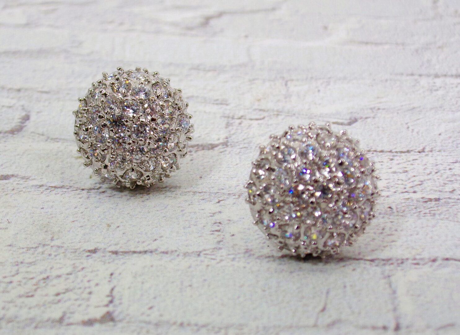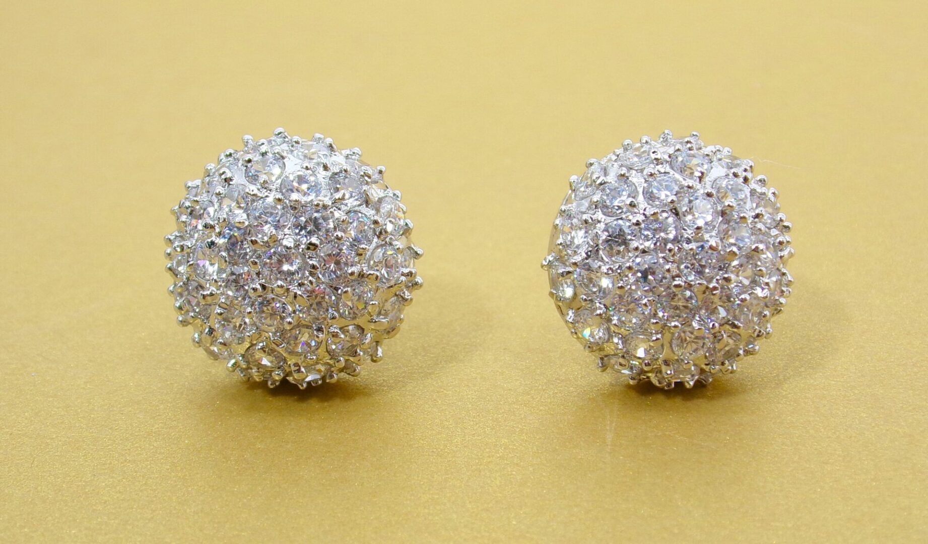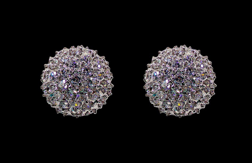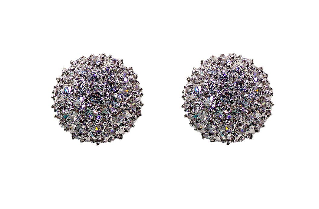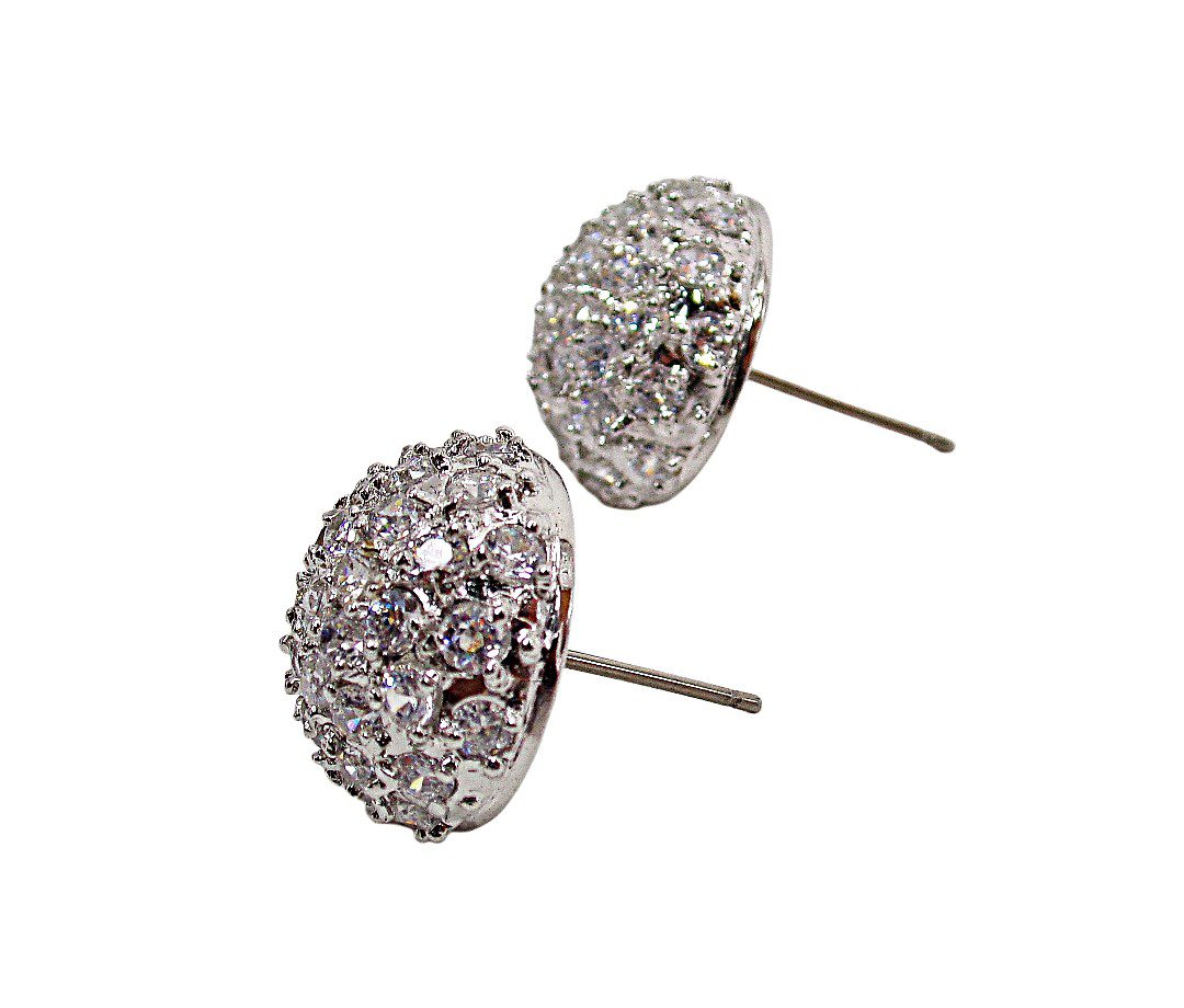 Elegant round dome shape clear cubic zirconia stone earrings. They are designed with all small round cz stones prong set into the half round dome shape earrings.  They’re a beautiful and timeless pair of earrings that work perfect for any special occasion and with any outfit.  A must have treasure piece for any jewelry wardrobe.