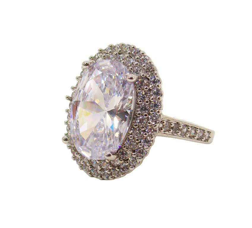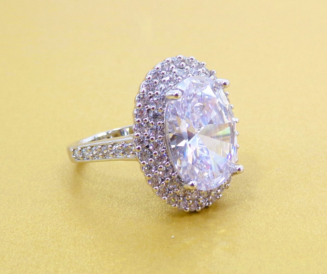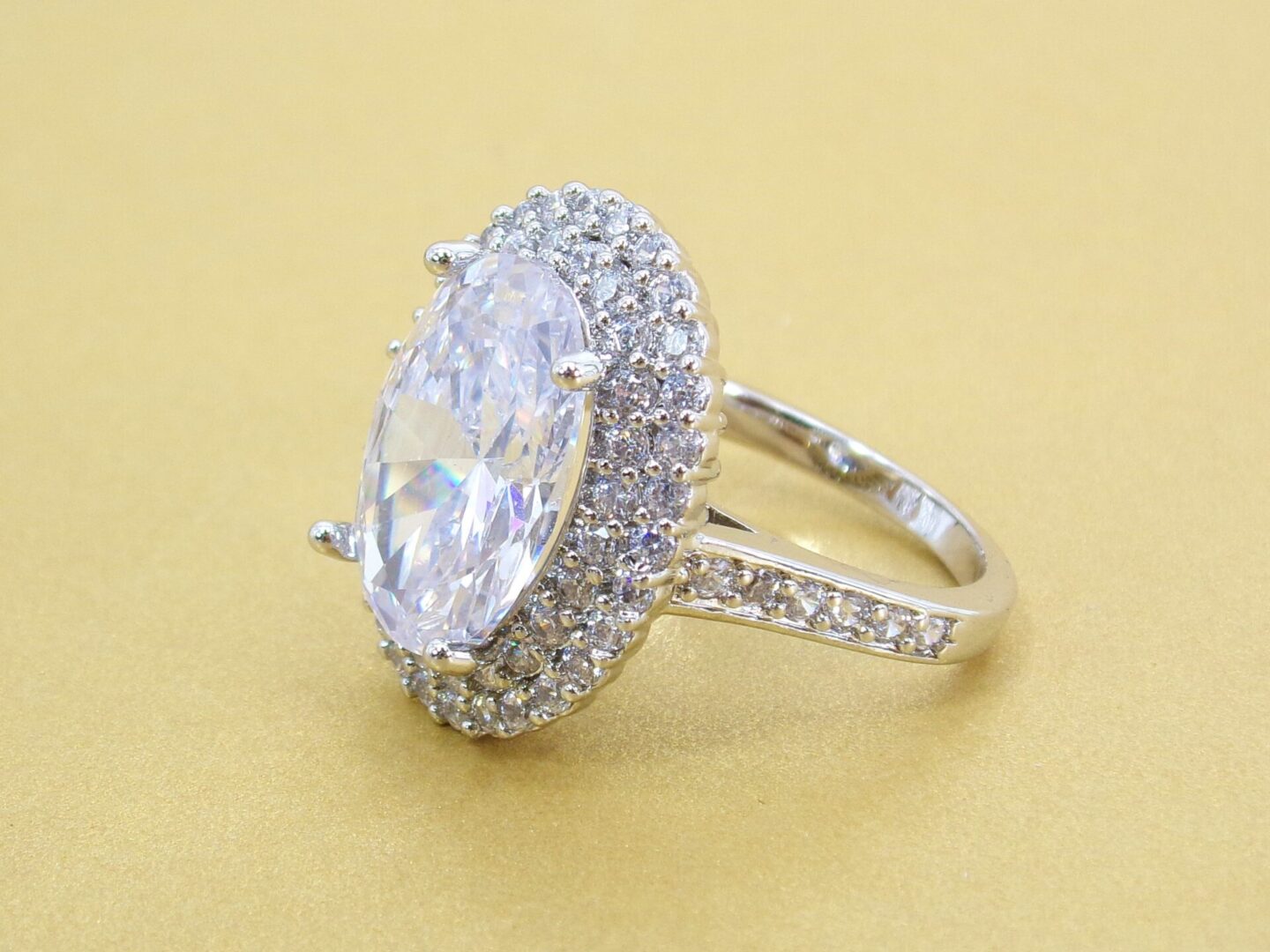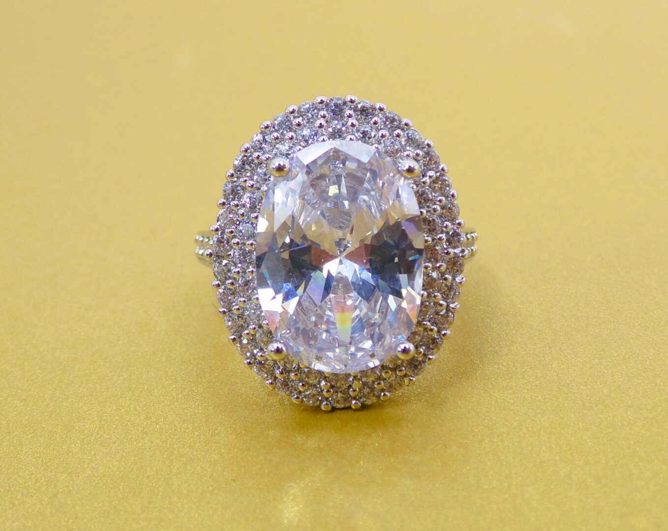 Sparkling large clear cubic zirconia statement ring. It is created with a big oval shape cubic zirconia stone and small round clear stones set all around it. A beautiful big and bold look of real ring that works with any outfit.