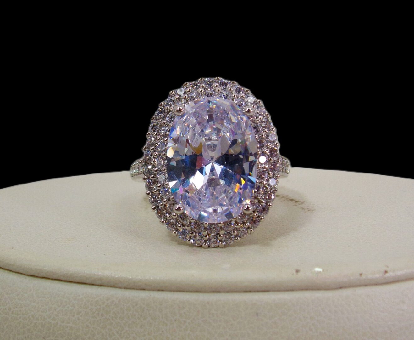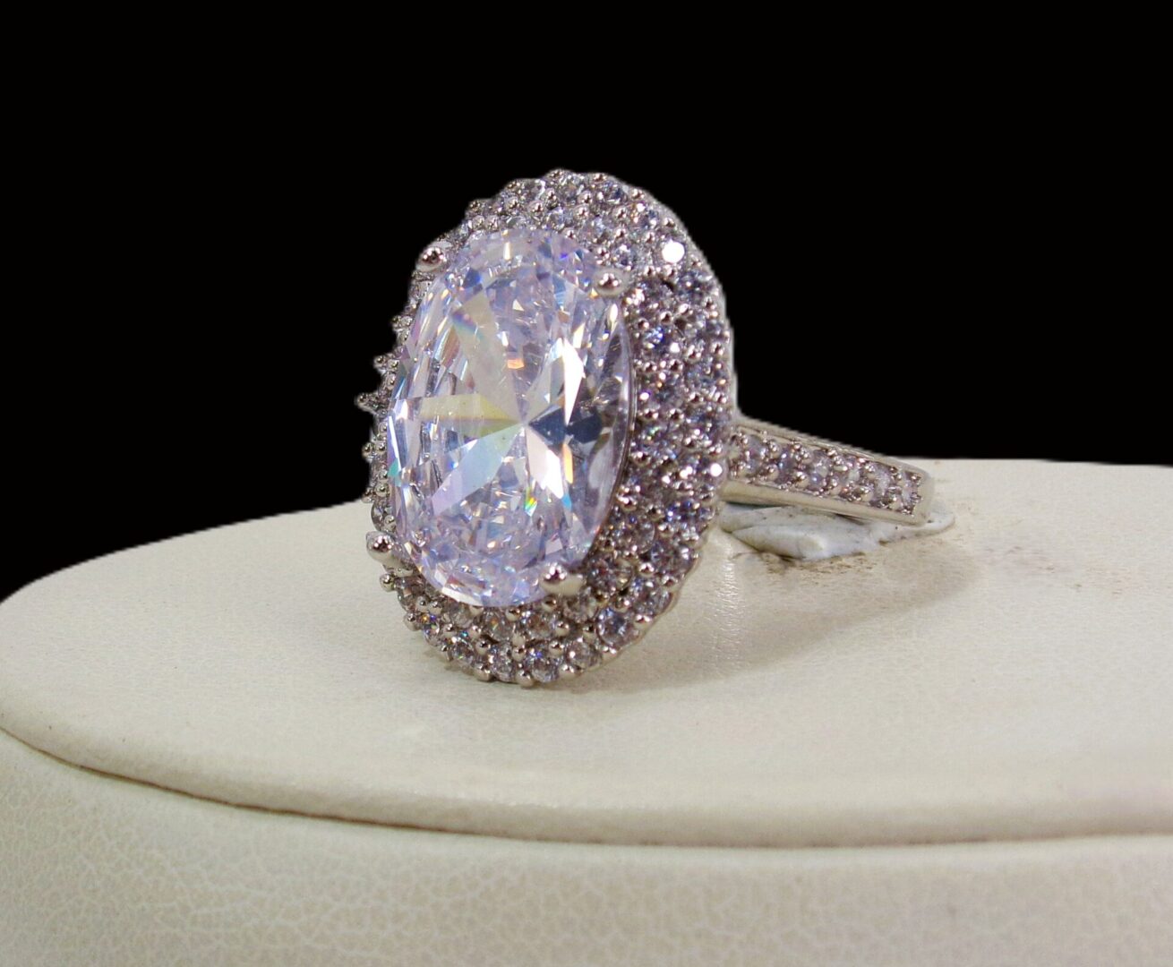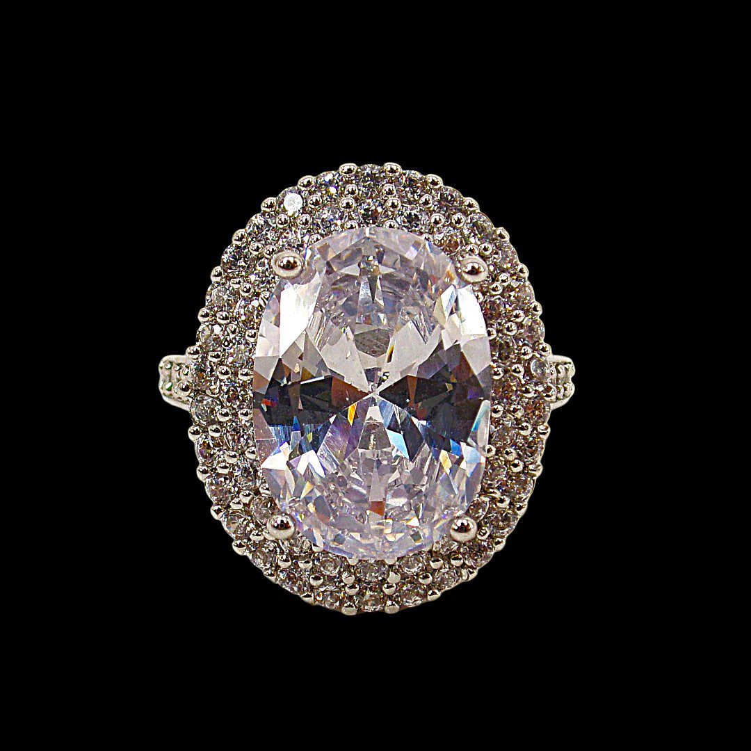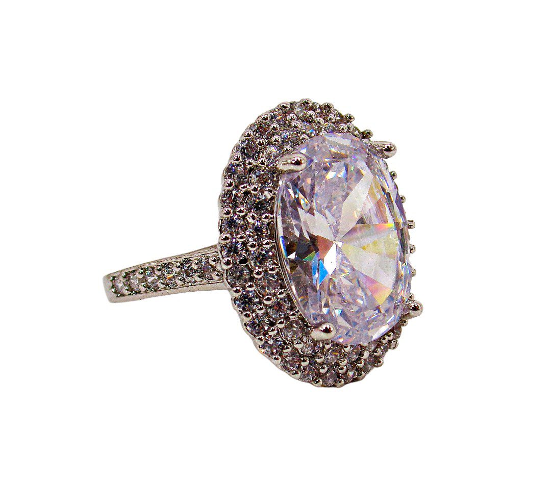 Sparkling large clear cubic zirconia statement ring. It is created with a big oval shape cubic zirconia stone and small round clear stones set all around it. A beautiful big and bold look of real ring that works with any outfit.