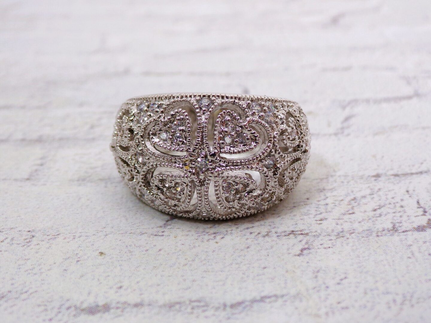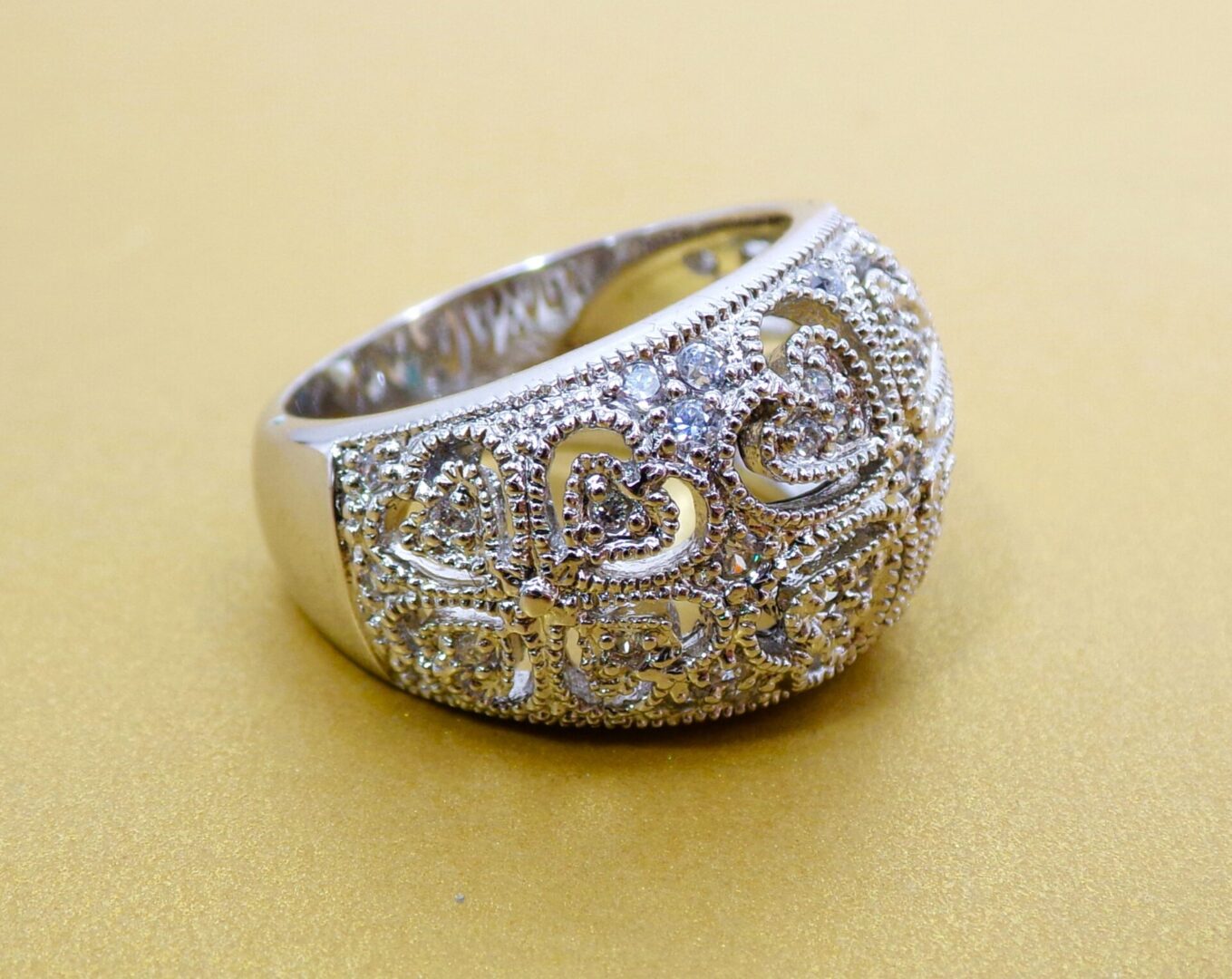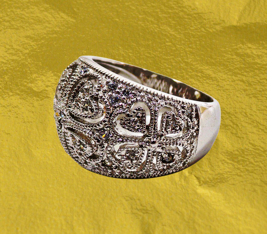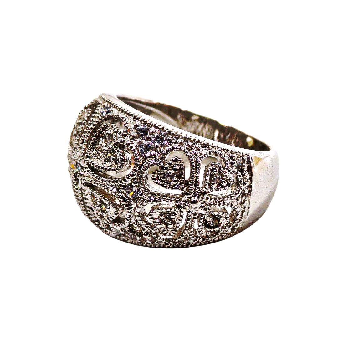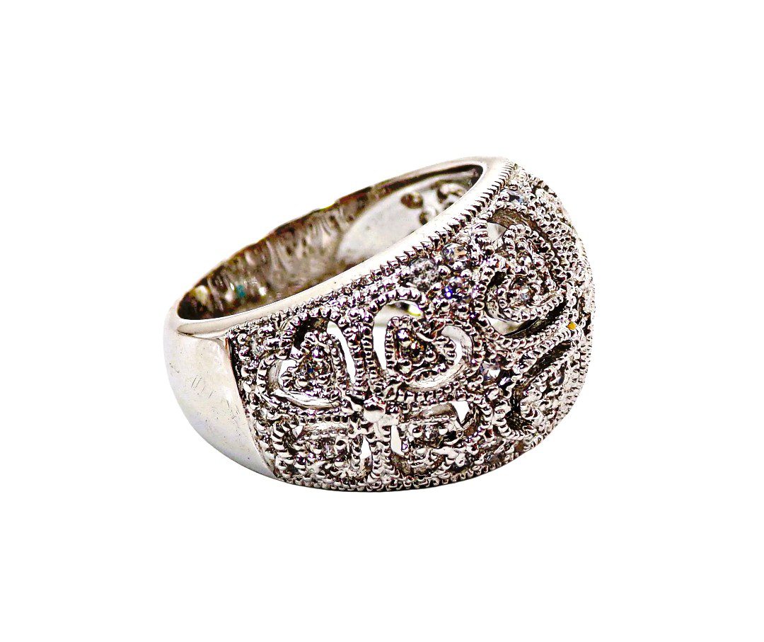 Clear cubic zirconia band ring designed with heart cut outs all around it. The ring is dome shape with small round clear cubic zirconia stones set into it. It’s a beautiful heart band ring that works with any outfit and for any occasion.
