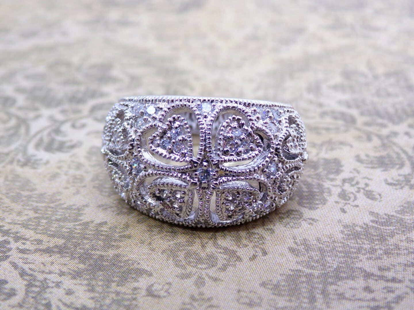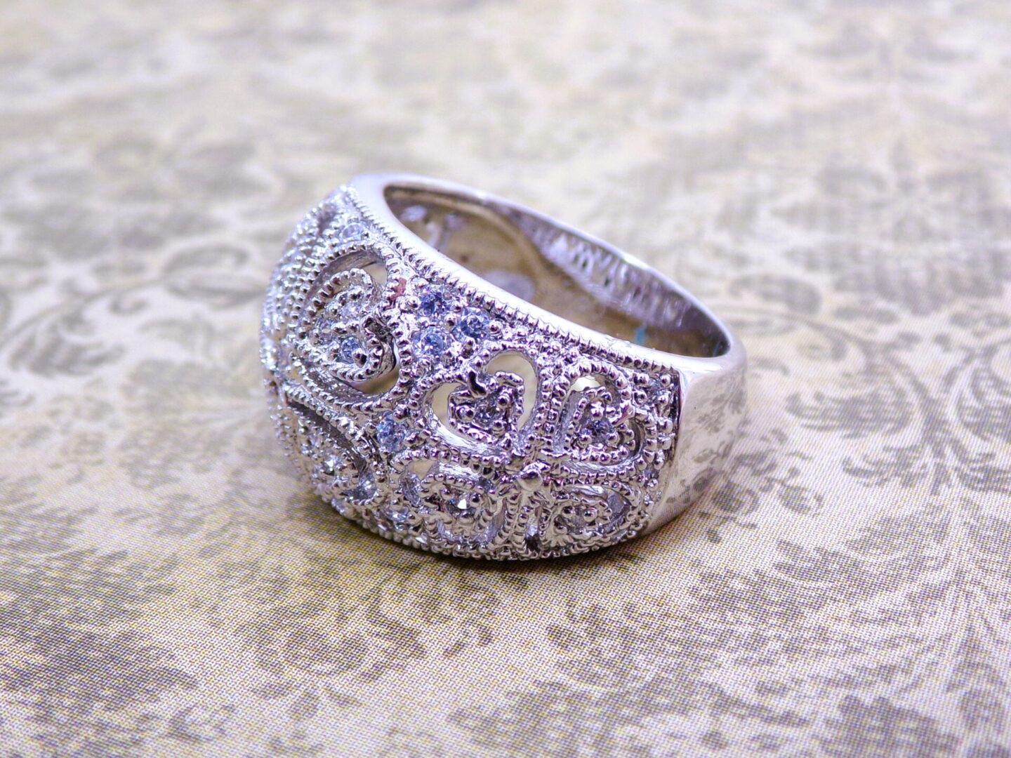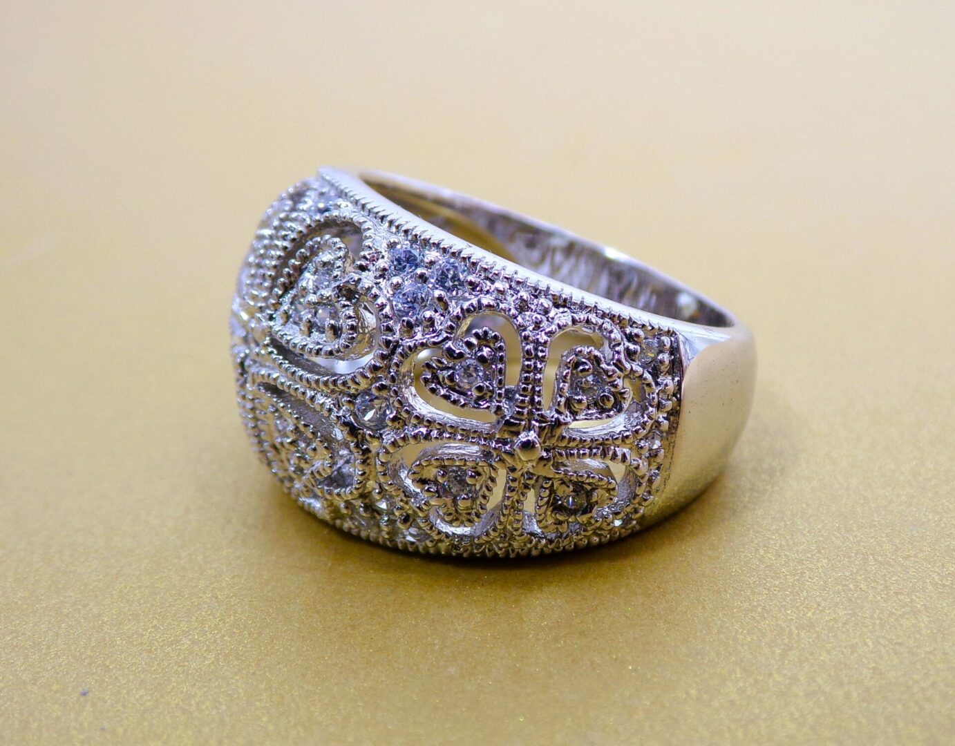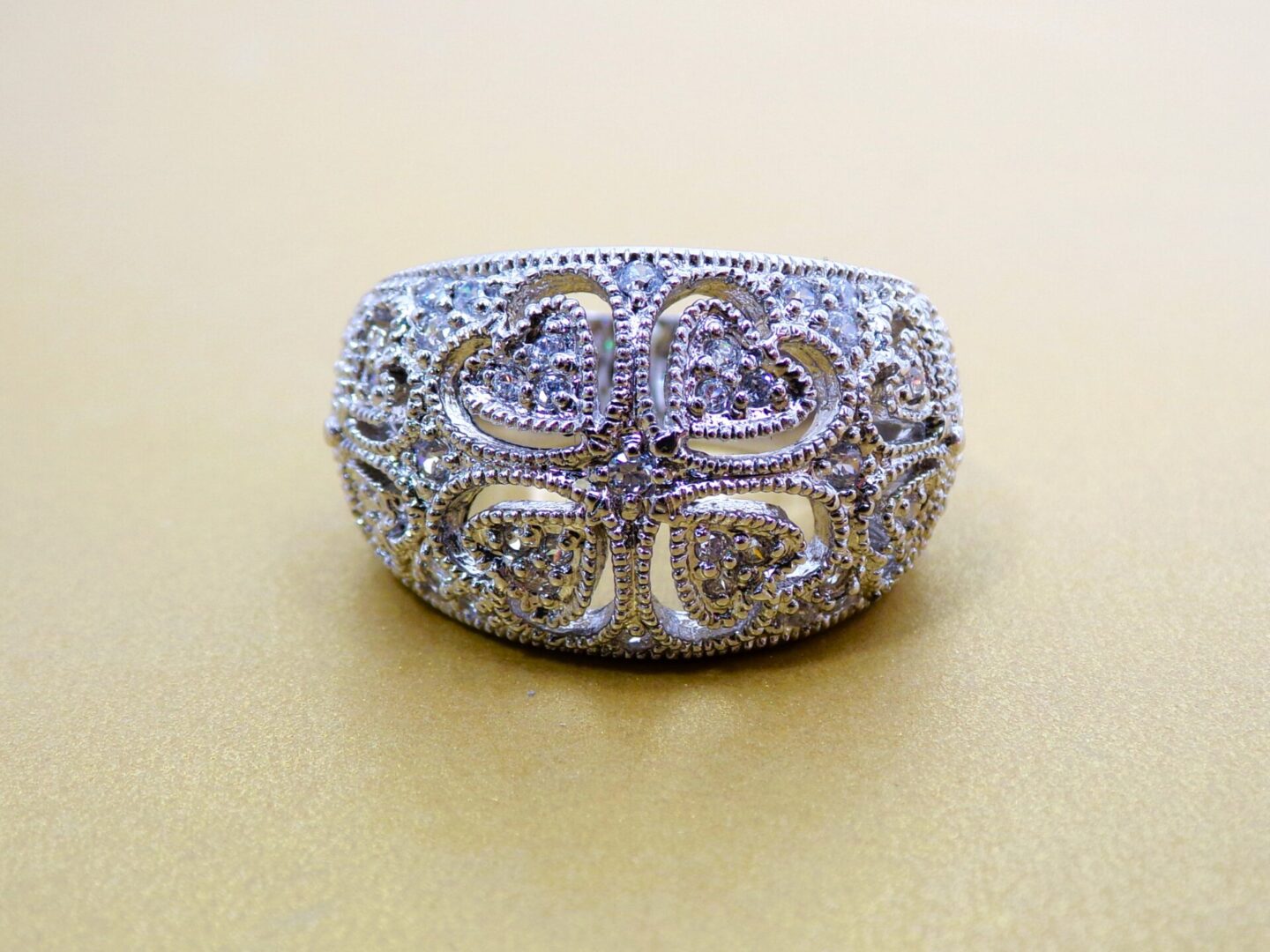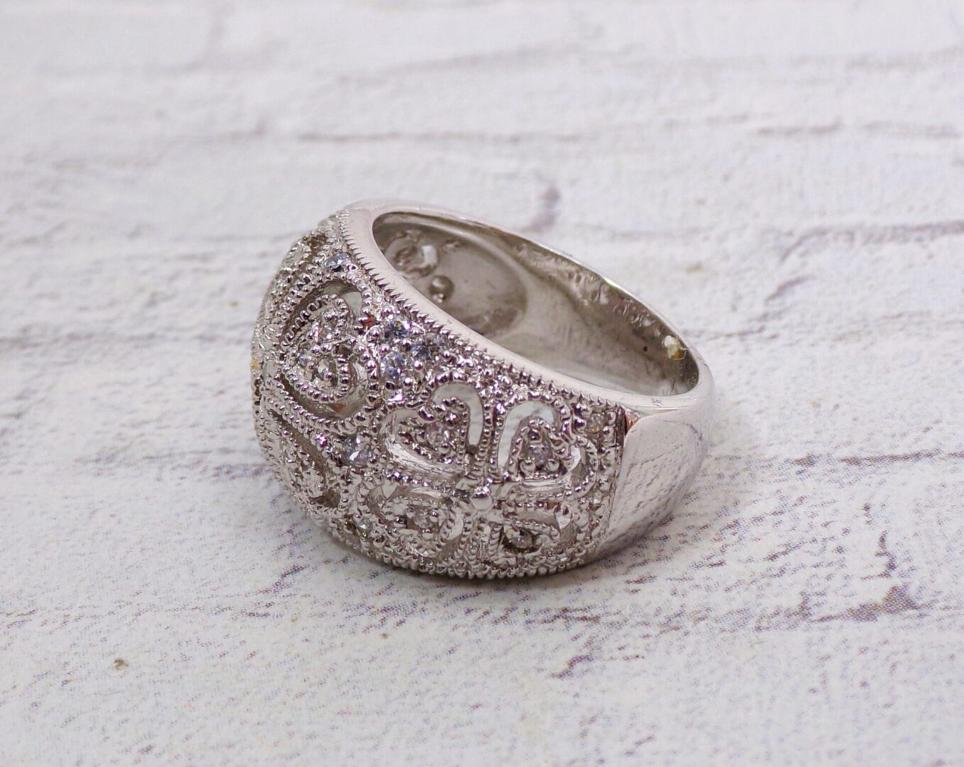Clear cubic zirconia band ring designed with heart cut outs all around it. The ring is dome shape with small round clear cubic zirconia stones set into it. It’s a beautiful heart band ring that works with any outfit and for any occasion.