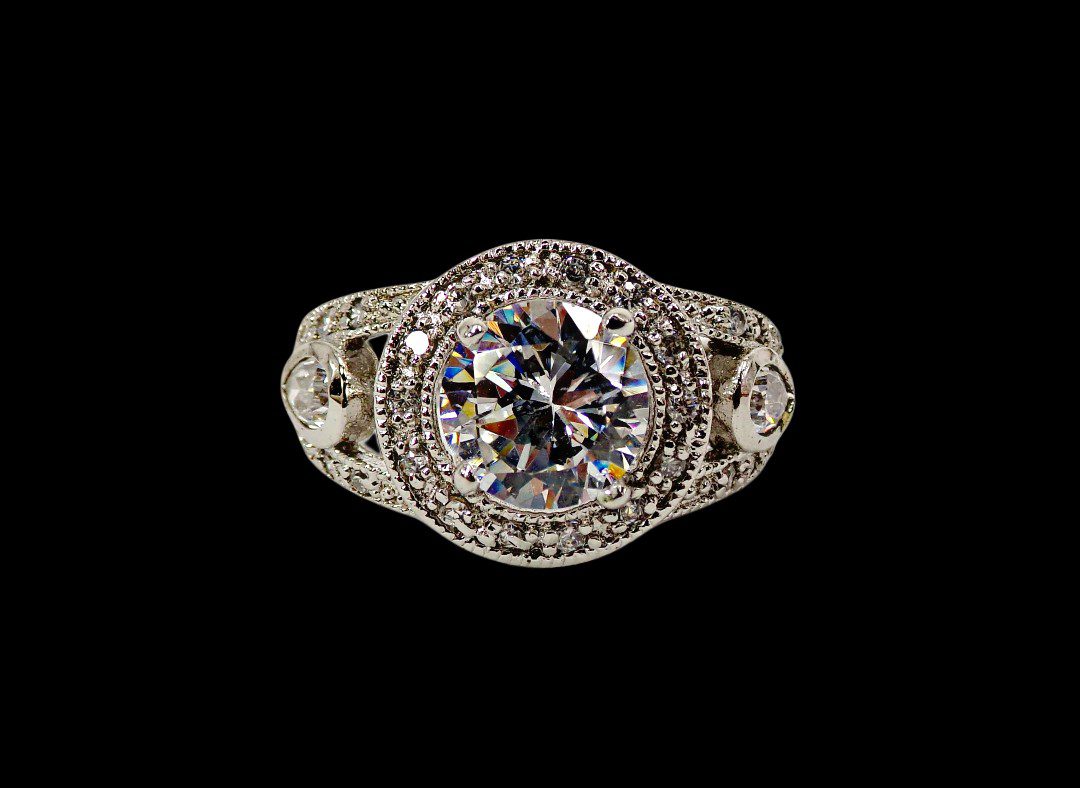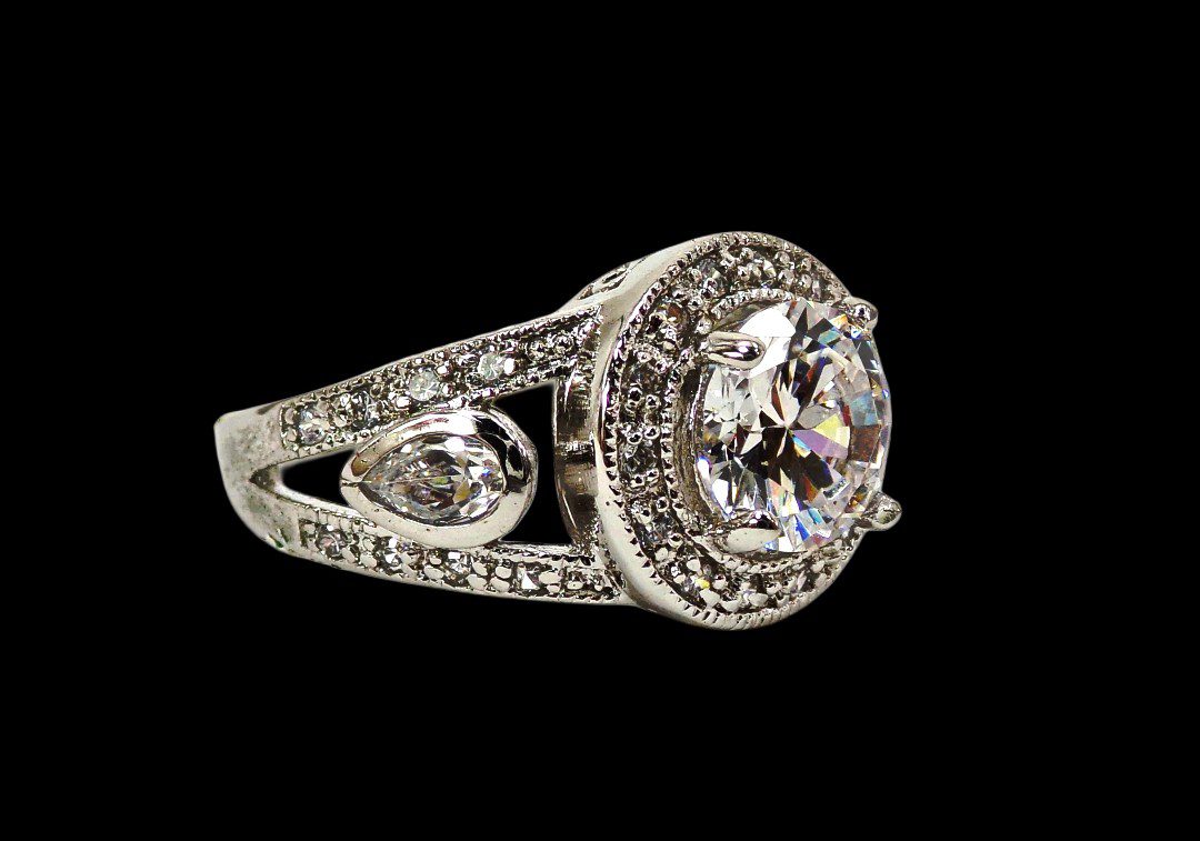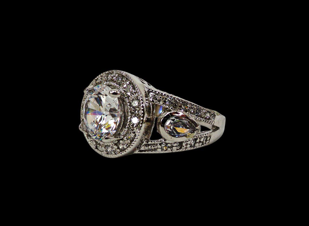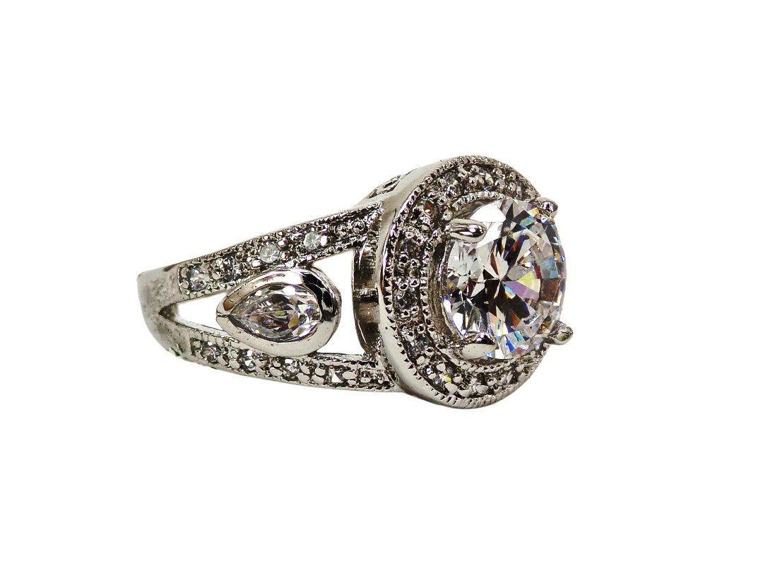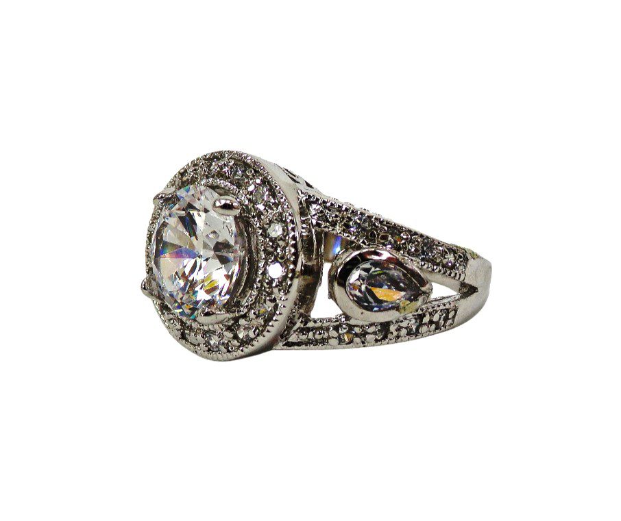 Elegant clear cubic zirconia ring. It is created with a round shape cubic zirconia stone in the center and small prong set clear stones all around it and on the sides of the band. The sides of the band are designed with an opening and a teardrop shape stone set into it. It’s a beautiful and timeless cubic zirconia stone ring that enhances any outfit and perfect for any occasion.