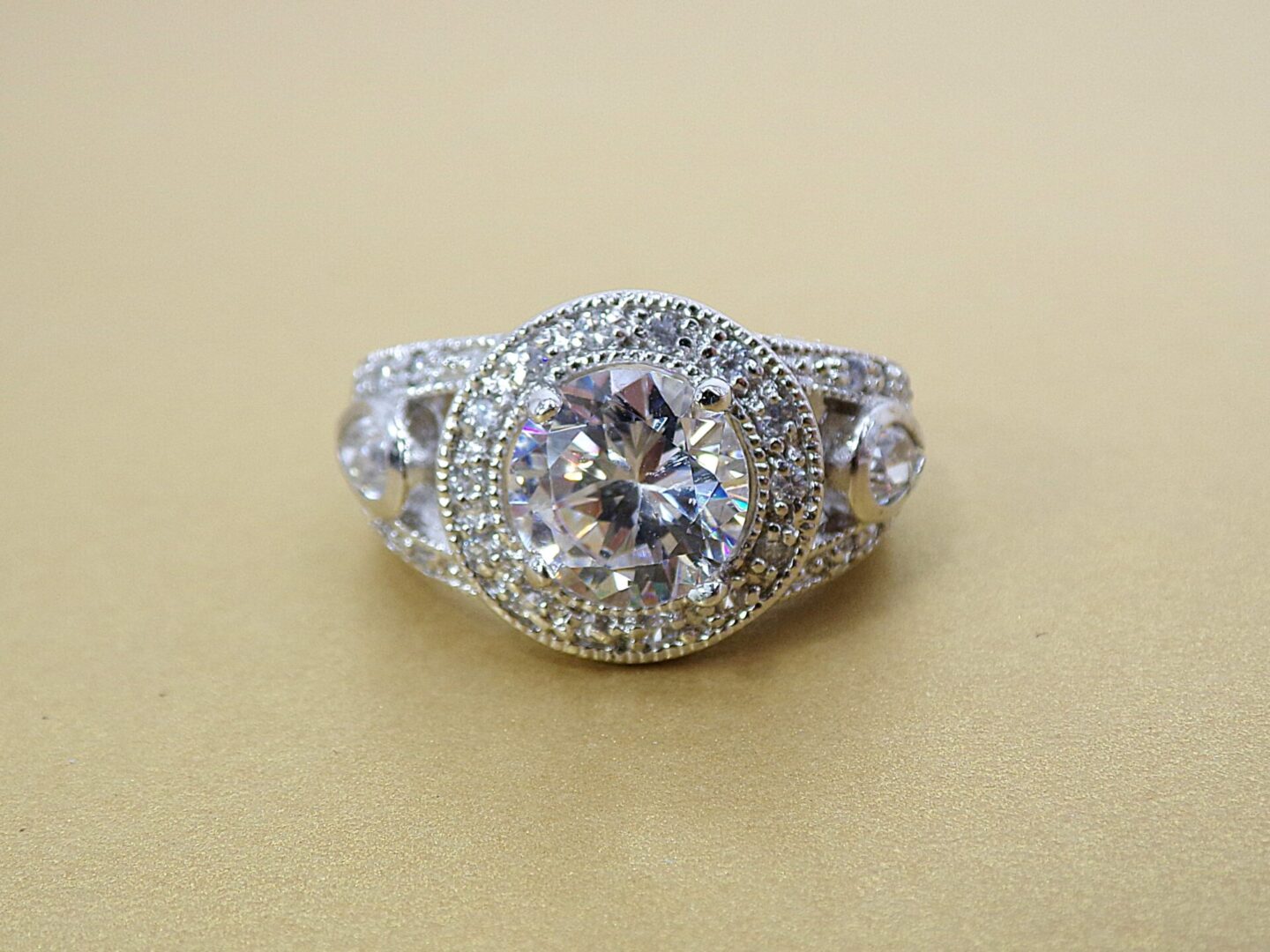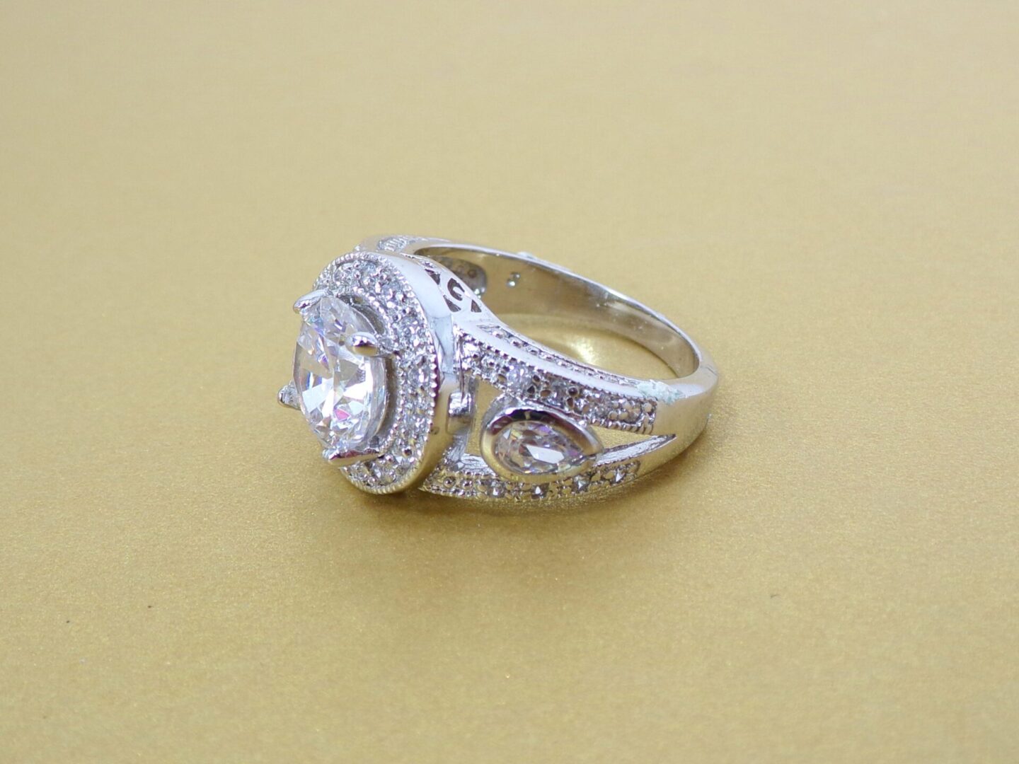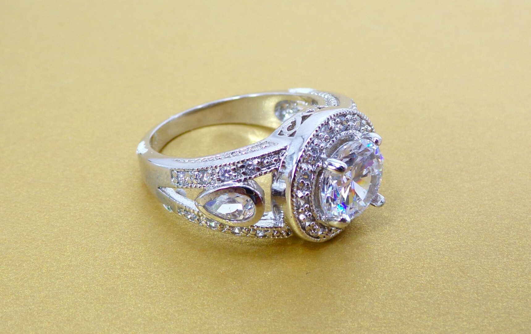 Elegant clear cubic zirconia ring. It is created with a round shape cubic zirconia stone in the center and small prong set clear stones all around it and on the sides of the band. The sides of the band are designed with an opening and a teardrop shape stone set into it. It’s a beautiful and timeless cubic zirconia stone ring that enhances any outfit and perfect for any occasion.
