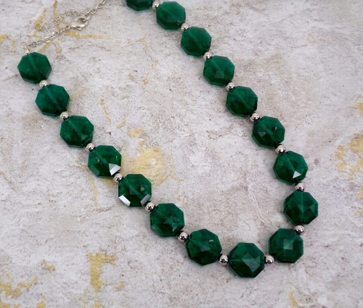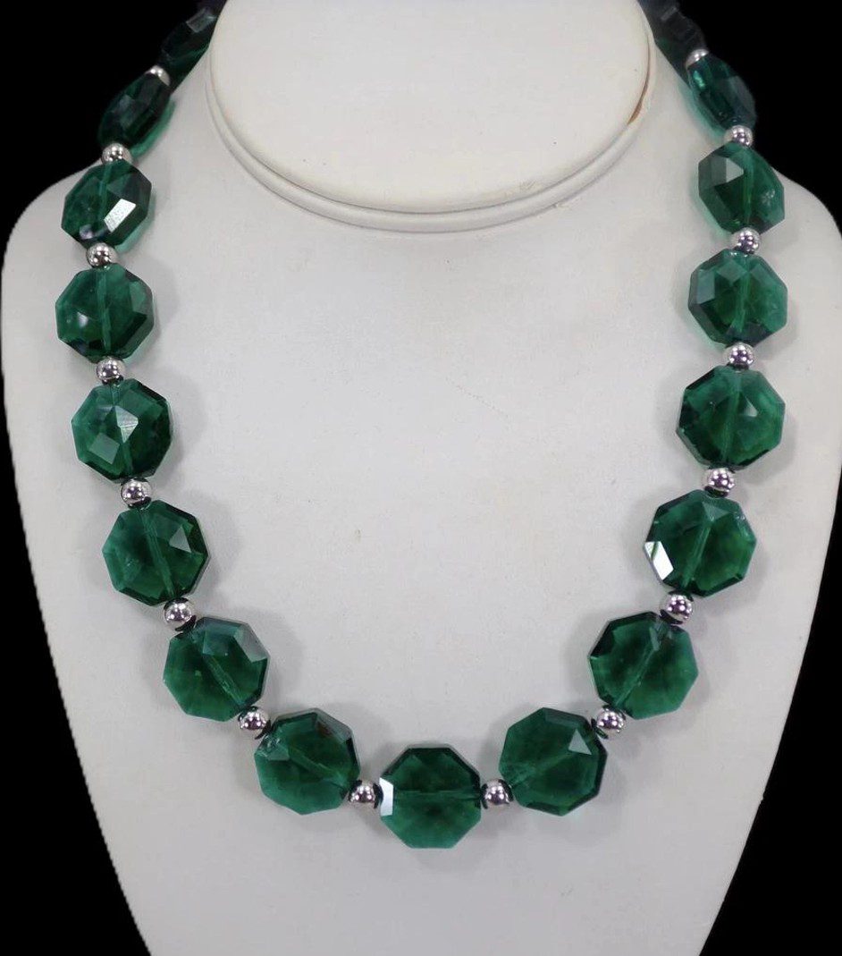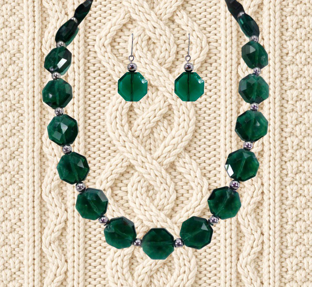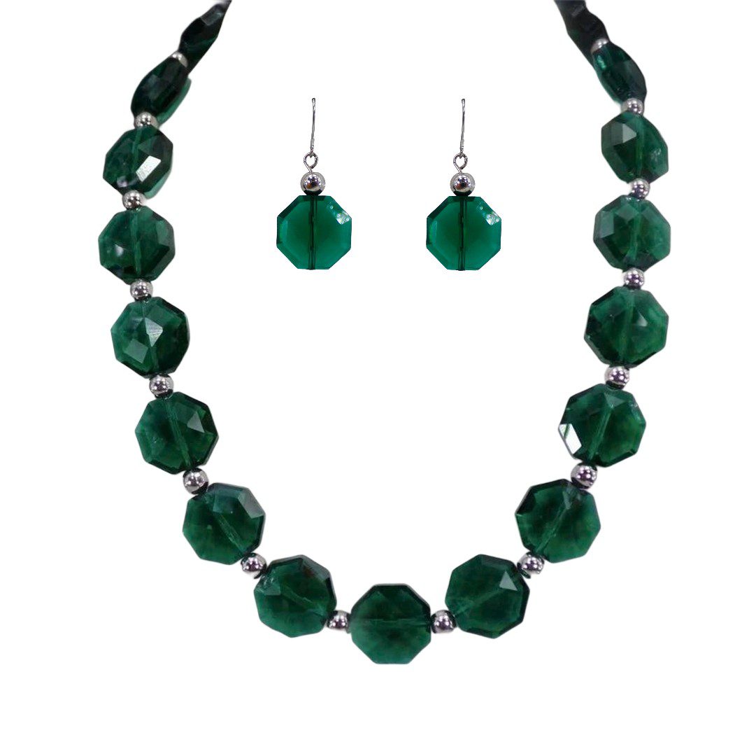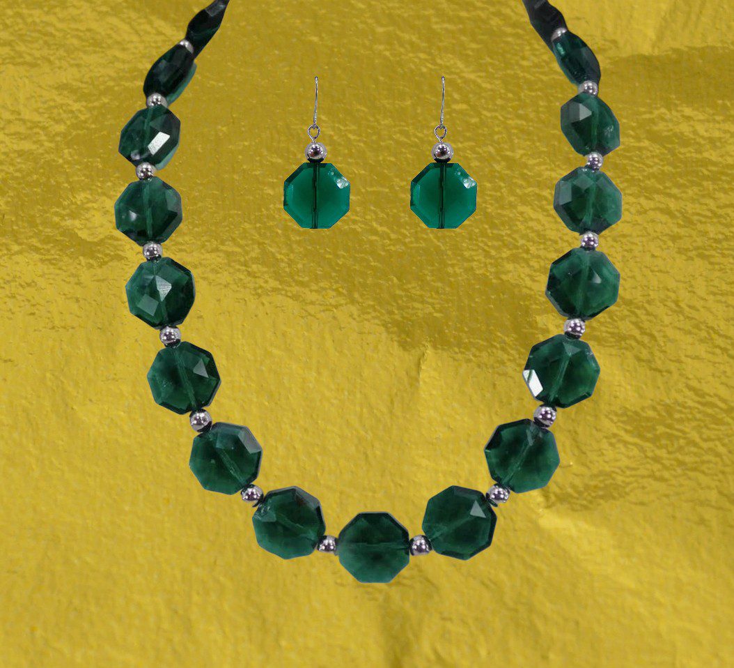 Elegant all emerald green color glass beaded necklace and earring set. This stunning green necklace is designed with octagon shape glass beads that are facet cut and shiny silver plated round beads.