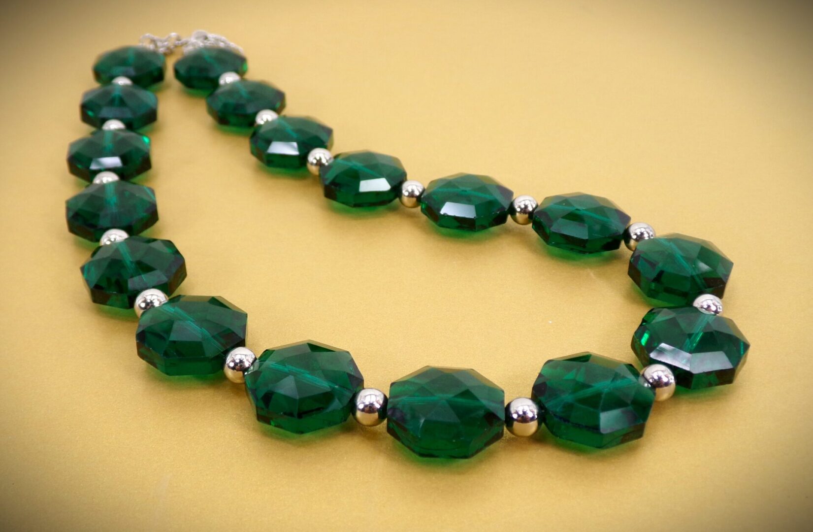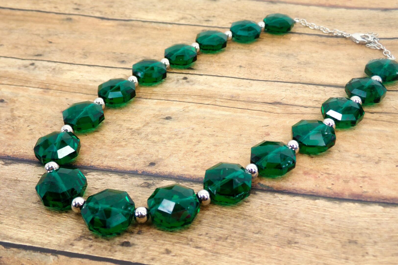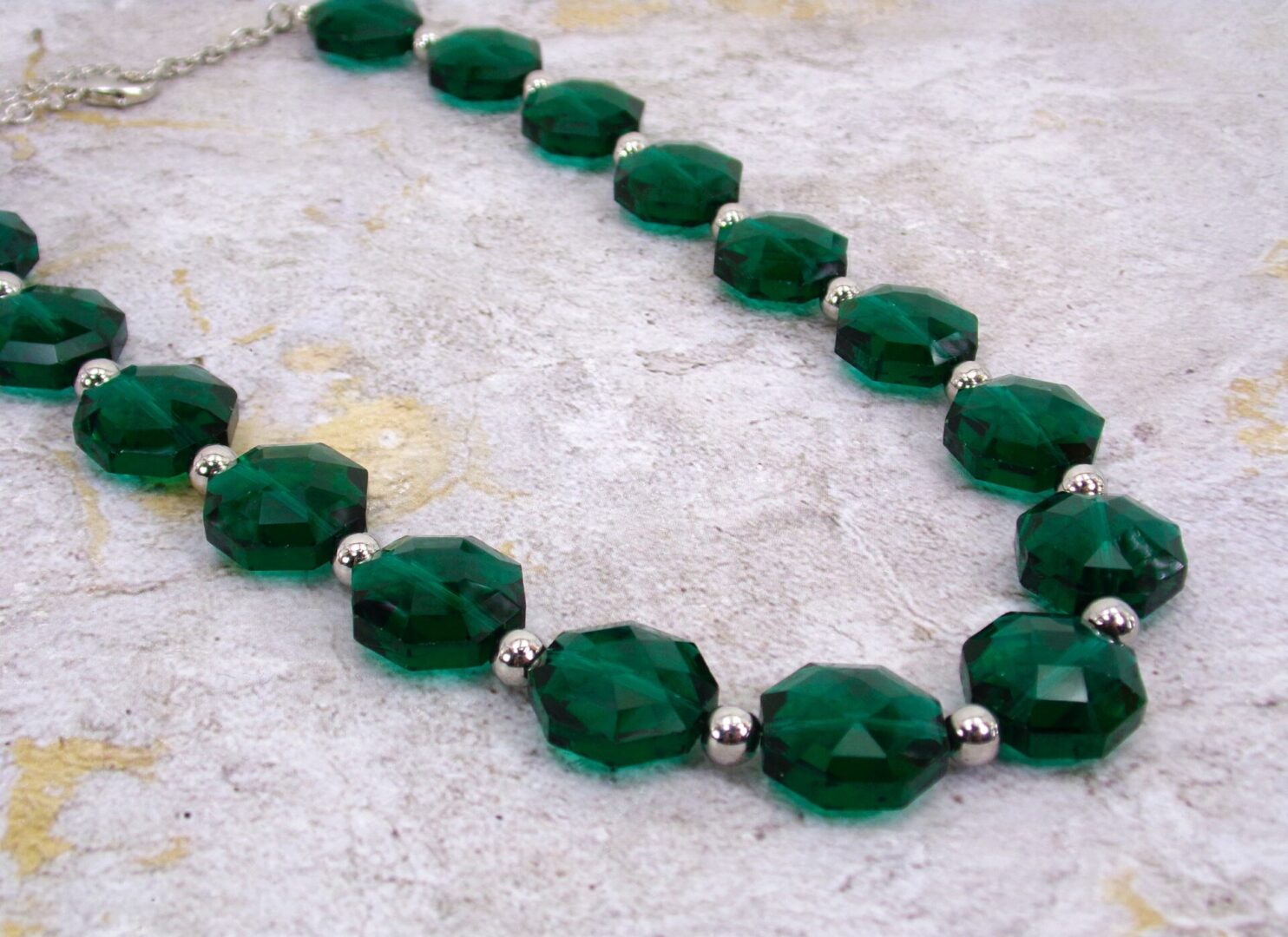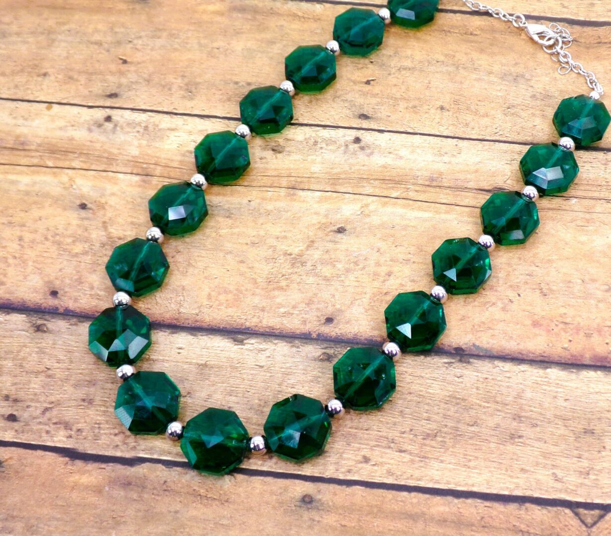 Elegant all emerald green color glass beaded necklace and earring set. This stunning green necklace is designed with octagon shape glass beads that are facet cut and shiny silver plated round beads.