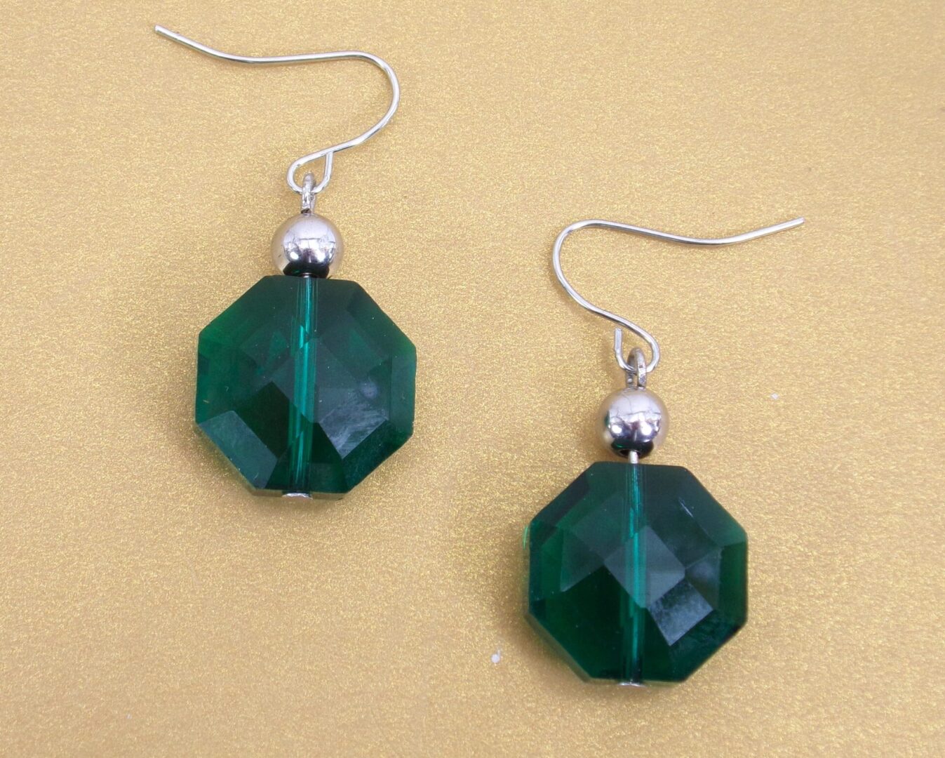 The earrings complement the set with octagon shape and silver round beads.