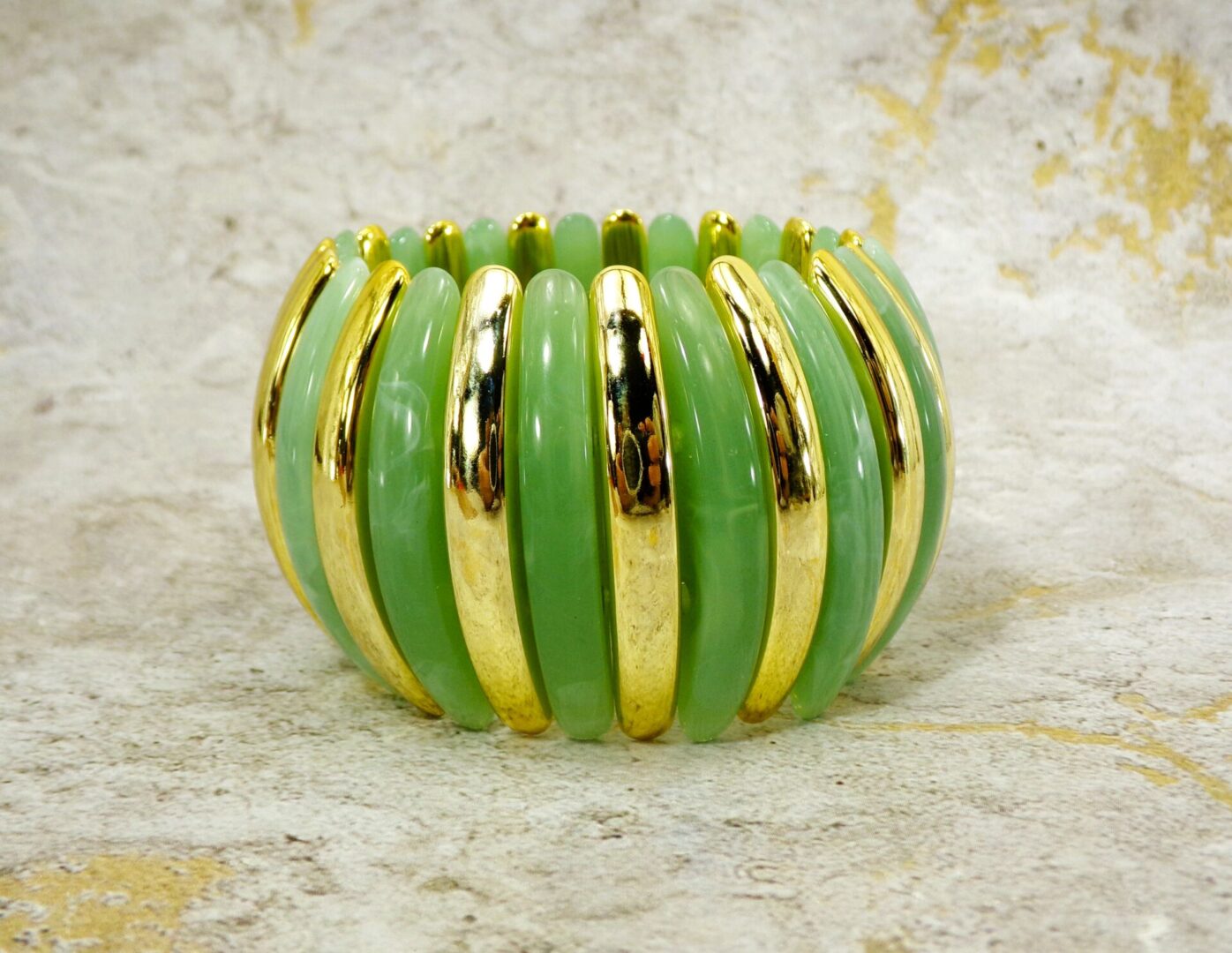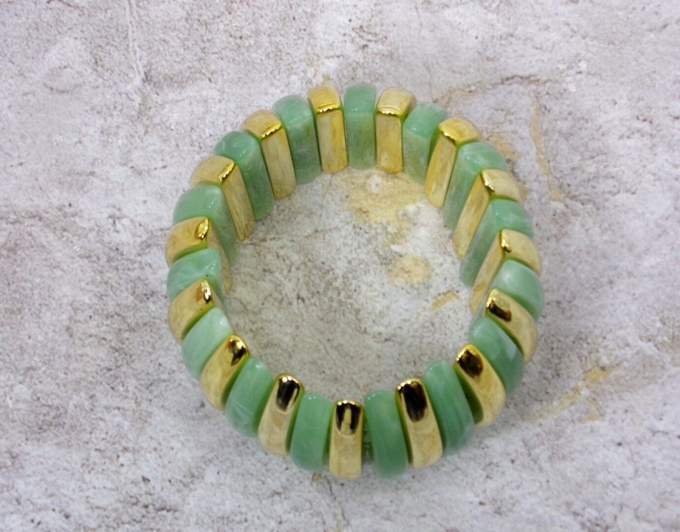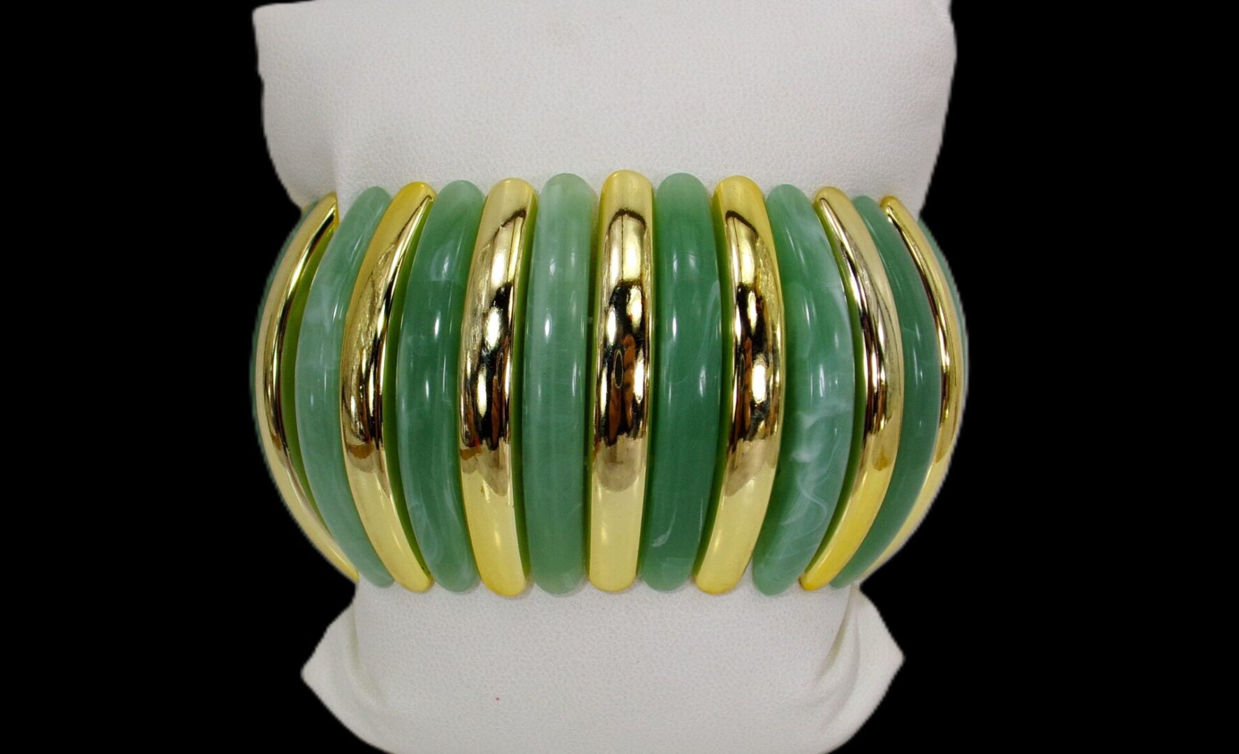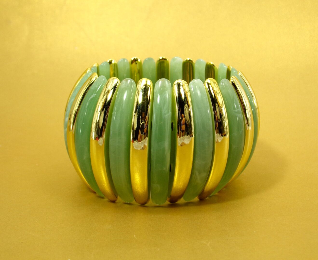 Large green and gold stretch statement bracelet. It is made with large long green and gold acrylic bead sections that are strung together by hand with two rows of stretch cord. Each bead is in green with slight white swirls in it to give the look of marble alternating with shiny gold beads. It’s light weight to wear on your wrist and a beautiful pop of color. It’s a nice accent color with any outfit and for any occasion.
