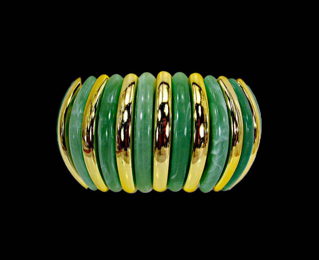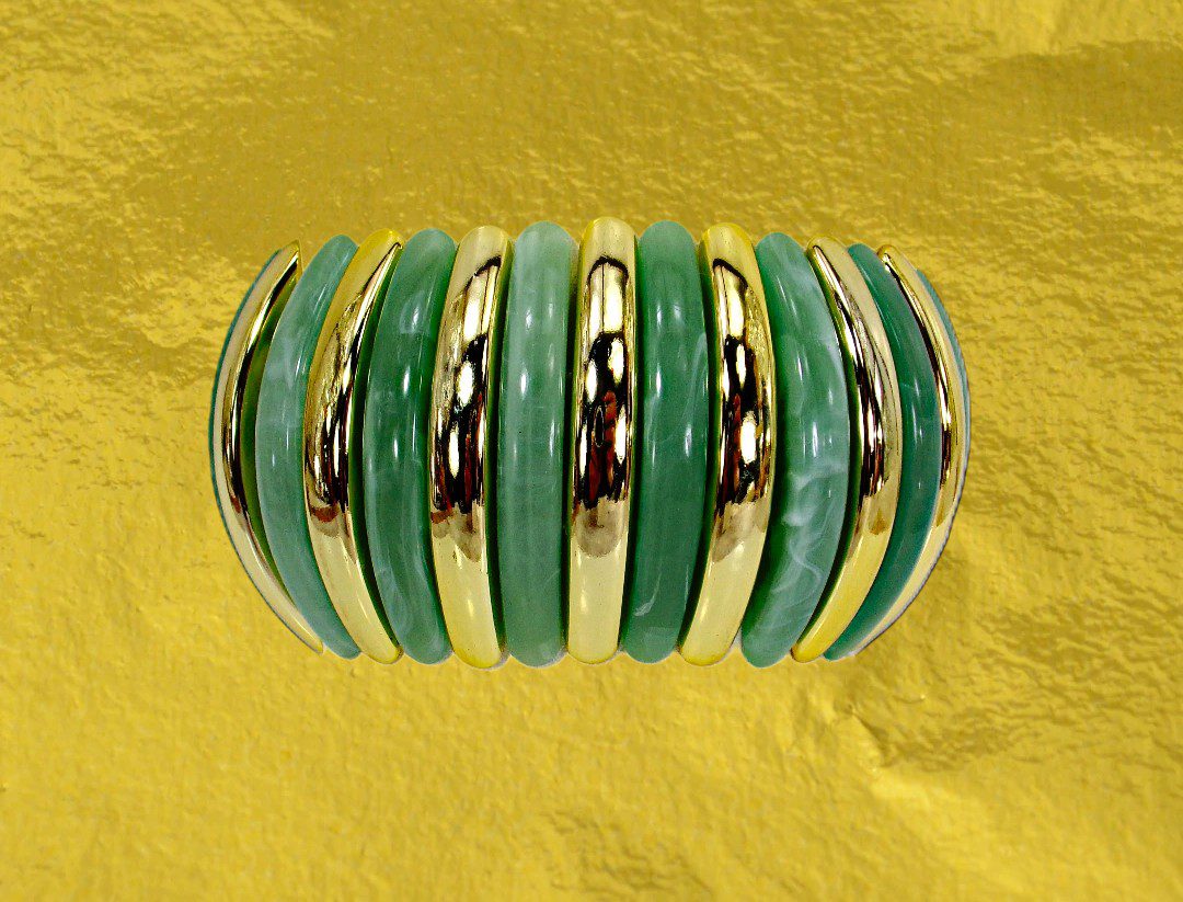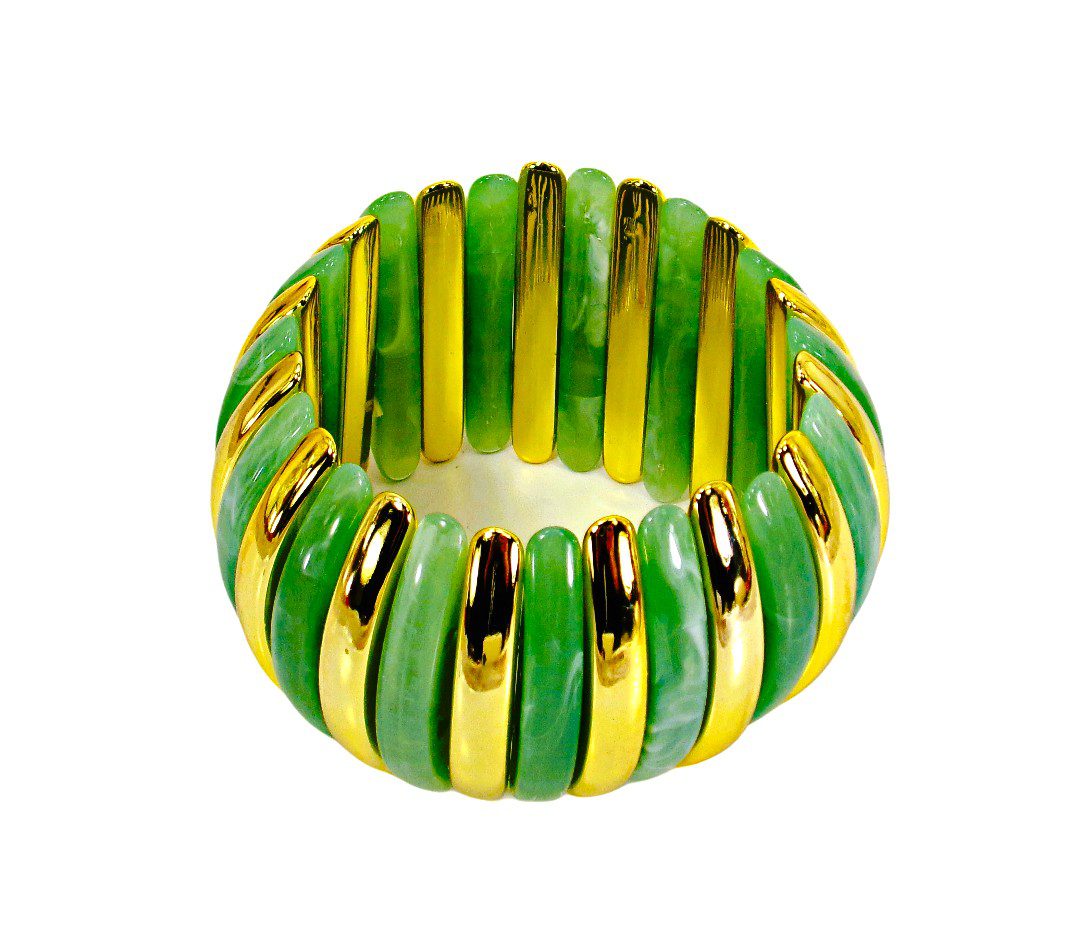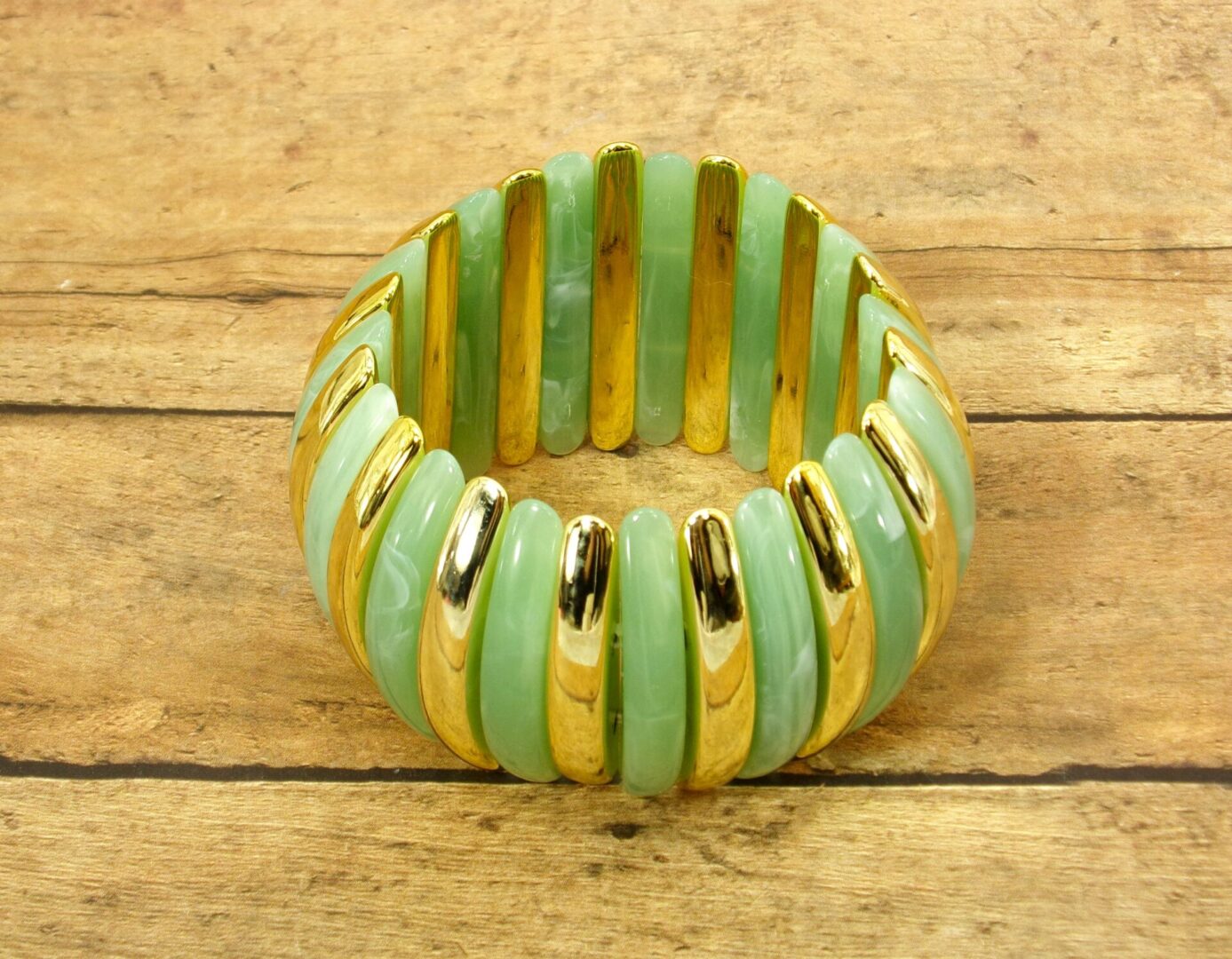 Large green and gold stretch statement bracelet. It is made with large long green and gold acrylic bead sections that are strung together by hand with two rows of stretch cord. Each bead is in green with slight white swirls in it to give the look of marble alternating with shiny gold beads. It’s light weight to wear on your wrist and a beautiful pop of color. It’s a nice accent color with any outfit and for any occasion.