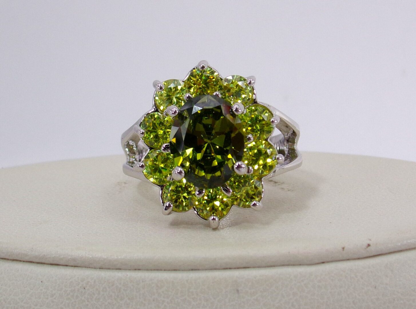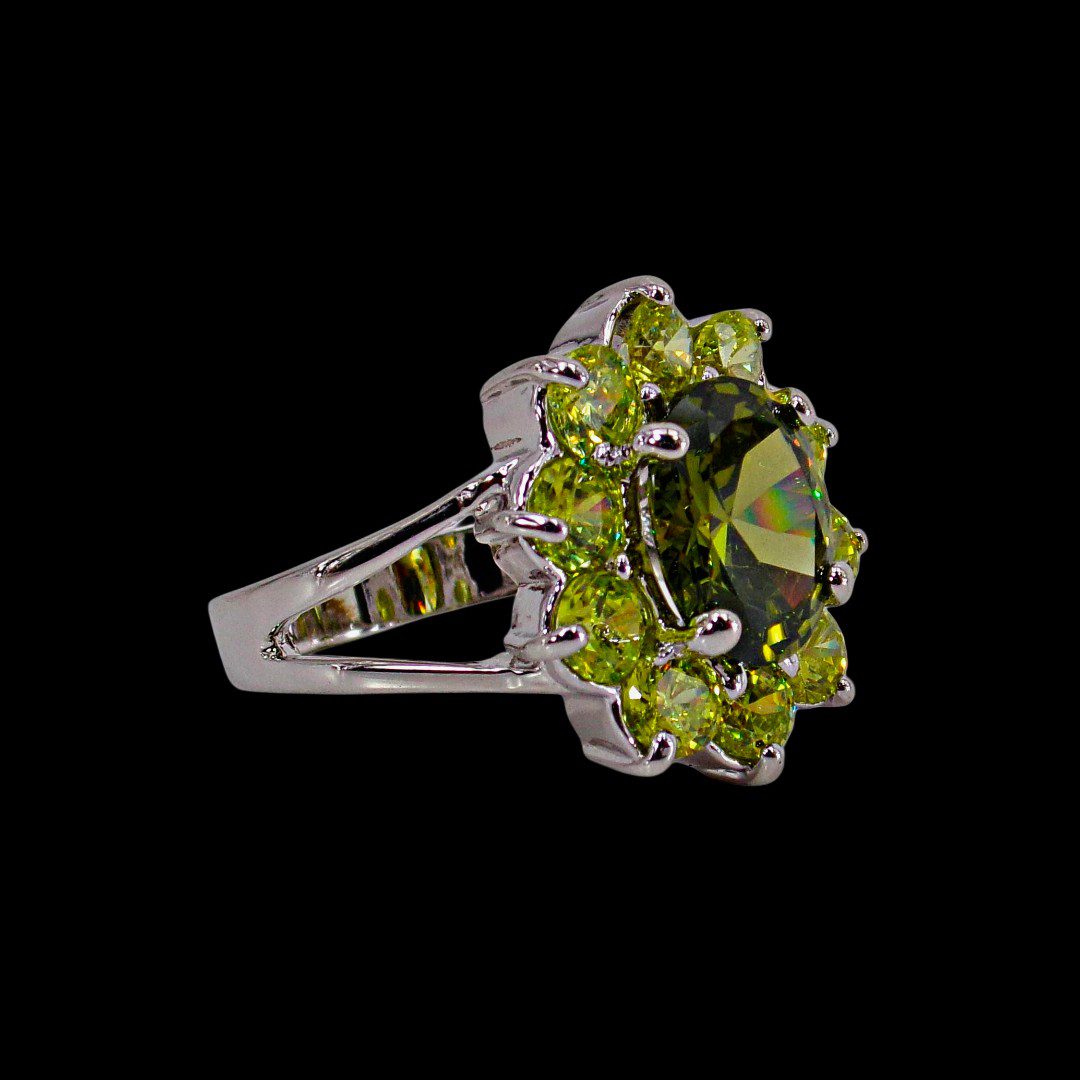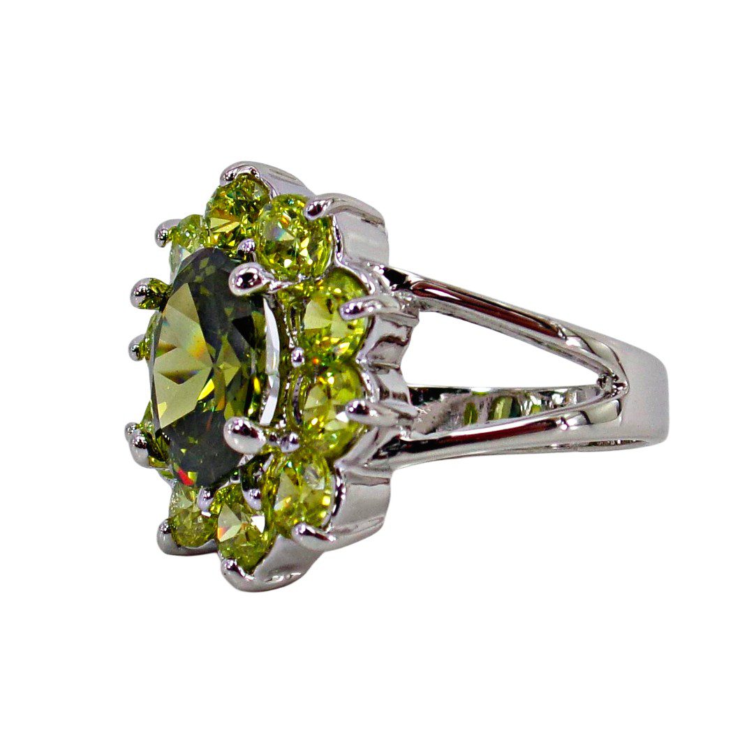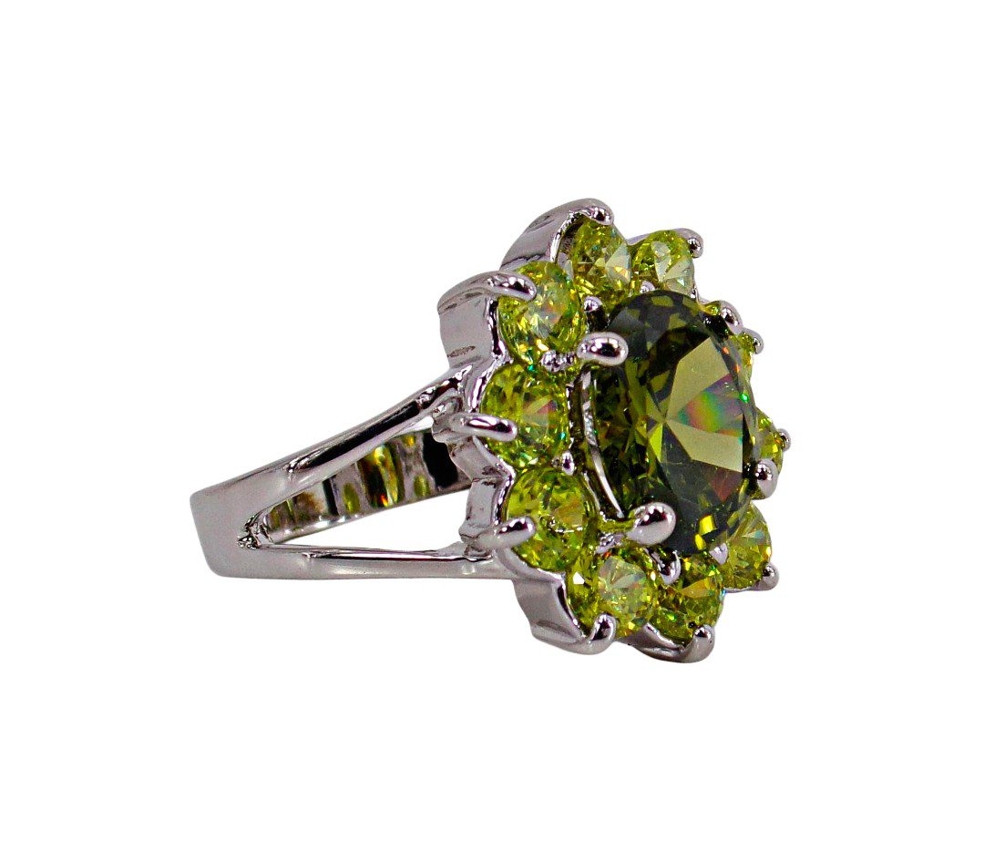 Large green cubic zirconia stone statement ring. It is created with a dark green oval shape CZ stone in the center and surrounded by all light green round shape cubic zirconia stones. A beautiful mix of light and dark green color that is perfect for any occasion.