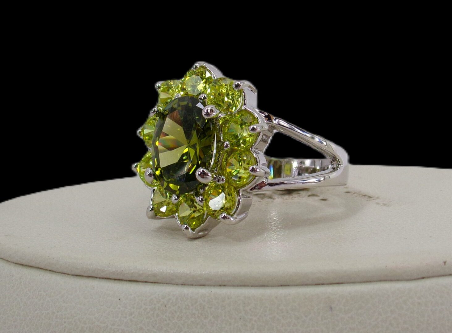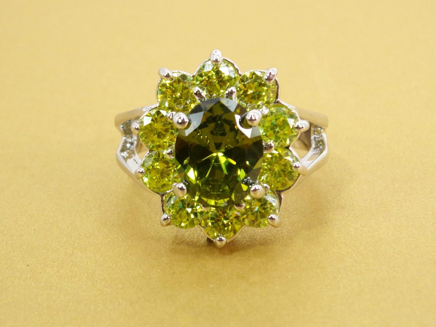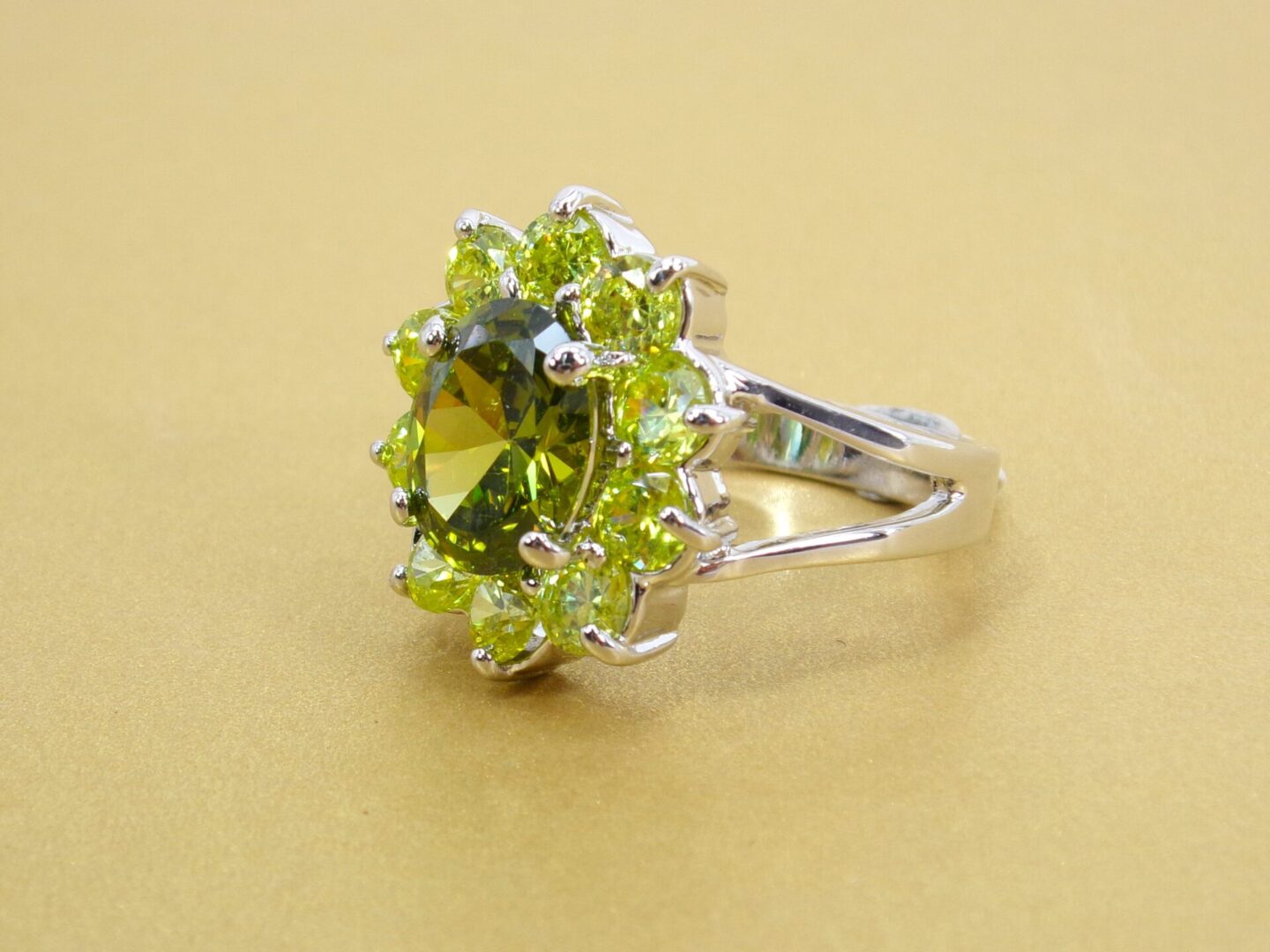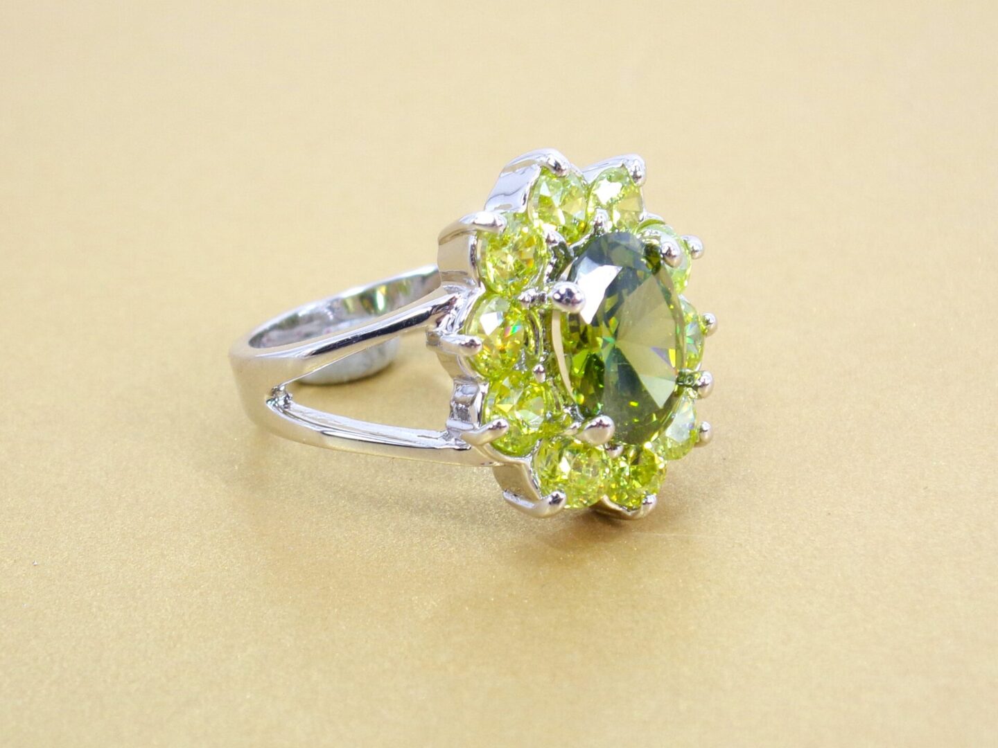 Large green cubic zirconia stone statement ring. It is created with a dark green oval shape CZ stone in the center and surrounded by all light green round shape cubic zirconia stones. A beautiful mix of light and dark green color that is perfect for any occasion.