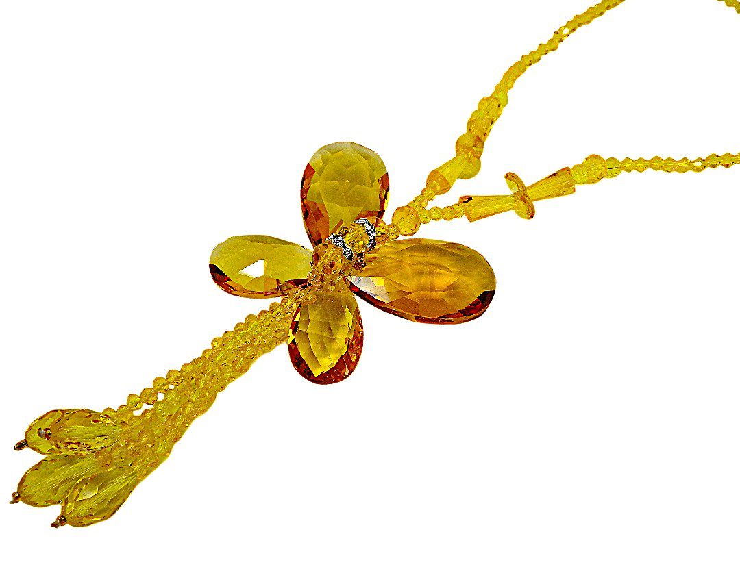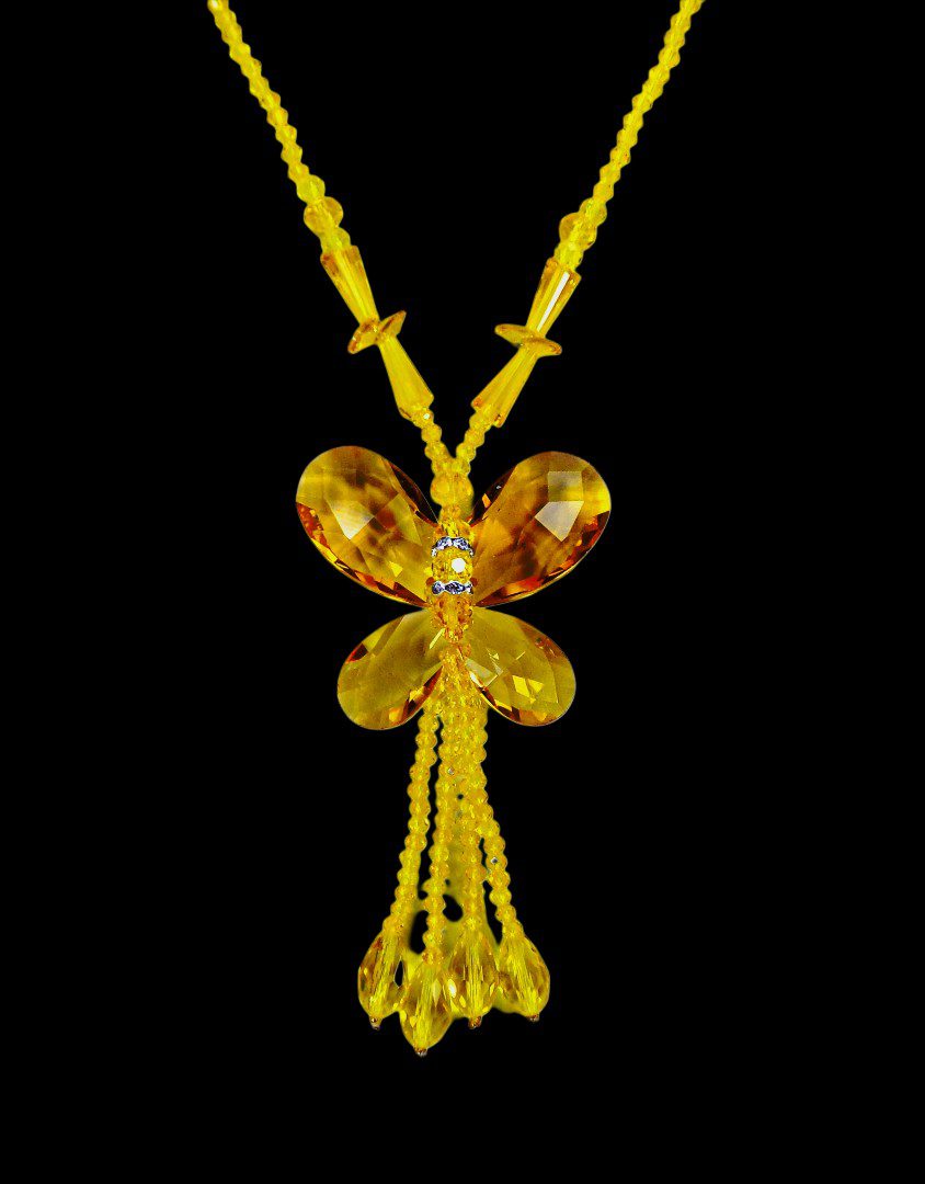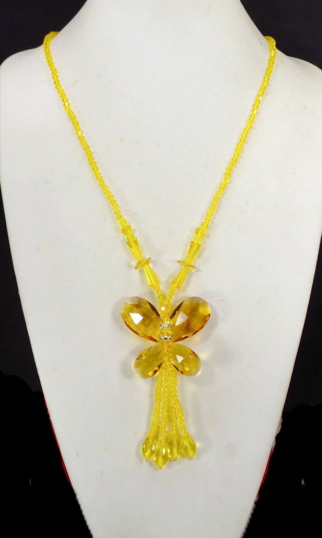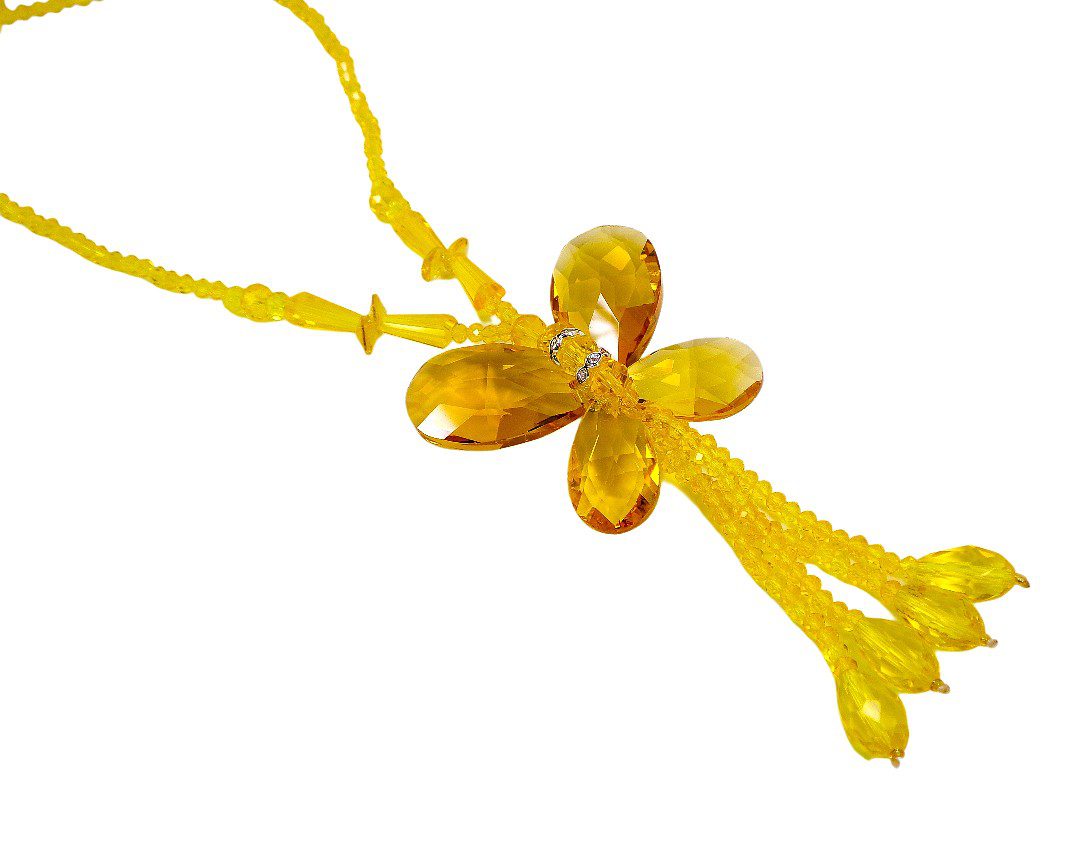 Make a bold and artistic statement with this stunning yellow glass beaded butterfly necklace for women. Designed to stand out, this large butterfly pendant is handcrafted using faceted teardrop glass beads and crystal spacer accents, all carefully hand wired together to create dimension and brilliance.