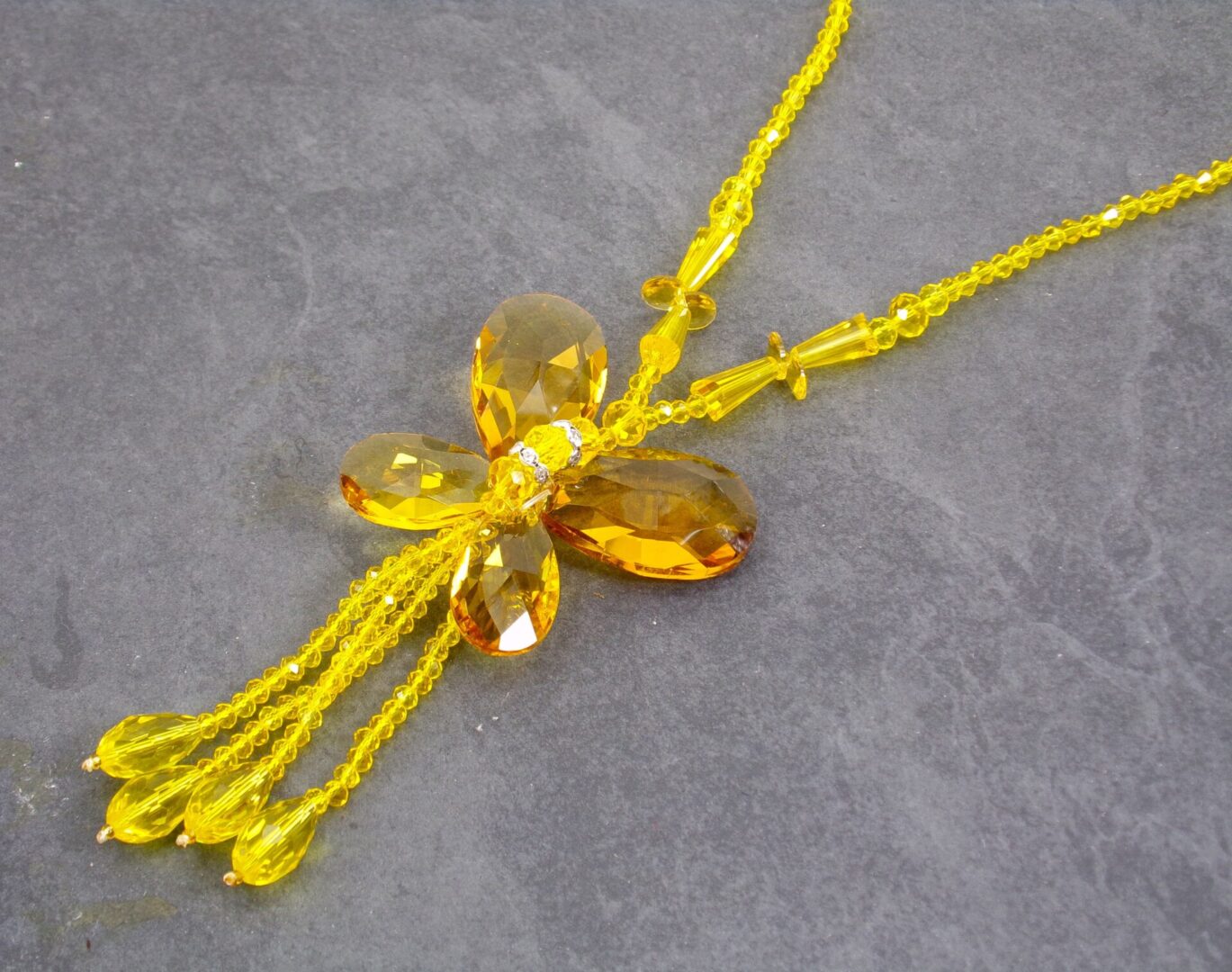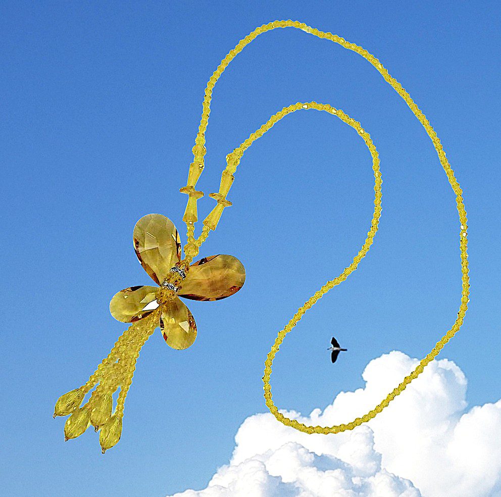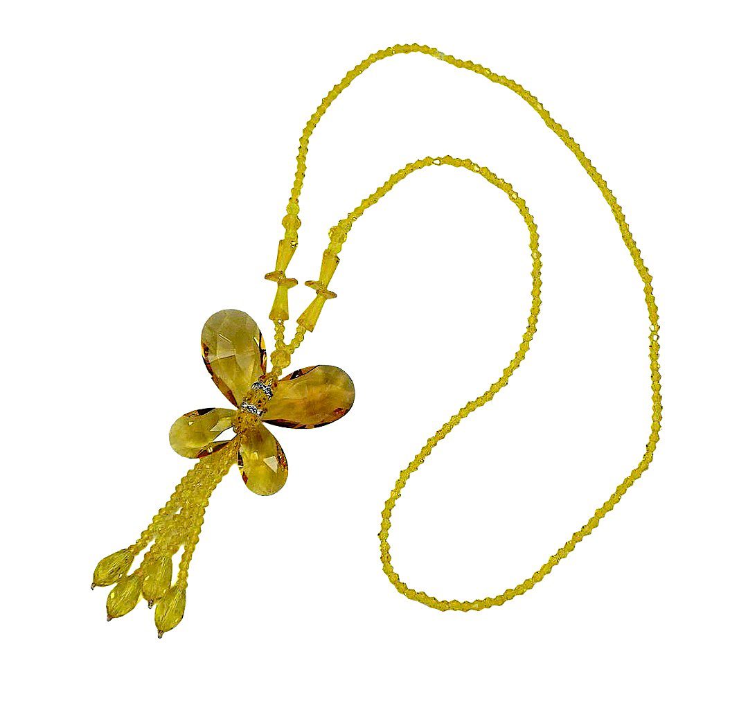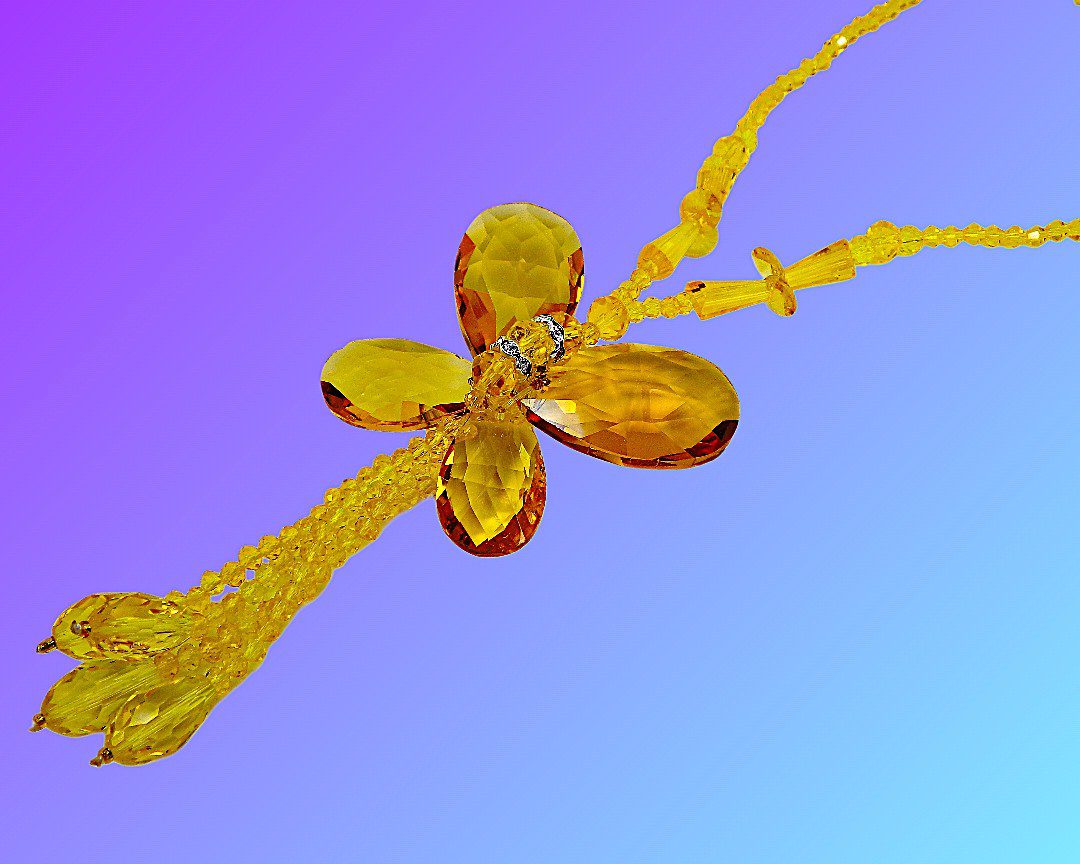 Make a bold and artistic statement with this stunning yellow glass beaded butterfly necklace for women. Designed to stand out, this large butterfly pendant is handcrafted using faceted teardrop glass beads and crystal spacer accents, all carefully hand wired together to create dimension and brilliance.
