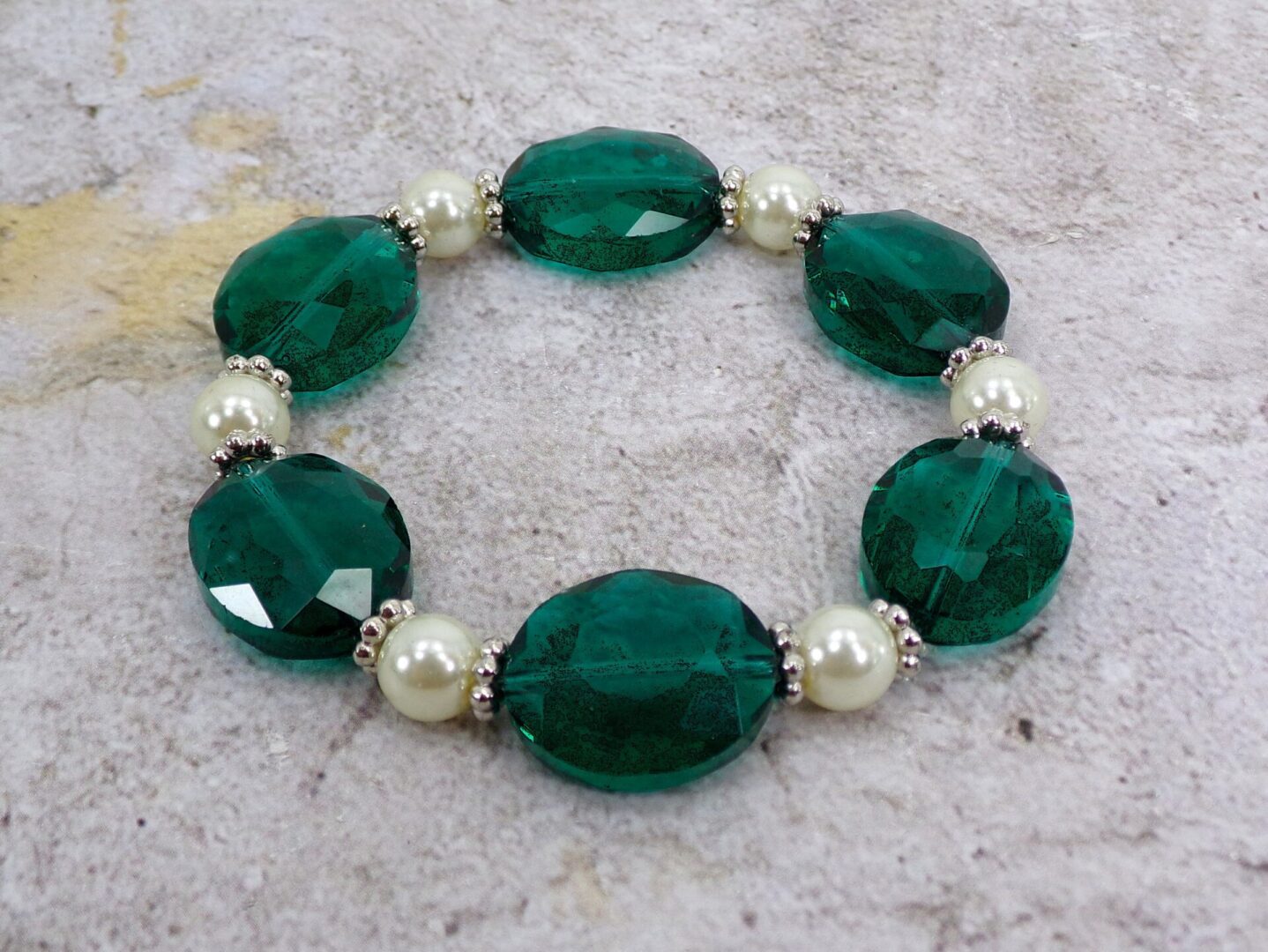 Silver plated disk beads with rhodium plating. It is created with emerald green color oval glass beads and white round glass pearl beads. Each bead is separated by small silver spacer beads. The bracelet makes beautiful accent piece with any outfit.