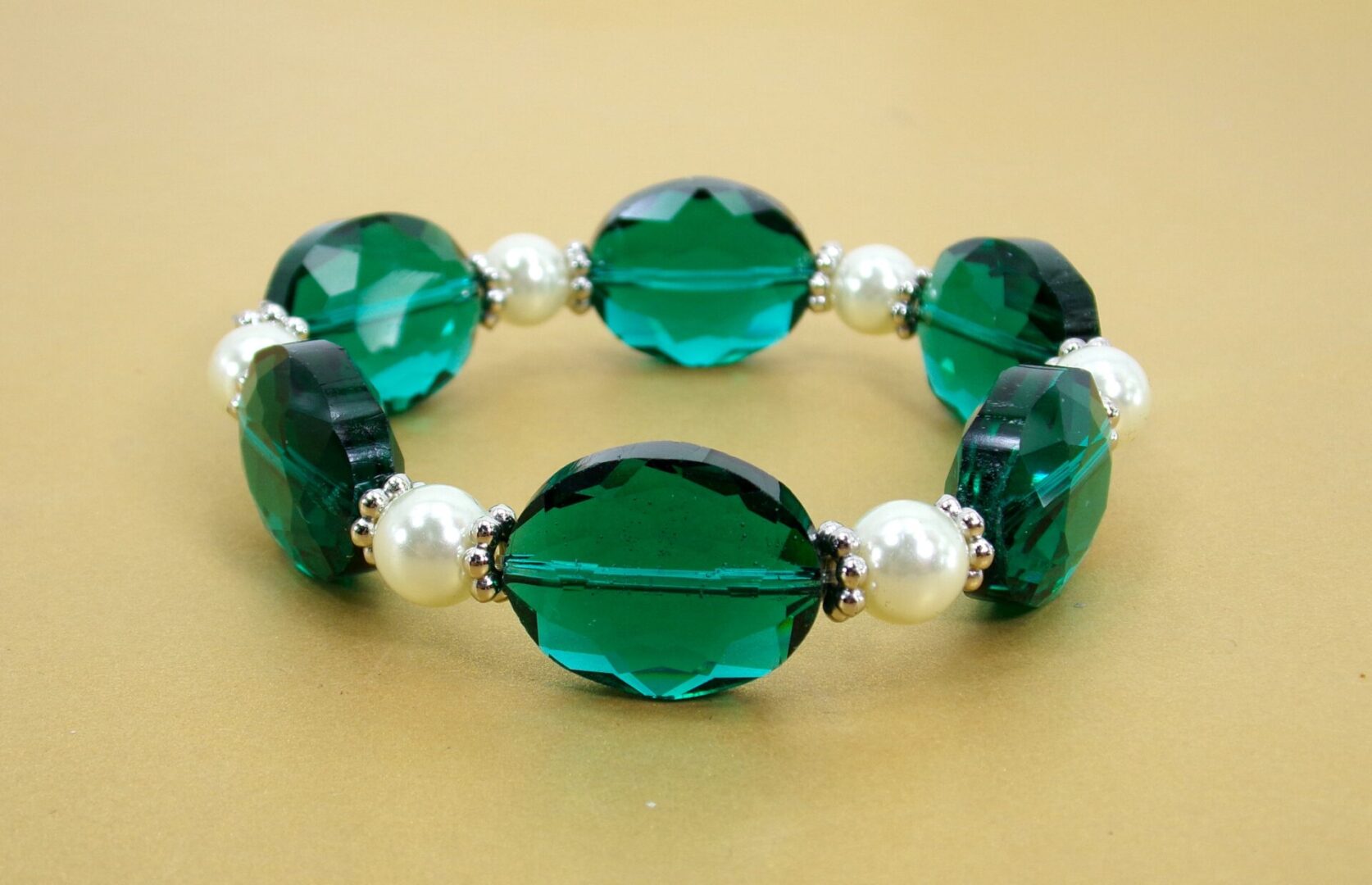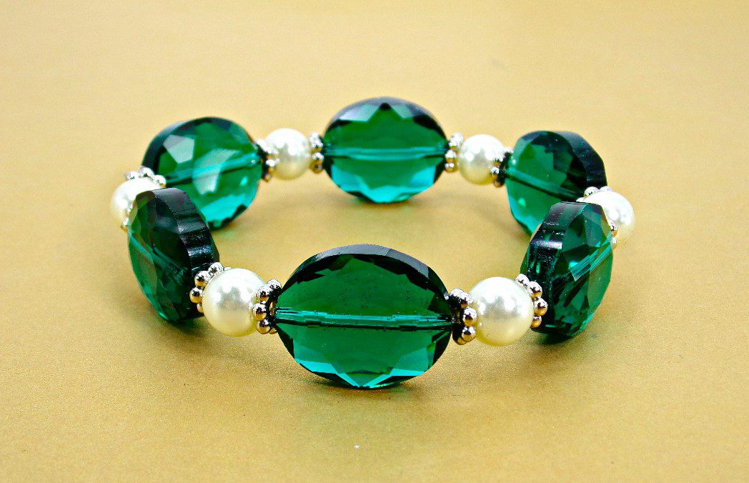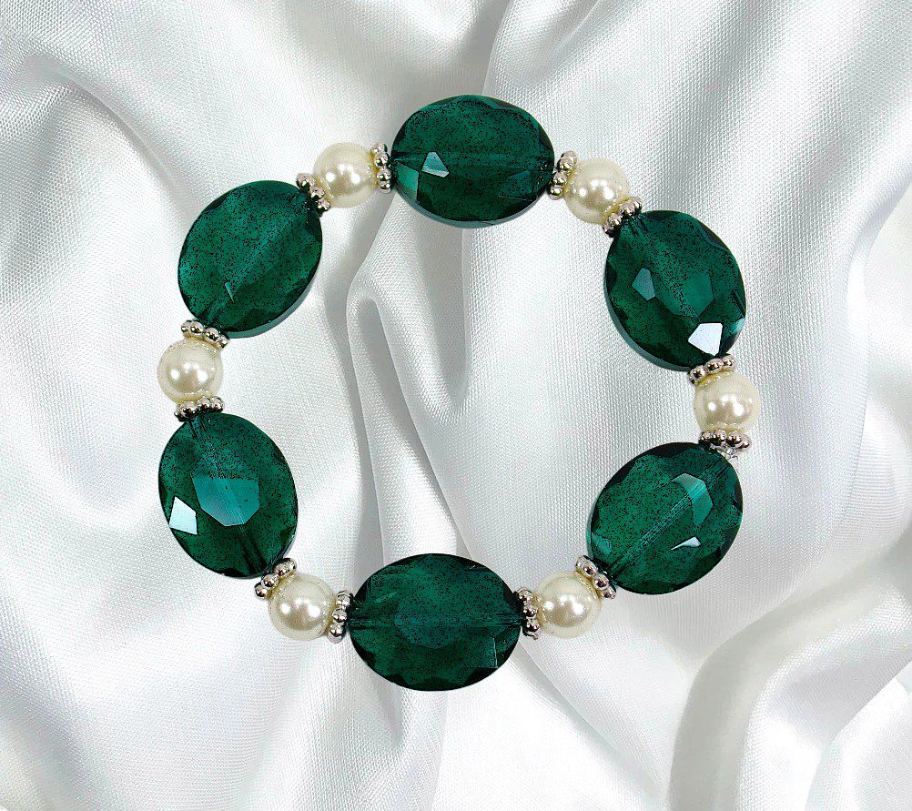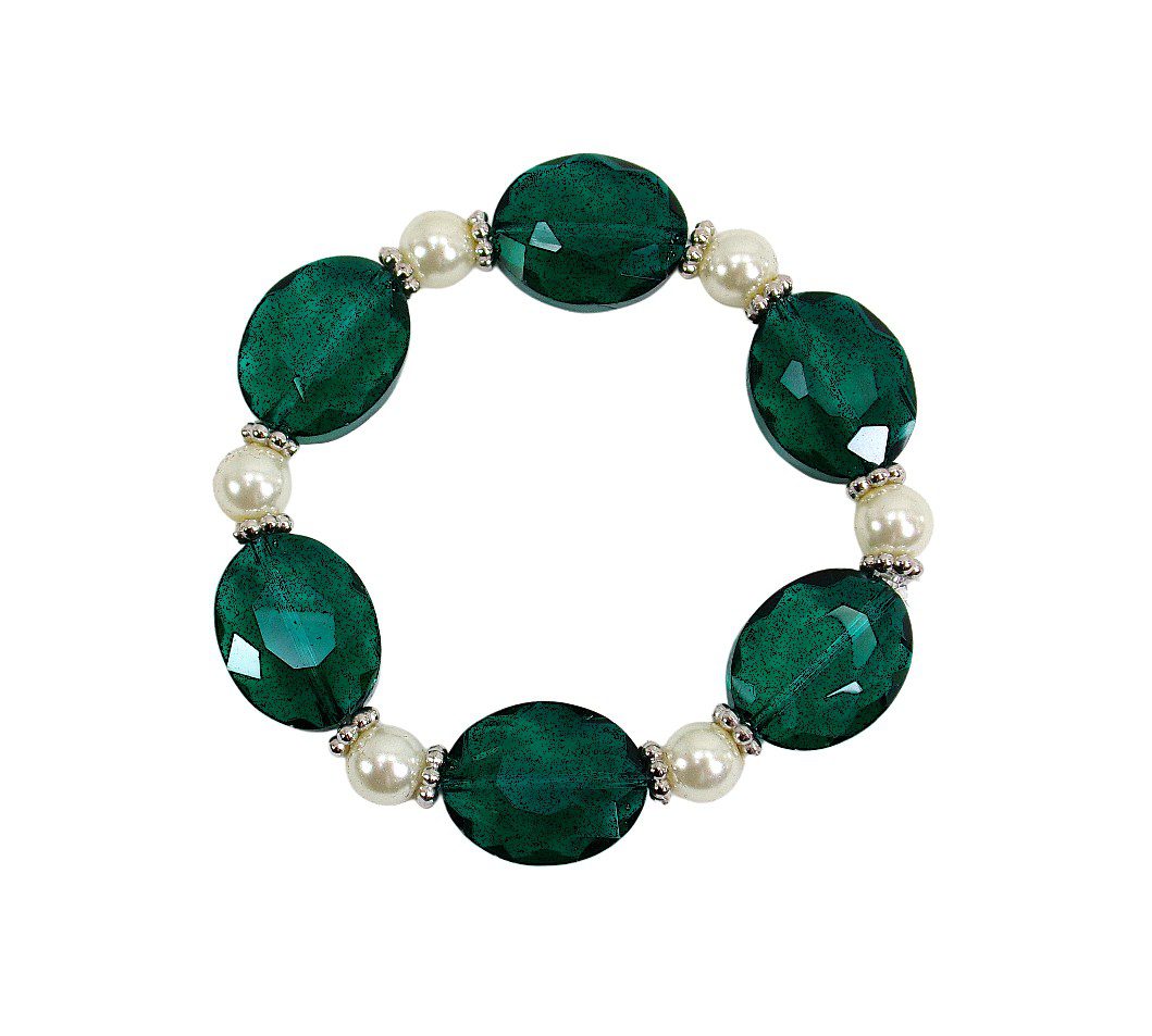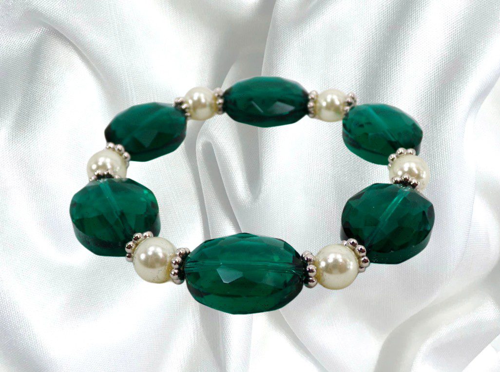 Green glass and pearl beaded stretch bracelet. This elegant bracelet is created with emerald green color oval glass beads and white round glass pearl beads. Each bead is separated by small silver spacer beads. The bracelet makes beautiful accent piece with any outfit.