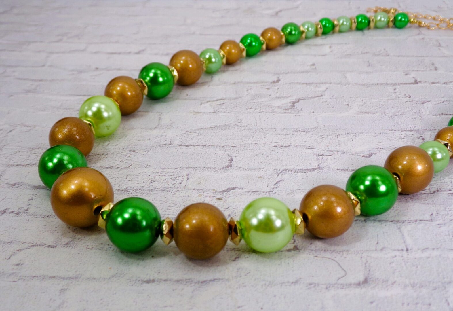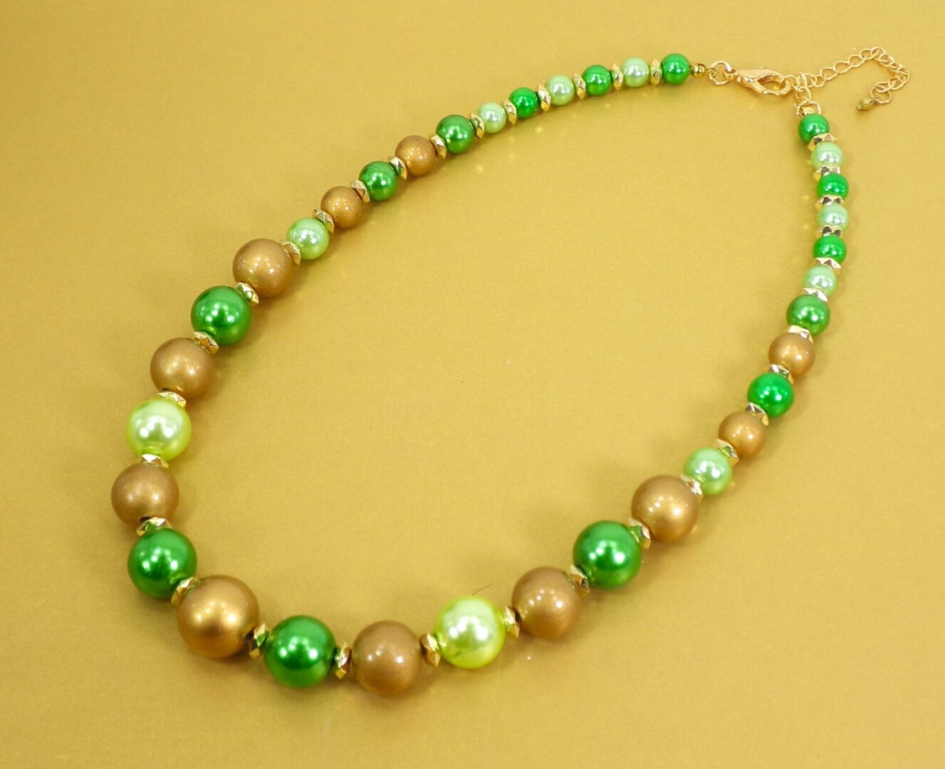 Elevate your look with this stunning green and gold beaded necklace set, a beautiful blend of rich color and timeless elegance. Designed with round beads in deep green, light green, and matte gold, this set offers a vibrant yet sophisticated style that enhances any outfit. Shiny gold spacer beads add an extra touch of sparkle, giving the necklace and earrings a polished, refined finish.