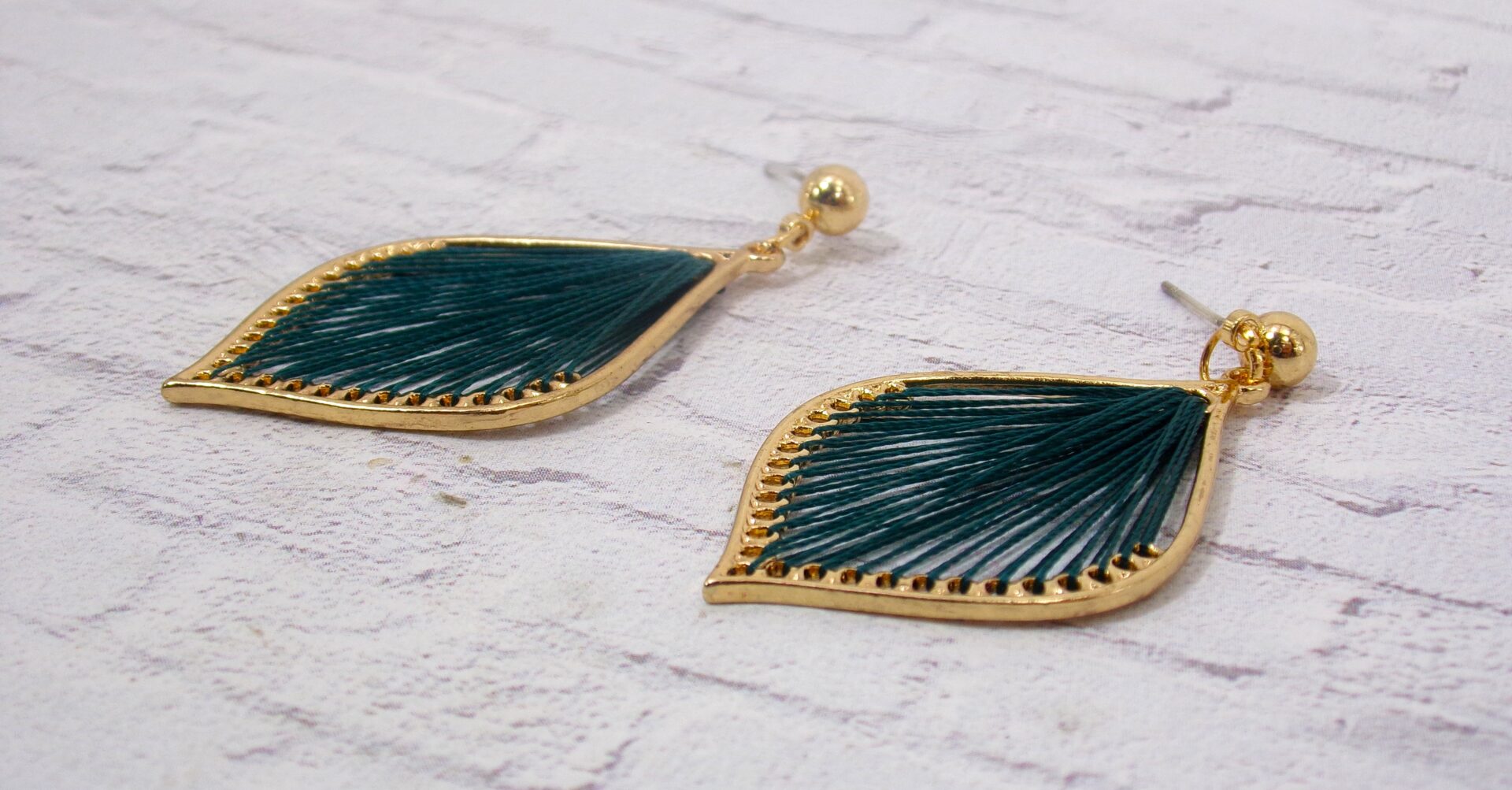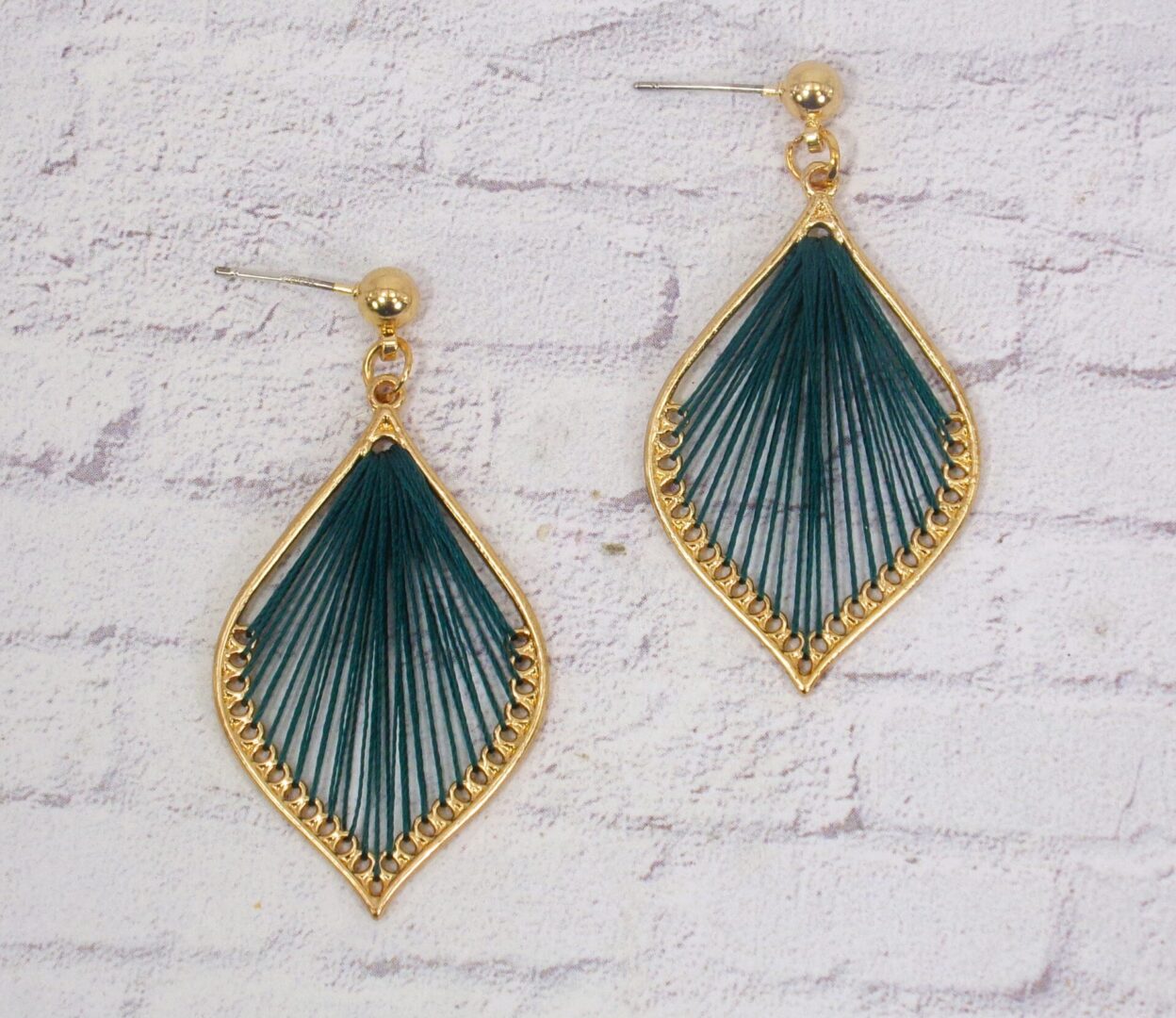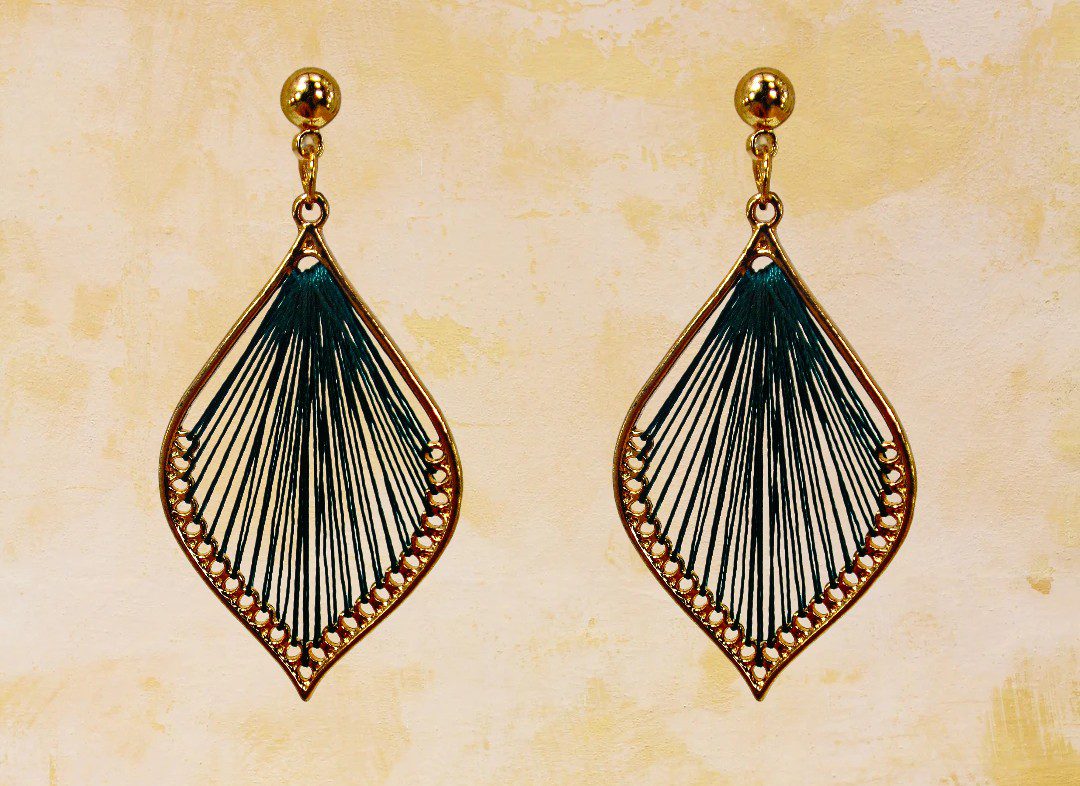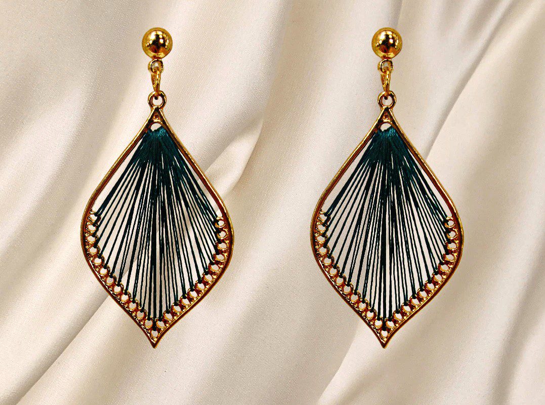 Pretty teardrop shape earring made with green color thread in the center and finished in a gold plating. The tread is hand wrapped to fill the entire center of the earrings. An elegant pair of earrings for everyday or any special occasion.