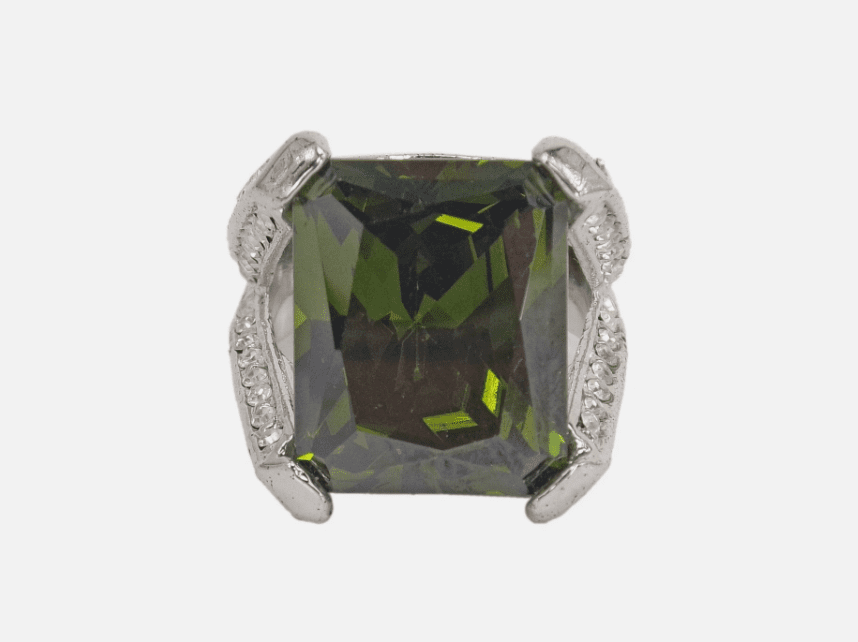 - The size of the green cubic zirconia stone is 16 mm long x 13 mm wide.