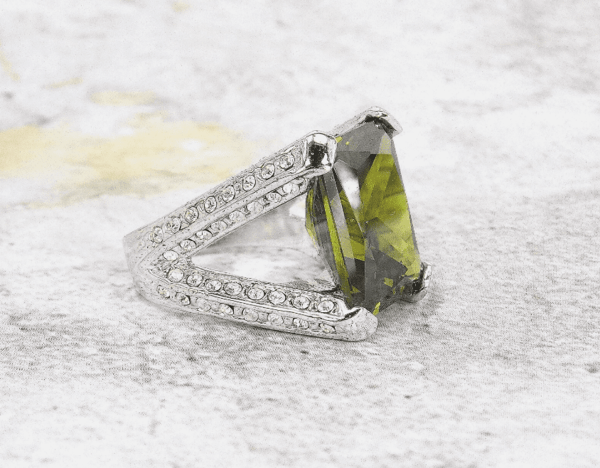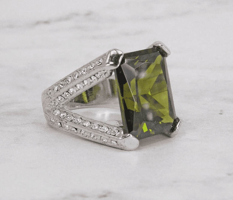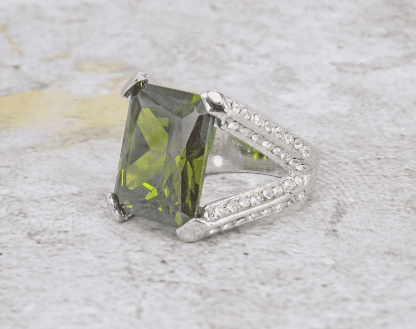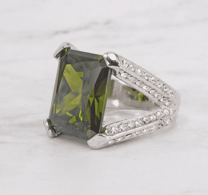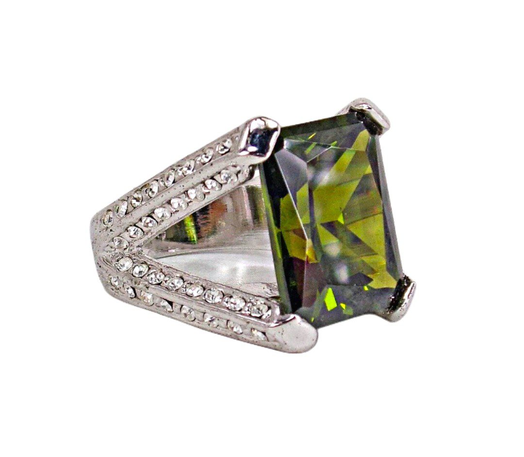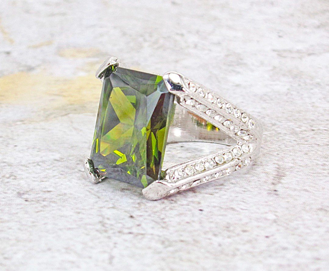 Beautiful green cubic zirconia stone statement ring created in a rectangle shape stone. It is designed with the green CZ stone set in a four prong open setting. There are clear cubic zirconia stones set into sides, top, and bottom of the ring shank. It makes a stunning statement ring for any occasion.