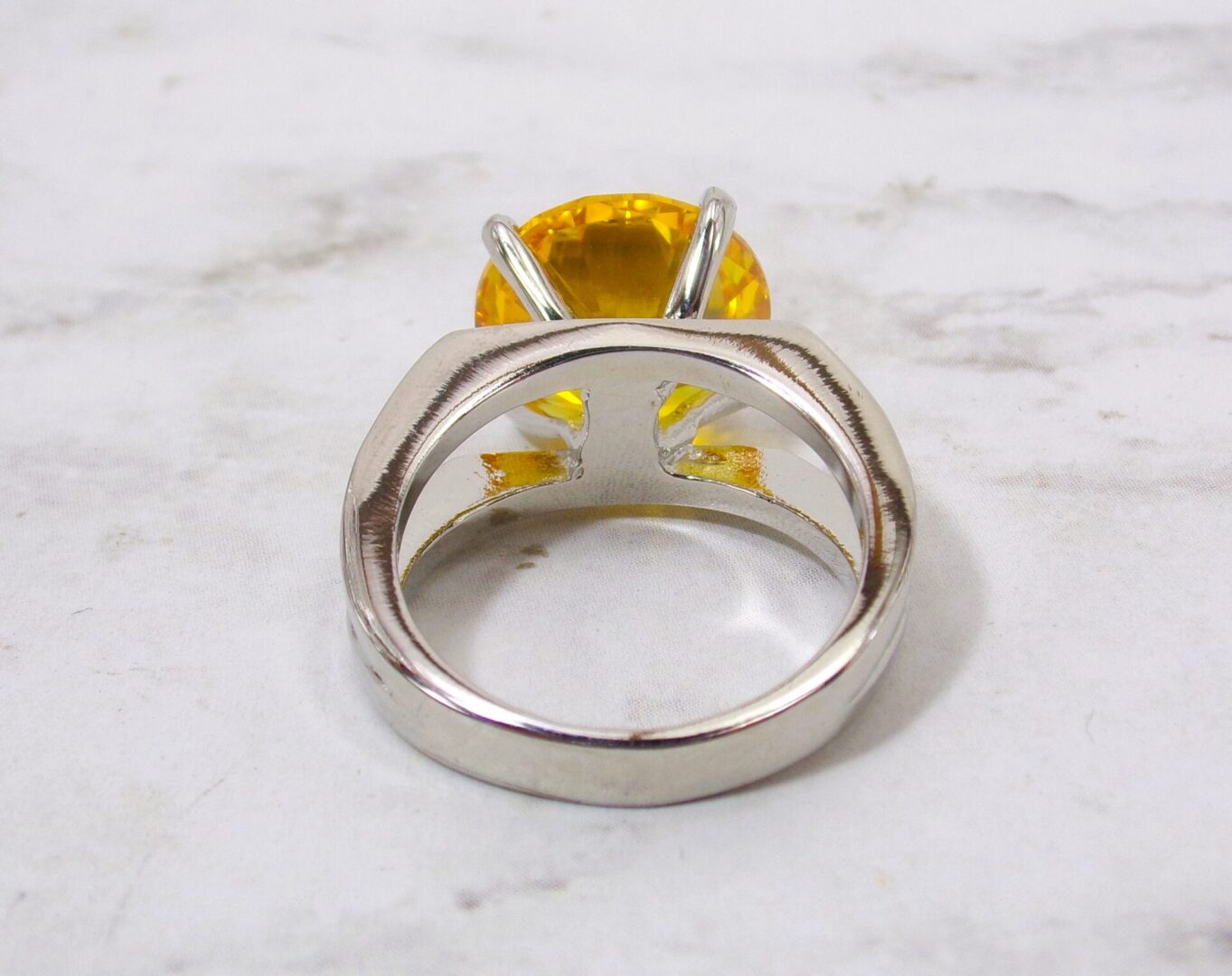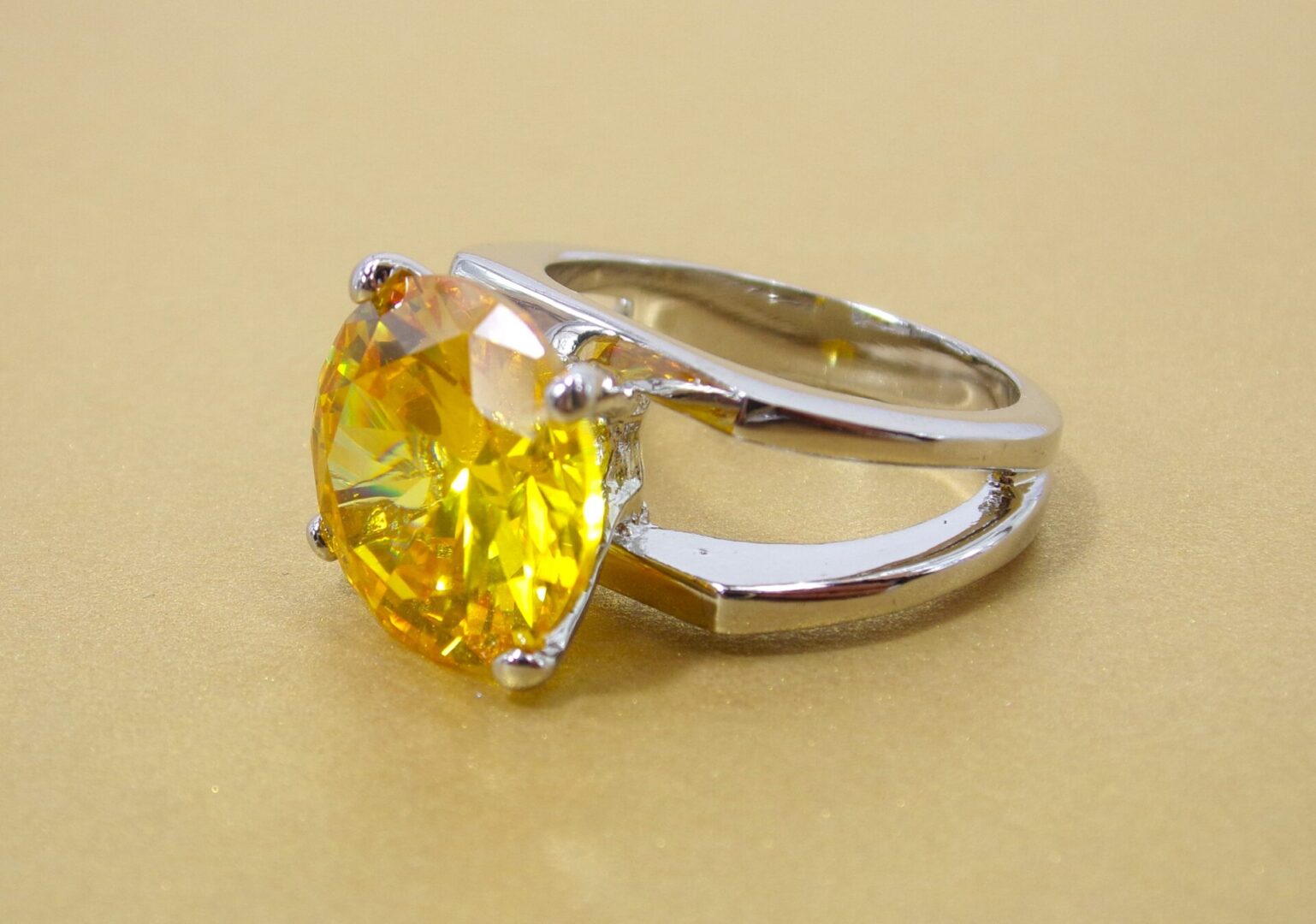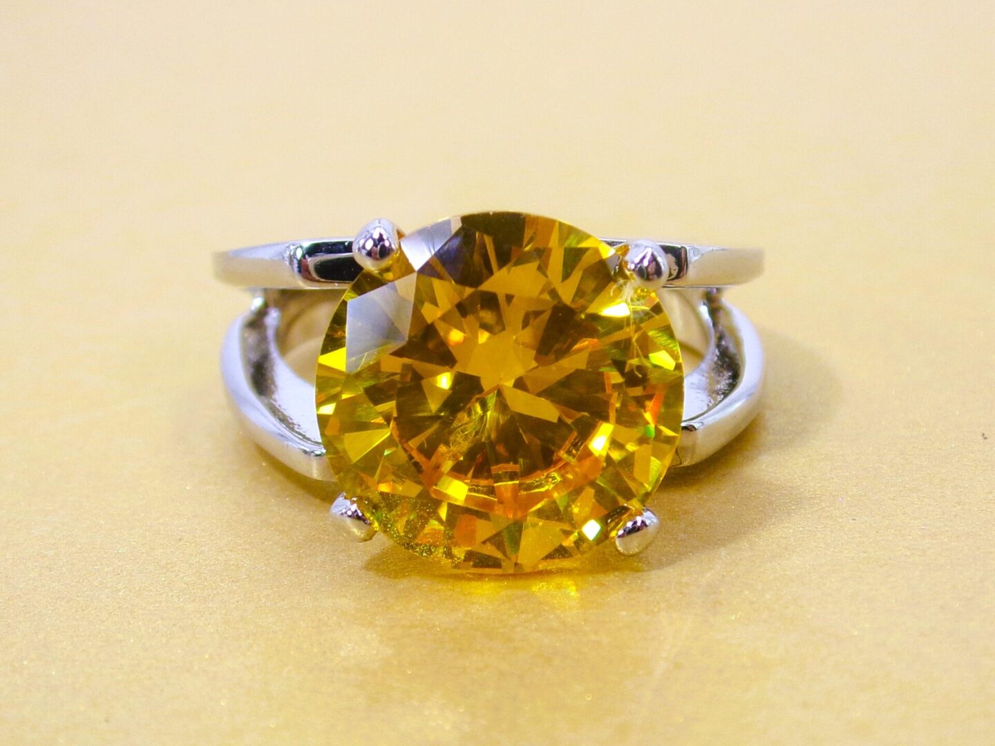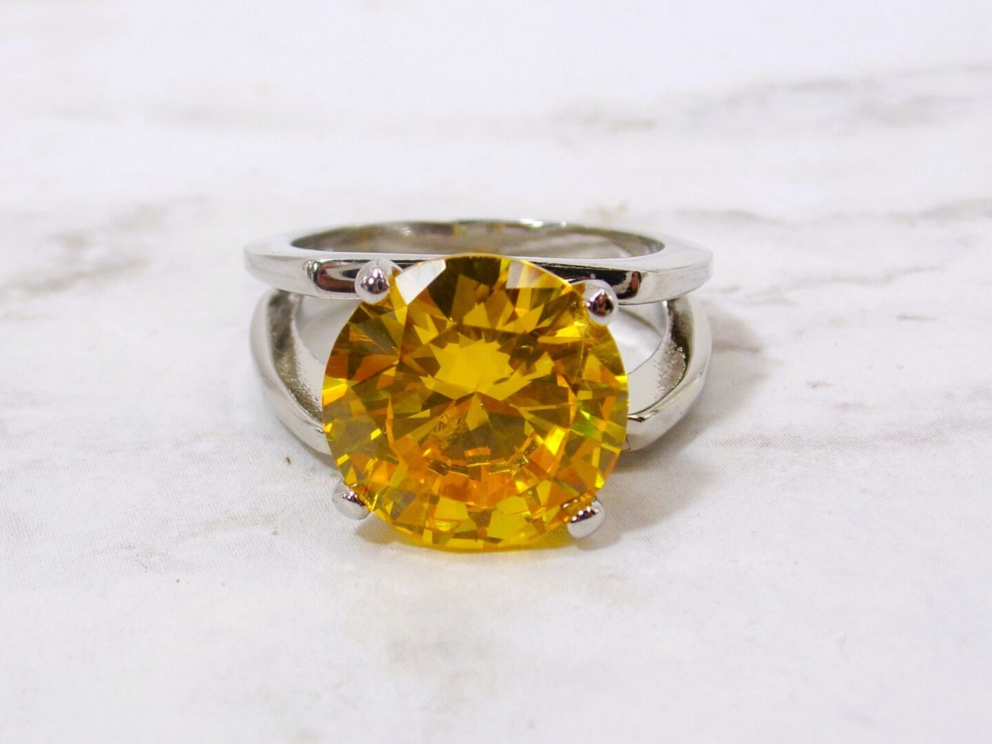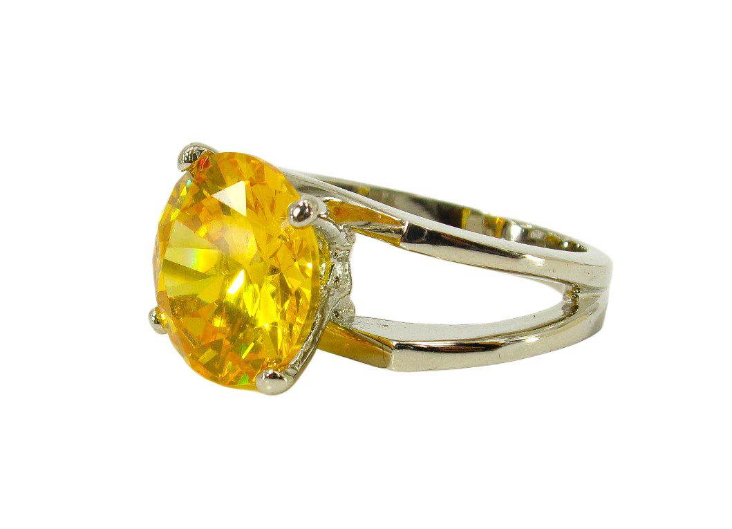 Large round solitaire cut cubic zirconia ring in a brilliant yellow color.  It is set in an open double row band in a high polished silver plating.  The large 12mm round cz stone is prong set.  A stunning ring and perfect accent with any outfit.