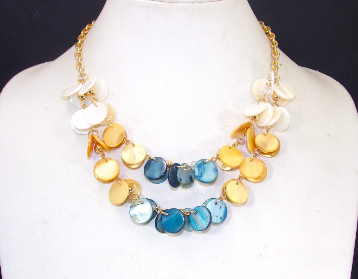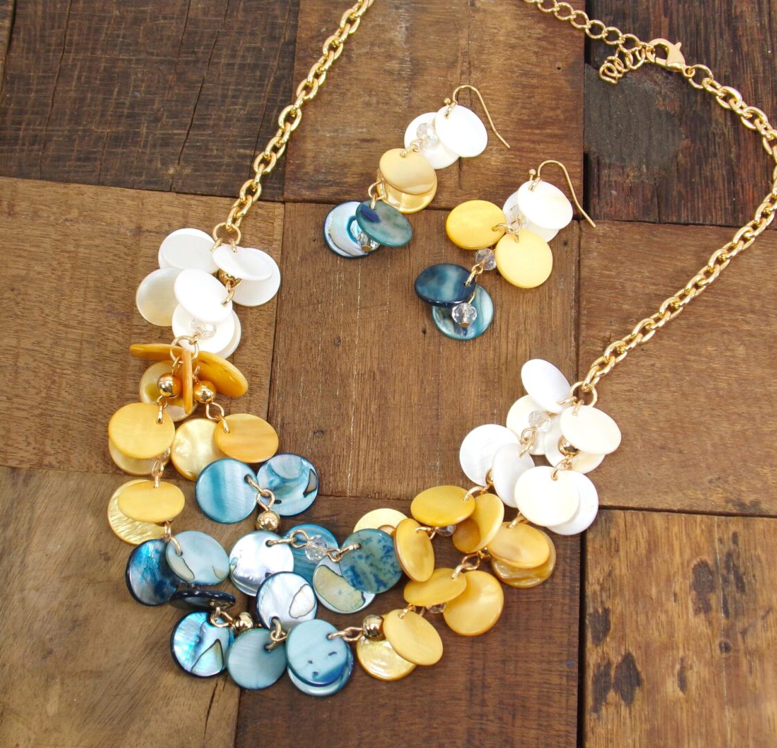 Bring a burst of coastal charm to your style with this colorful shell necklace and earring set. Featuring shimmering shell disk beads in vibrant blue, warm beige, and soft white, each piece catches the light beautifully for an eye-catching glow.
