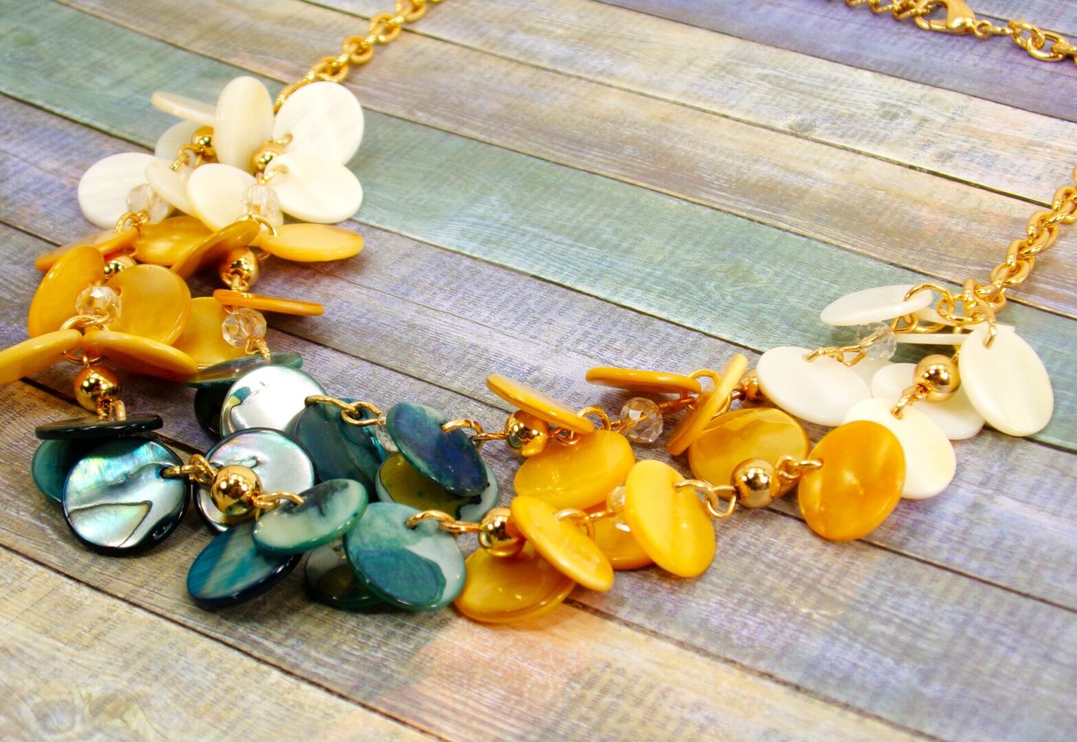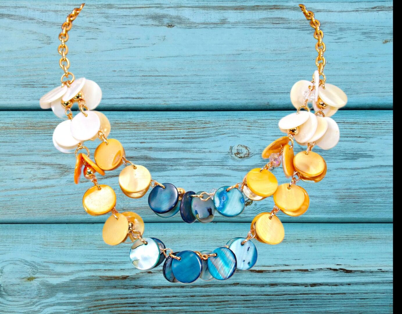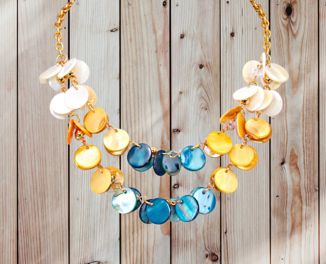 The double-layered necklace is designed with hand-linked shell beads, gold accents, and delicate clear crystals, creating a playful yet polished look. Perfect for vacations, summer events, or adding a splash of color to your everyday outfit, this set transitions effortlessly from casual to dressy.