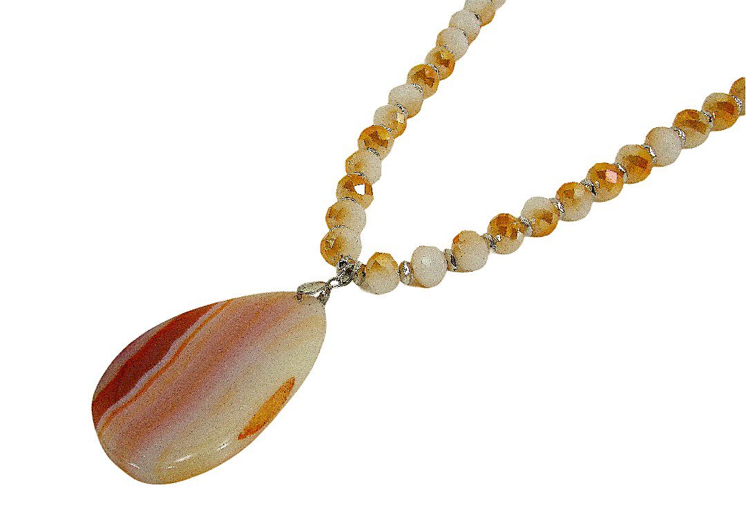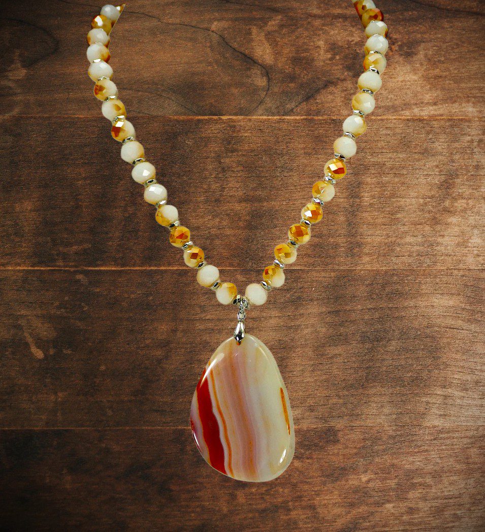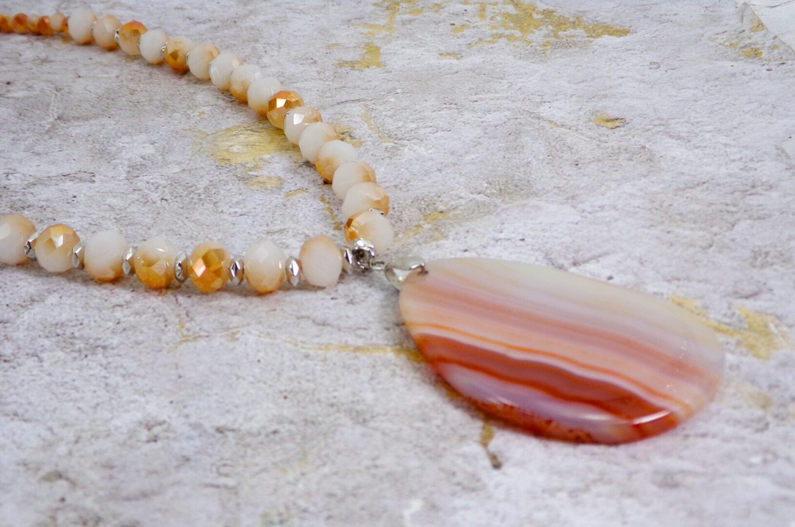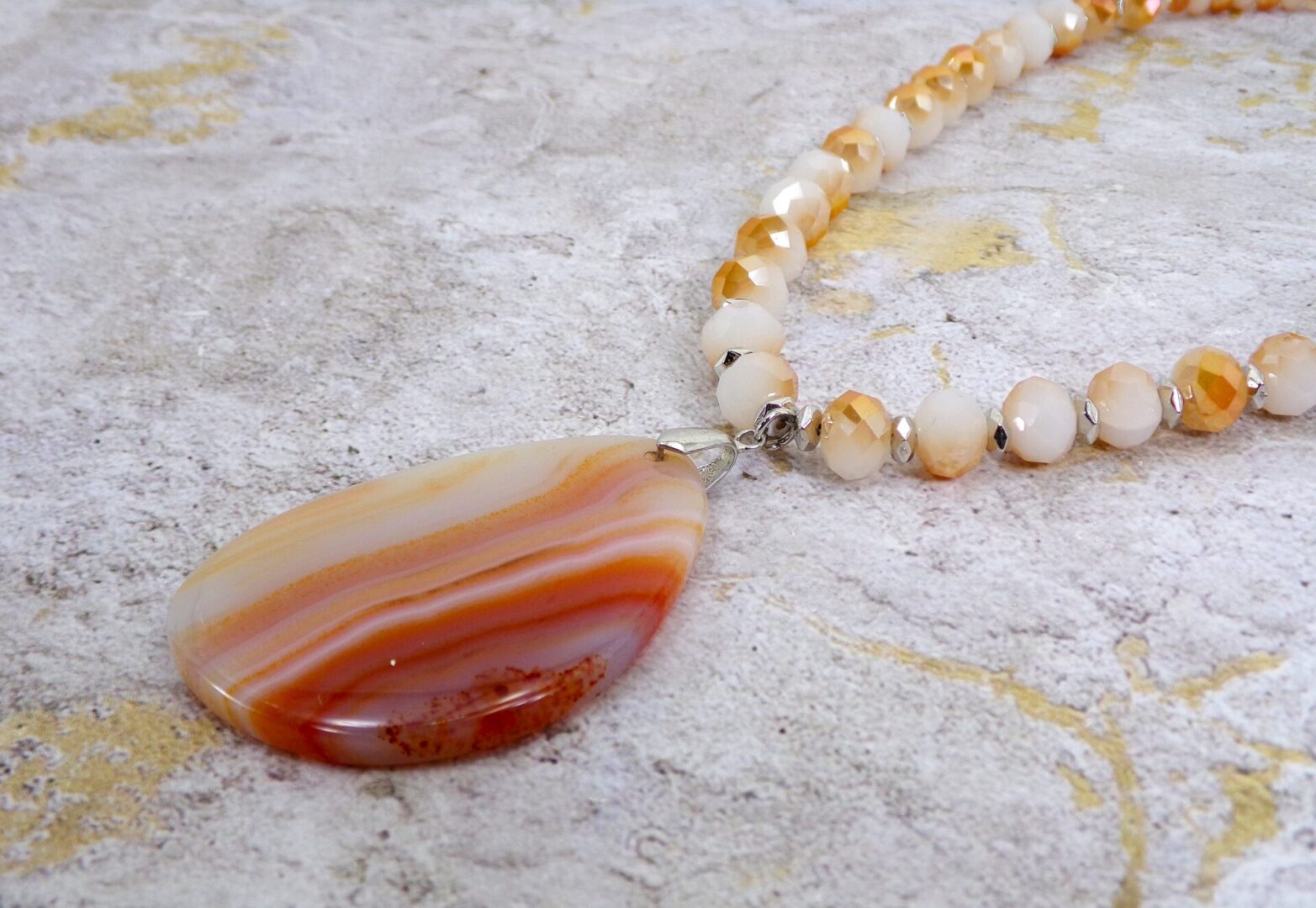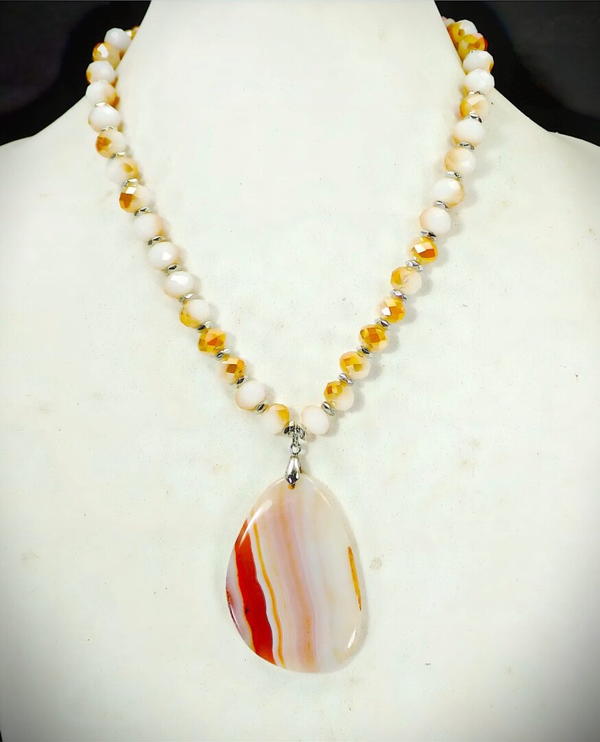 A bold orange banded stone statement necklace inspired by the layered beauty of natural agate. Warm ivory and amber tones create an elegant focal point designed to elevate any look.