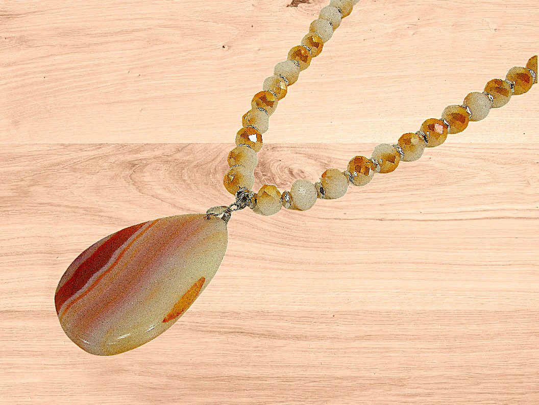 The Sunset Banded Stone Statement Necklace captures the layered beauty of natural agate in rich tones of amber orange and soft ivory. Flowing bands of color move organically through the polished teardrop pendant, creating depth and dimension that feels both earthy and refined.  This pendant reveals subtle variations in pattern, making every piece uniquely captivating from every angle.