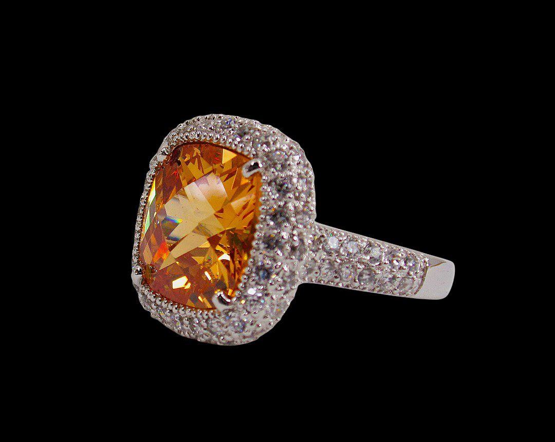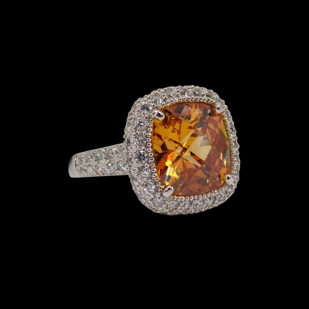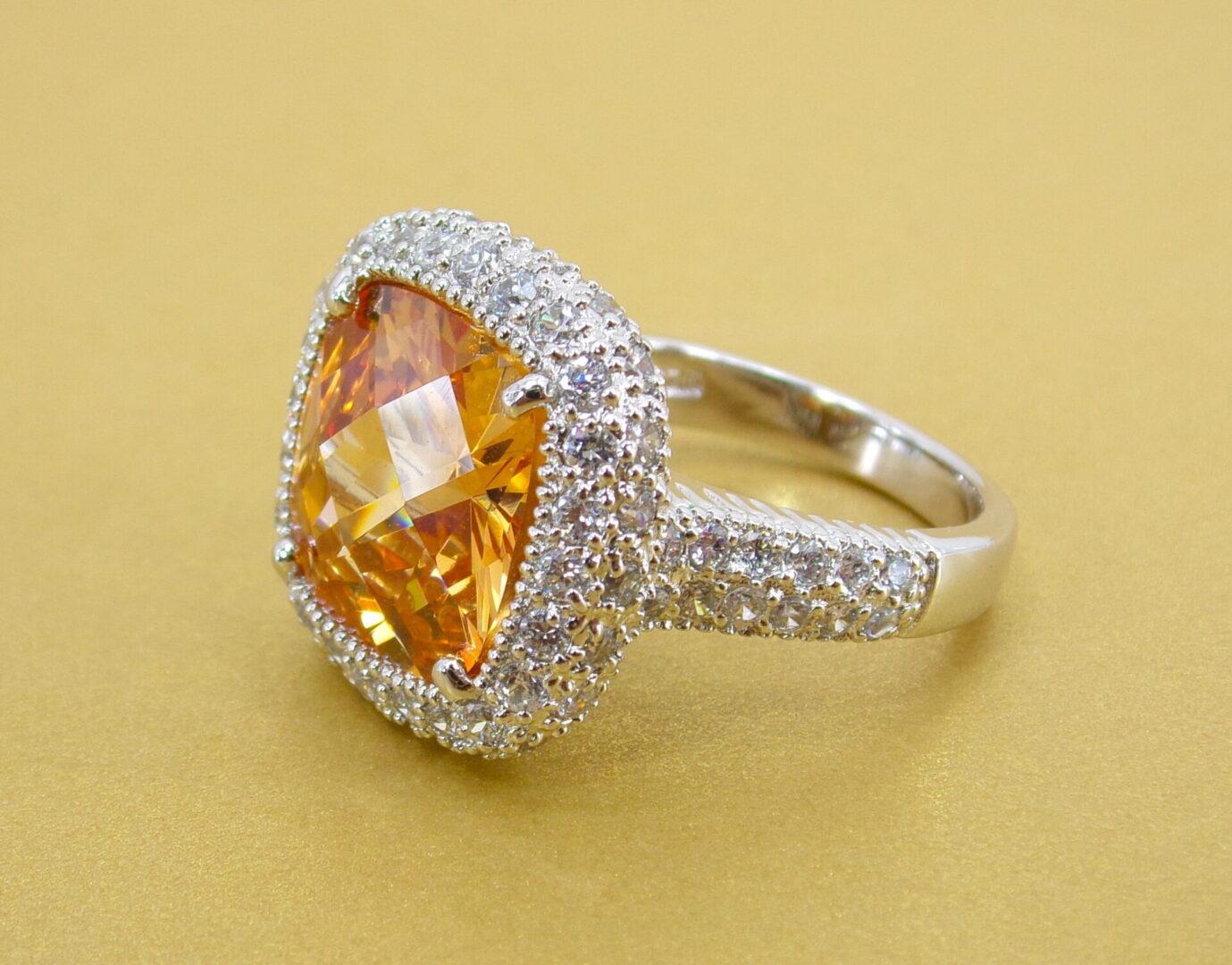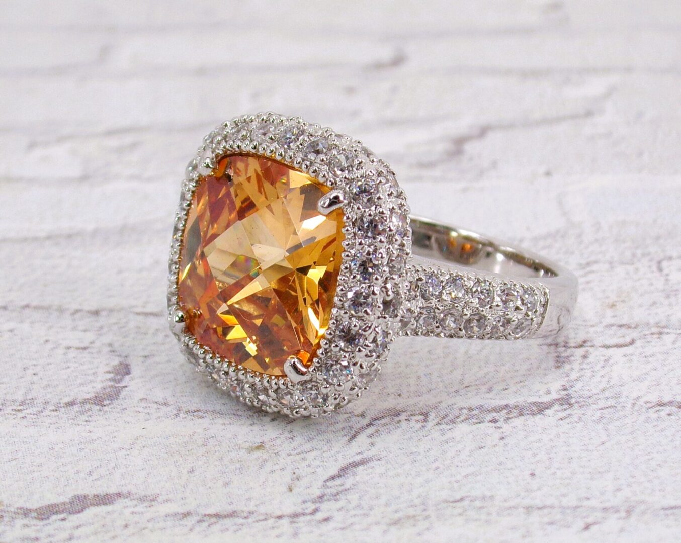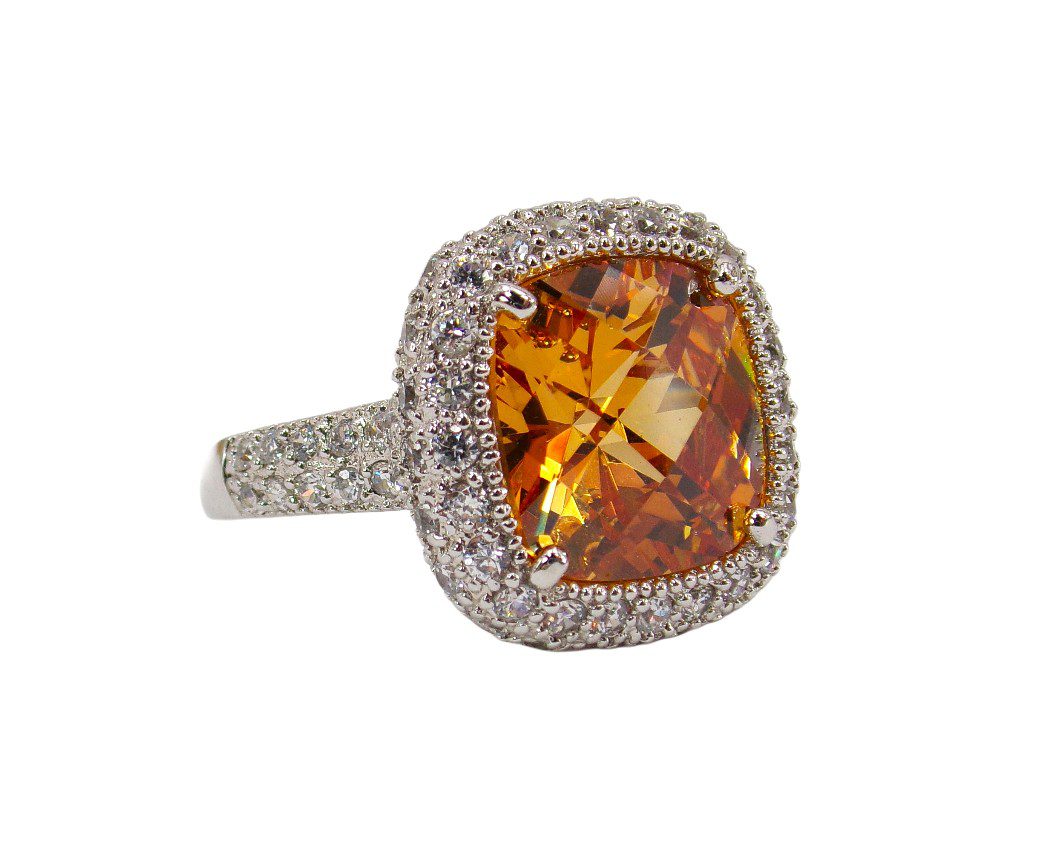 Orange topaz color cubic zirconia stone ring. It is designed with a cushion cut shape cz stone and surrounded by all small clear stones set round it and on the sides of the band. A beautiful bold color statement ring that is perfect for any occasion and works nicely with any outfit.