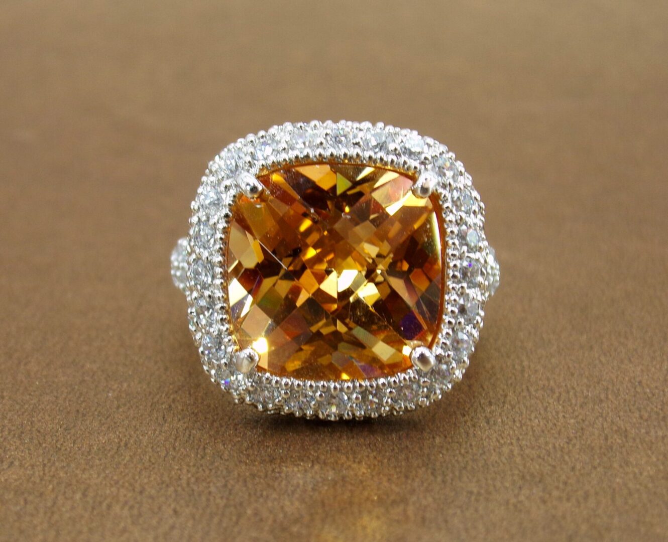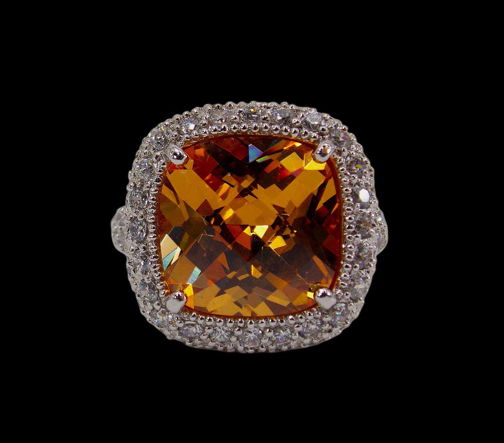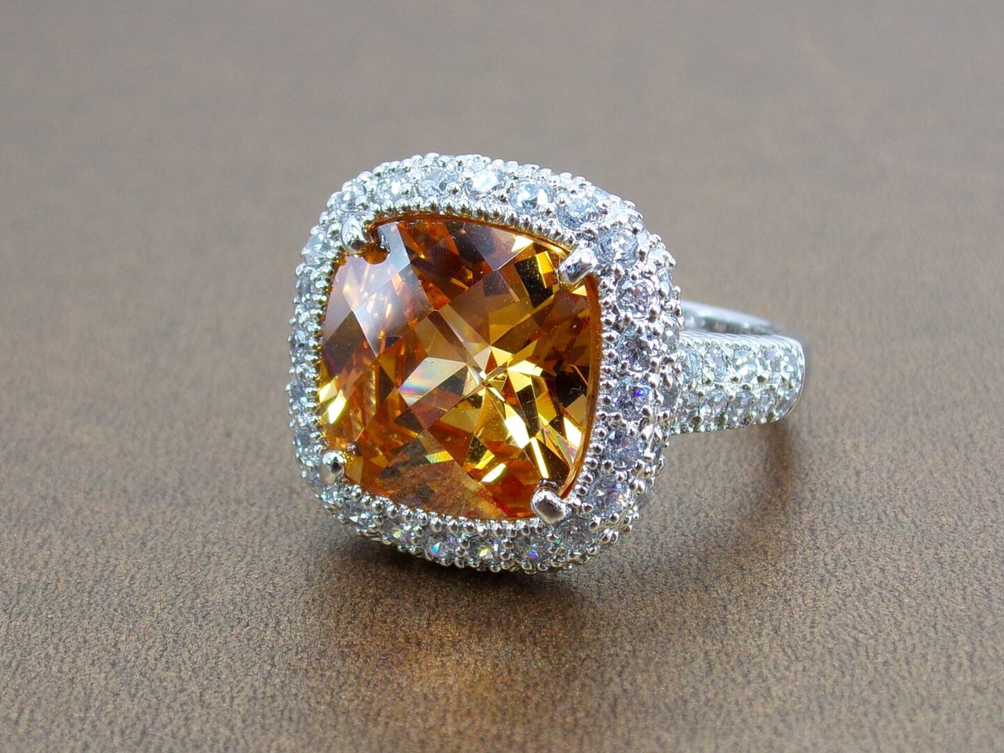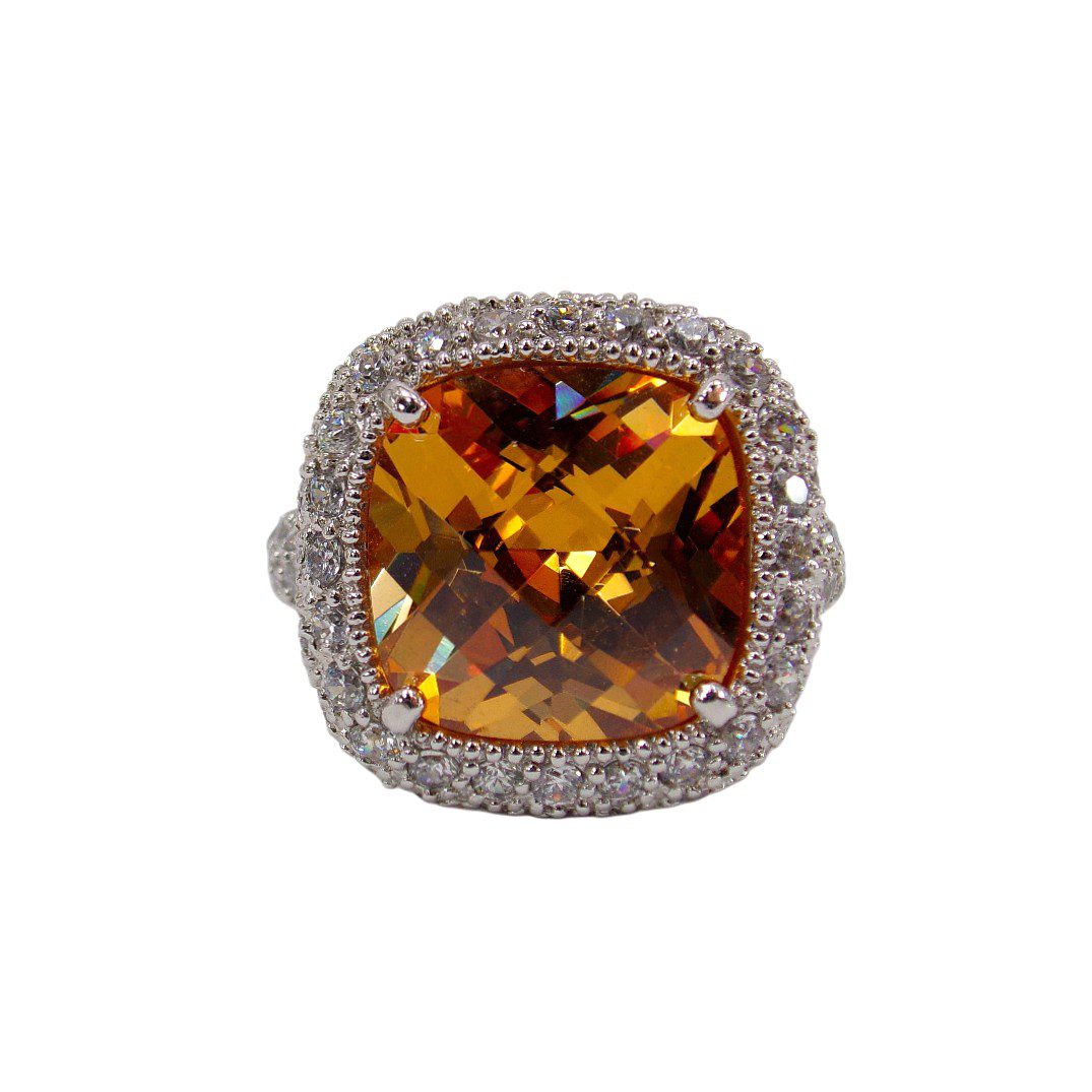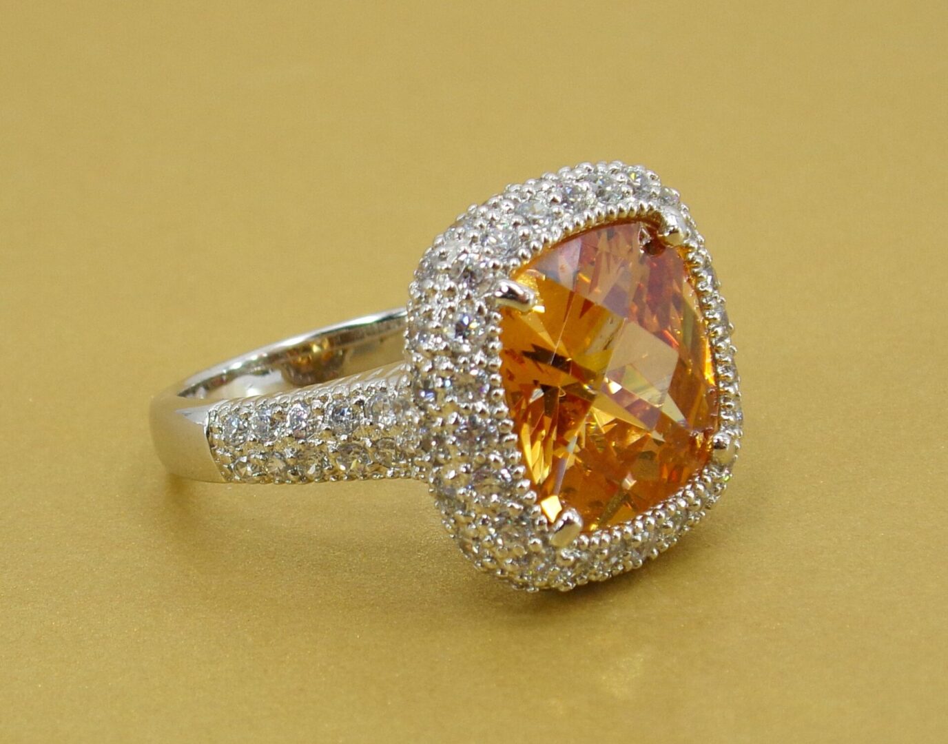 Orange topaz color cubic zirconia stone ring. It is designed with a cushion cut shape cz stone and surrounded by all small clear stones set round it and on the sides of the band. A beautiful bold color statement ring that is perfect for any occasion and works nicely with any outfit.