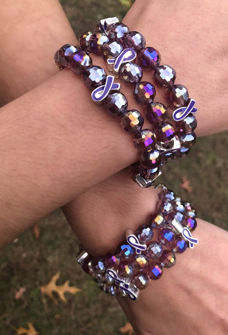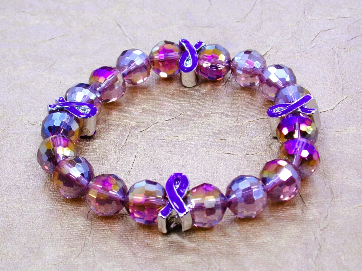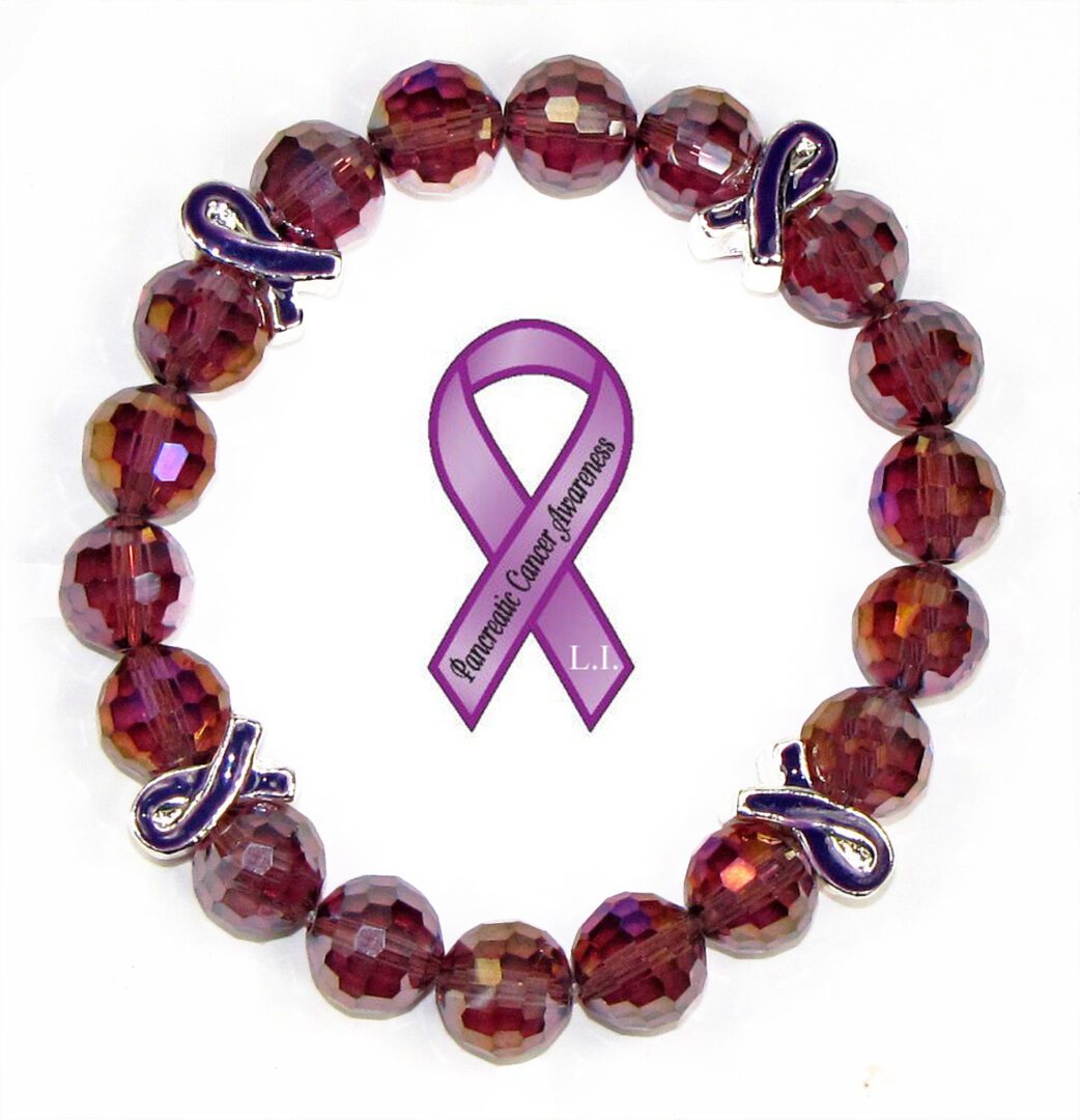 Show your support for Pancreatic Cancer Awareness with this purple glass beaded stretch bracelet. It is created with facet cut purple glass beads and purple enamel ribbons. Proceeds go to the Pancreatic Cancer Action Network to help support cancer research, patient support, community outreach, and the advocacy for a cure. Help support our mission to find a cure.