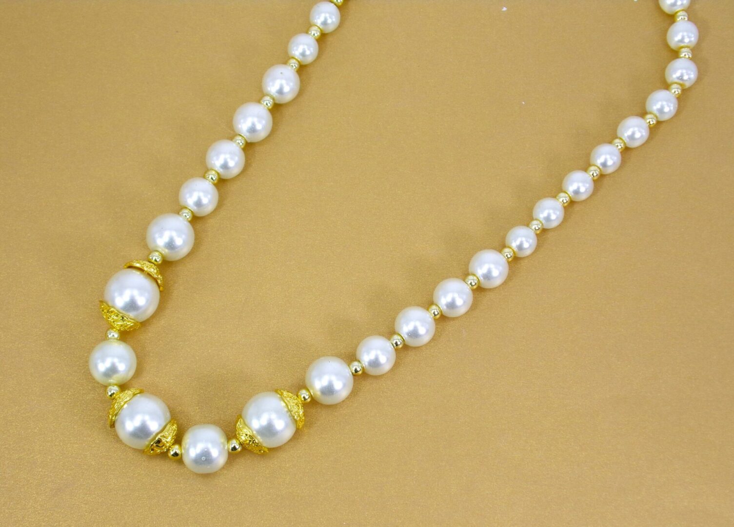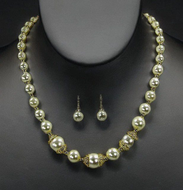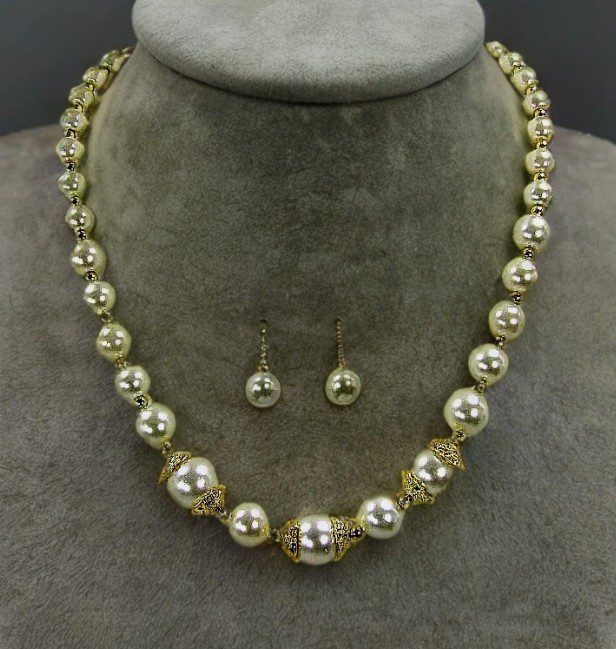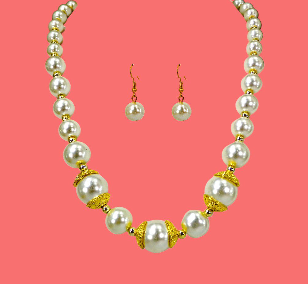 Elevate your look with timeless elegance. This classic faux pearl necklace and earring set features luminous white glass pearls beautifully accented with polished gold-tone beads and yellow gold–plated caps for a refined, luxurious finish. Designed to capture the beauty of traditional pearls with a modern touch, this set adds instant sophistication to any outfit.