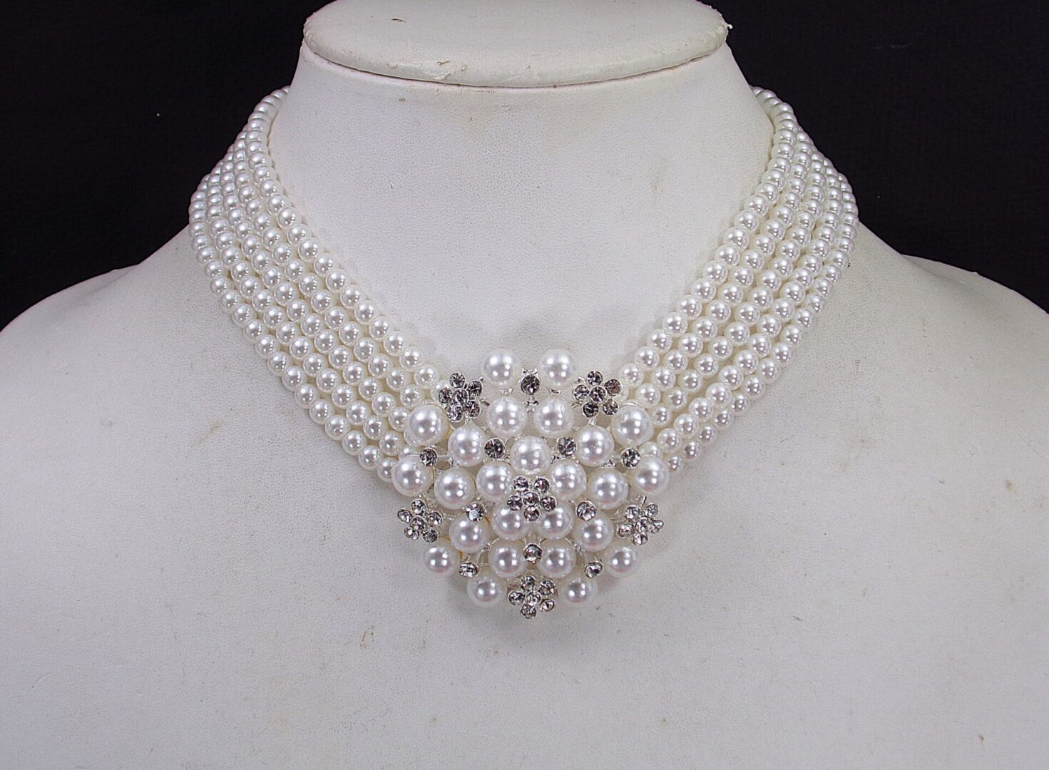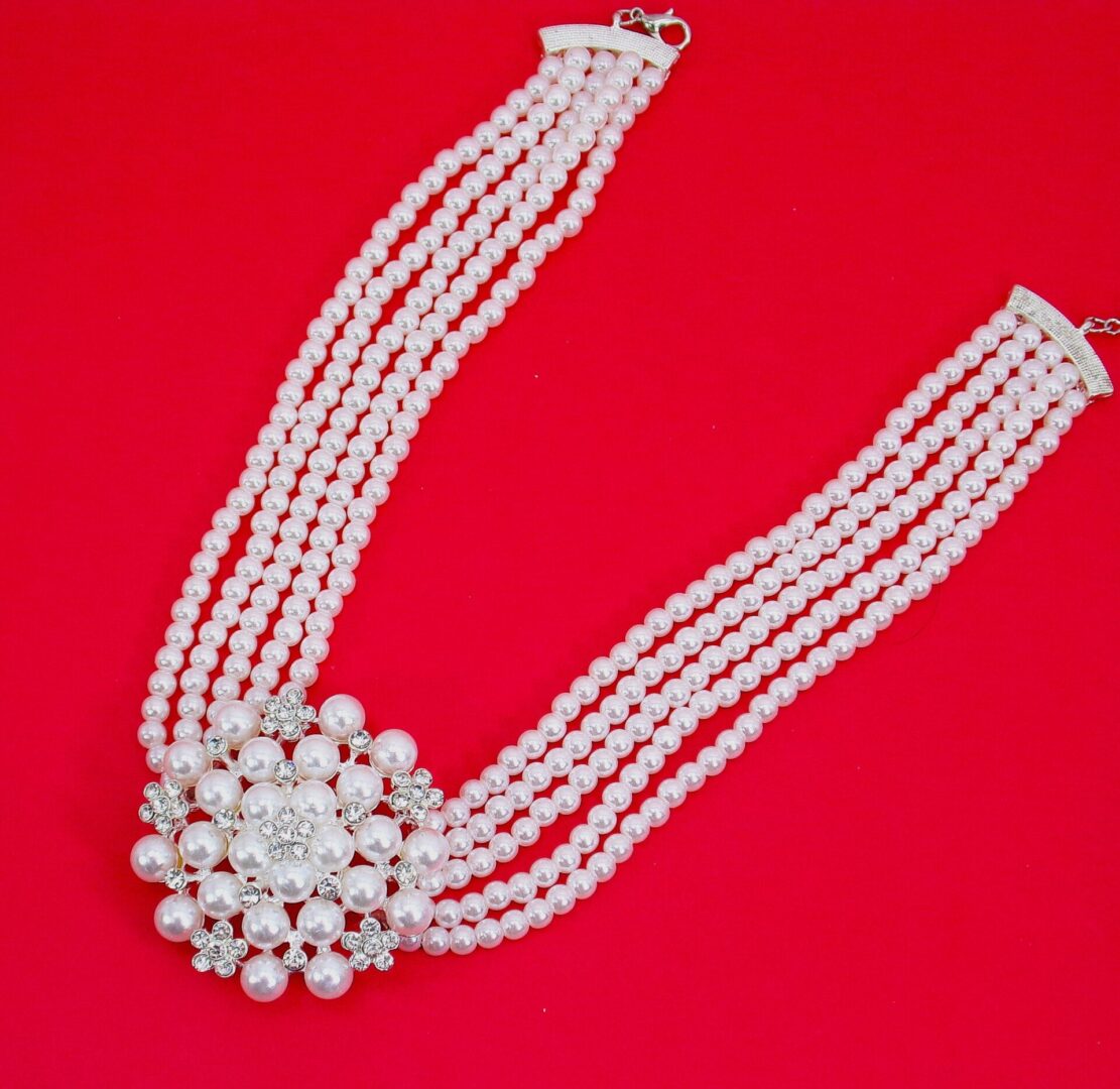This striking necklace features five strands of luminous white faux pearls that gracefully frame the neckline, leading to a bold floral pendant centerpiece crafted from radiant pearls and sparkling clear crystals. The intricate flower design creates a captivating focal point that reflects light beautifully and adds sophisticated glamour to your look.