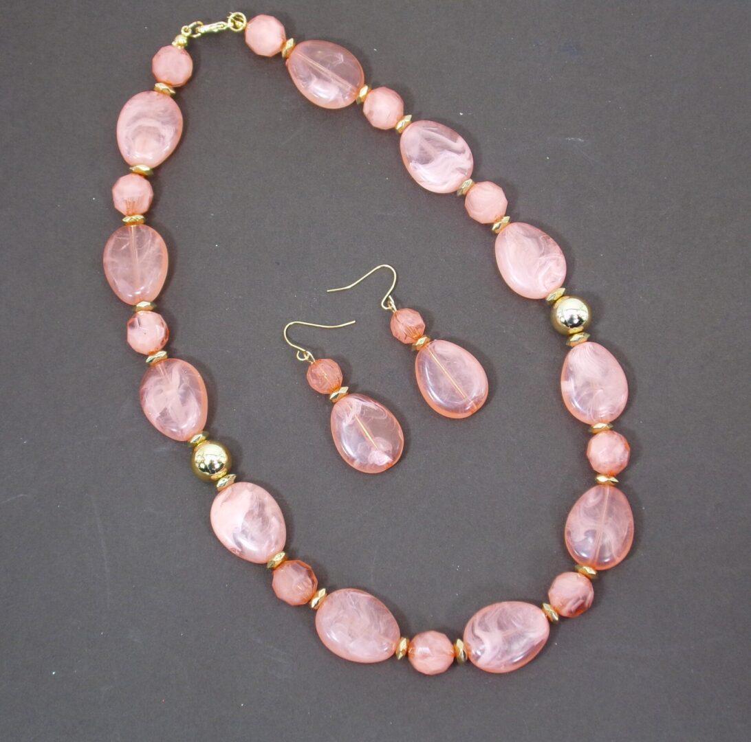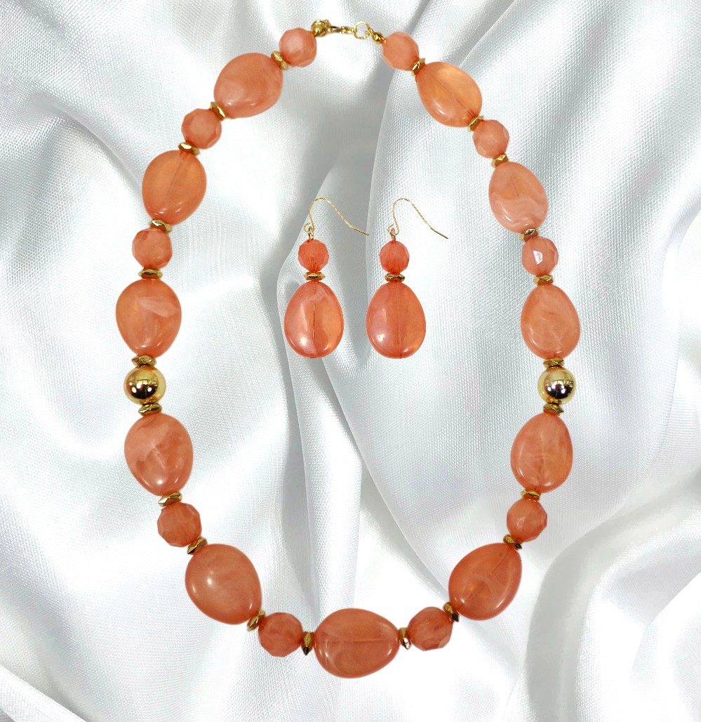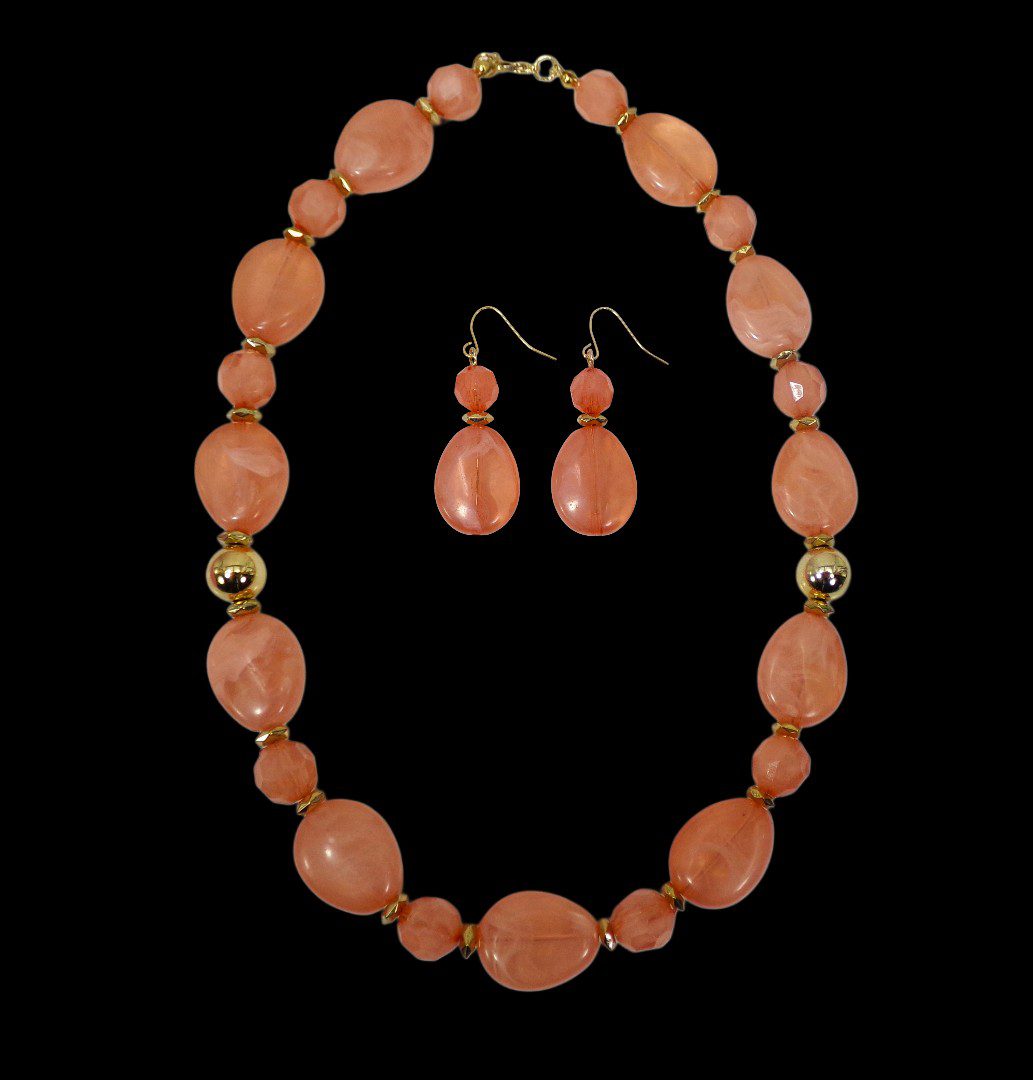 Add a touch of soft elegance to your look with this beautiful peach-pink beaded necklace and earring set. The delicate blend of peach with a hint of pink creates a warm, flattering tone that complements every skin tone — perfect for both everyday wear and special occasions.