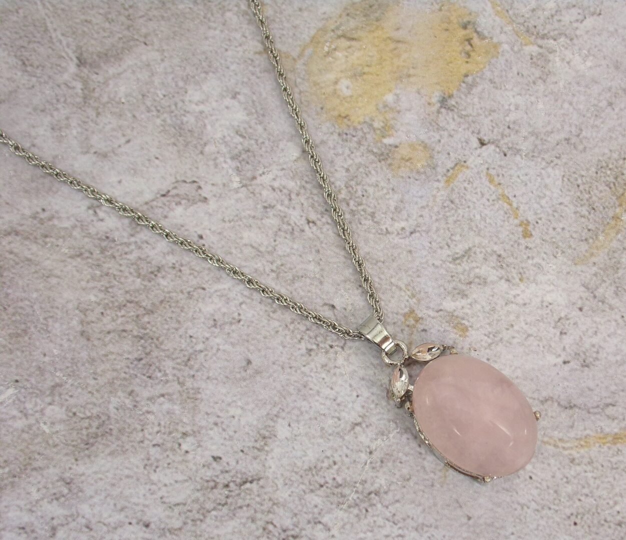Set on a sleek silver-plated rope chain, this necklace drapes beautifully on the neckline, making it perfect for layering or wearing as a standalone accent. The soft pink tone complements every skin tone and pairs effortlessly with both light and dark outfits.
