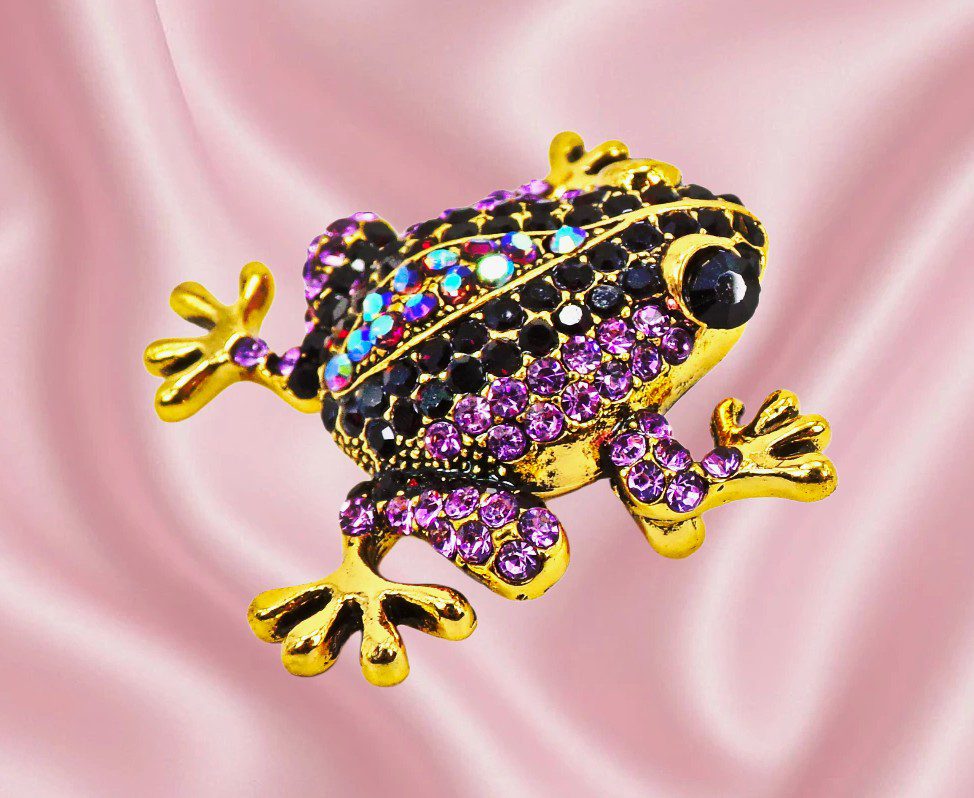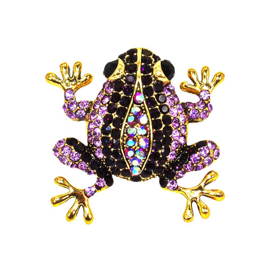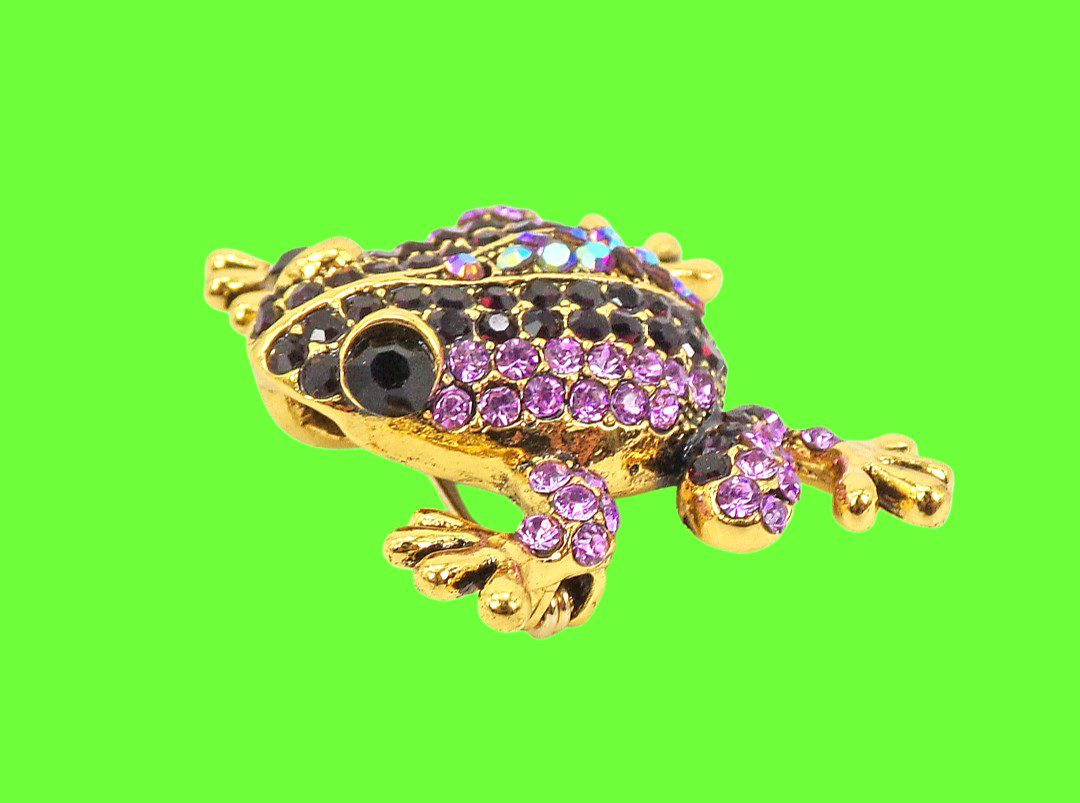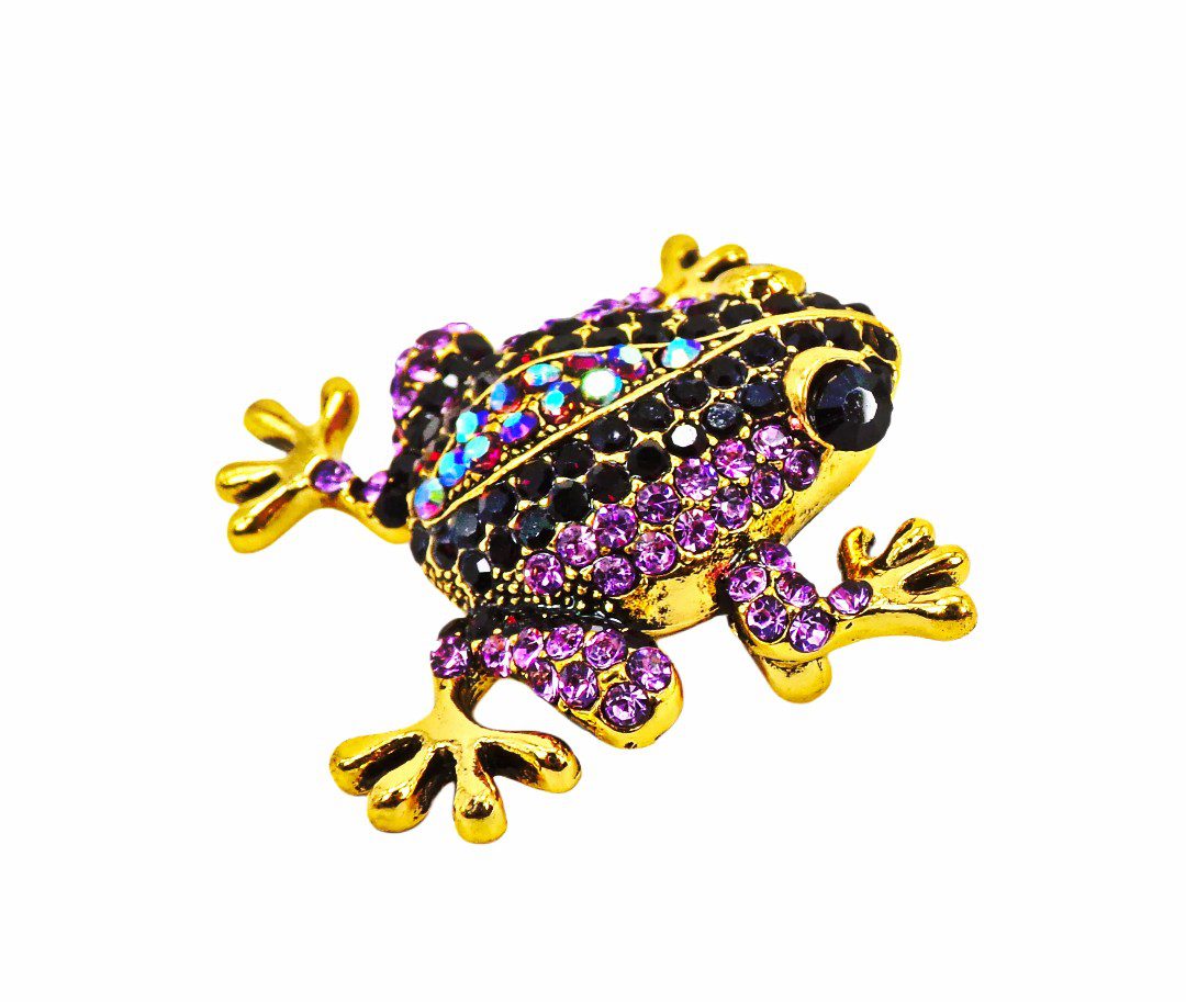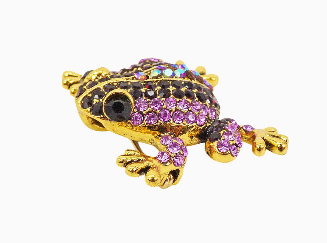 A sparkling purple crystal frog brooch with a whimsical design and elegant gold tone finish.