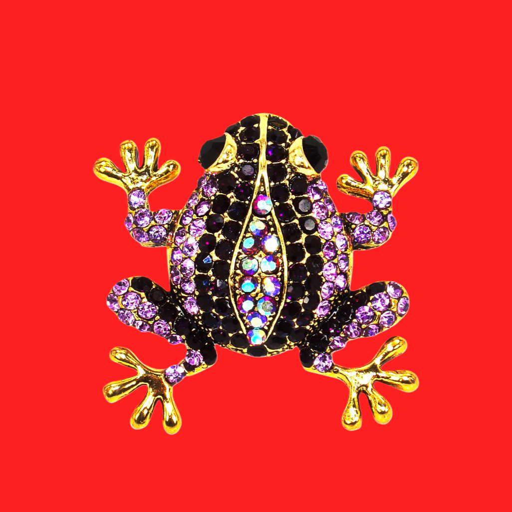 Playful yet refined, this purple crystal frog brooch is designed to capture attention with its intricate detailing and radiant sparkle. Adorned with shimmering purple, black, and iridescent crystals, this piece brings depth, color, and brilliance to a whimsical silhouette.
