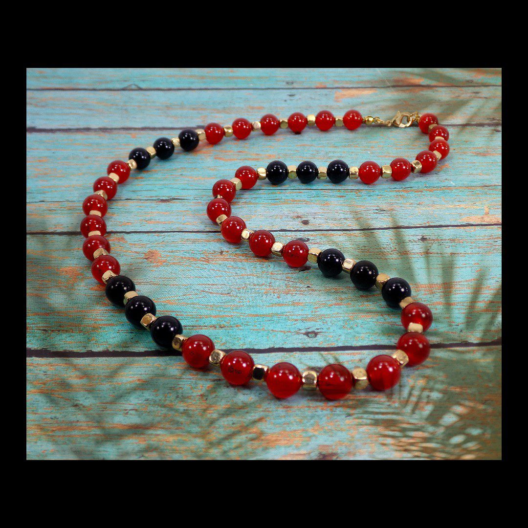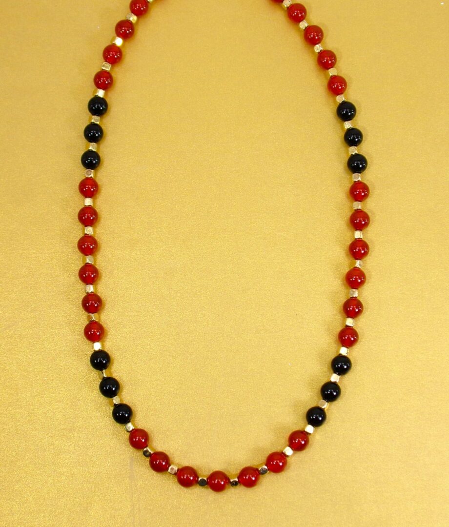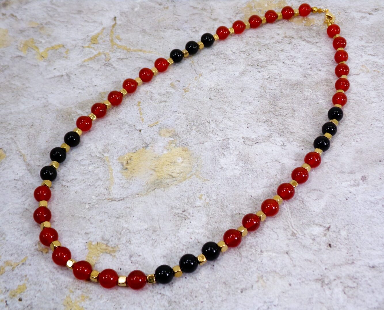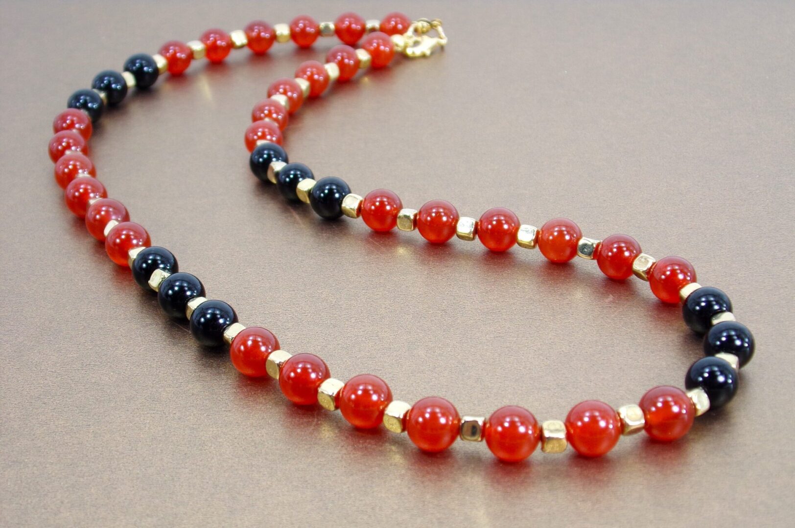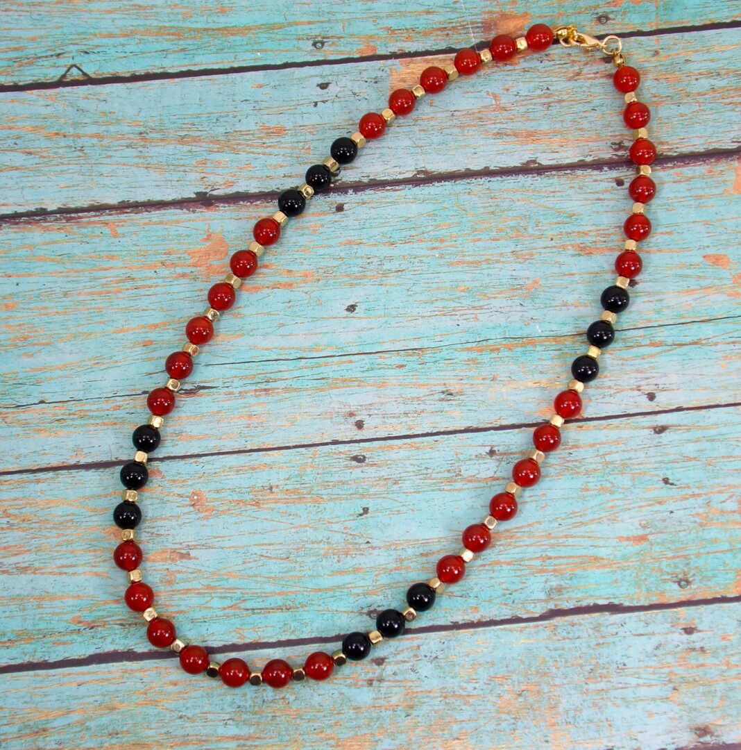 Red carnelian stone necklace made with black agate stones and gold accent bead. Turn heads with this striking 20-inch gemstone necklace featuring rich, deep red genuine carnelian stones beautifully paired with glossy black agate beads and accented by small gold-toned spacer beads. Each 8mm bead is carefully selected for its luster and color, creating a bold, balanced piece that transitions effortlessly from casual daytime wear to elegant evening style.