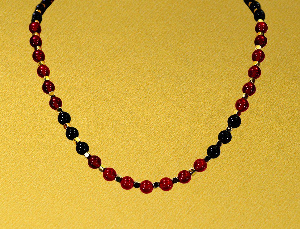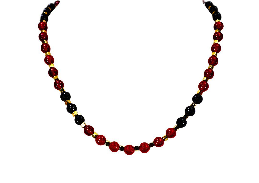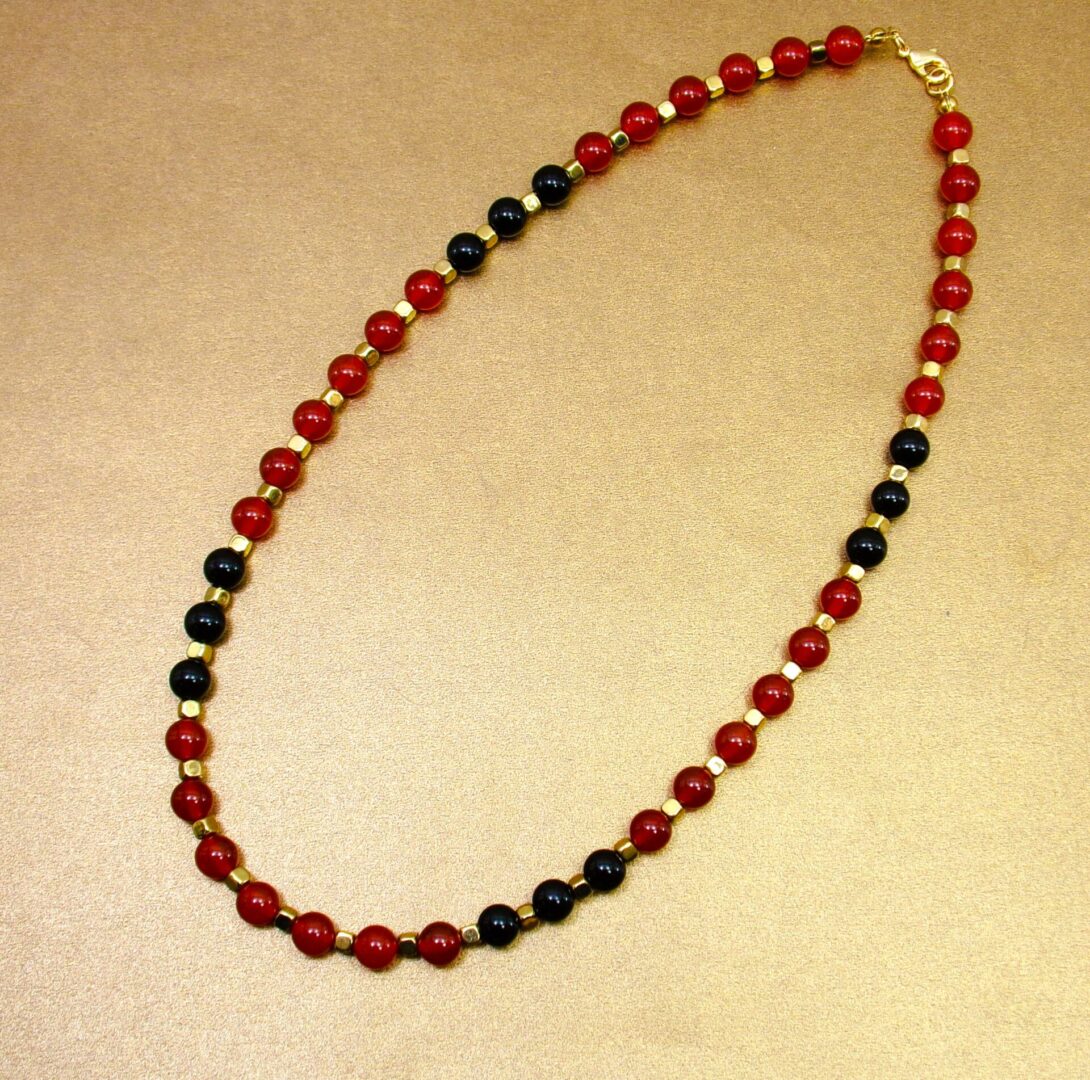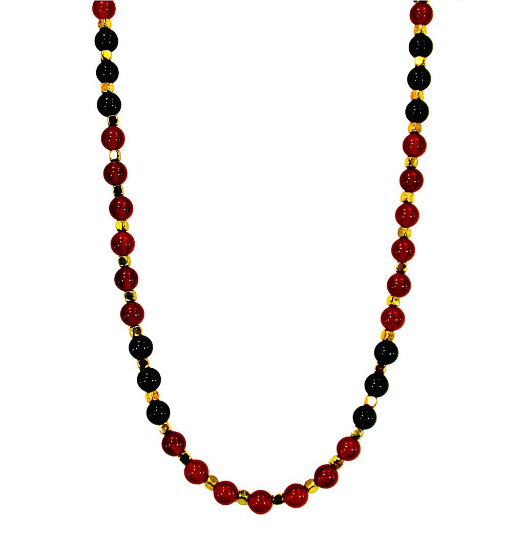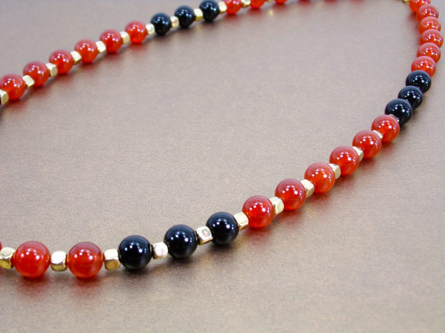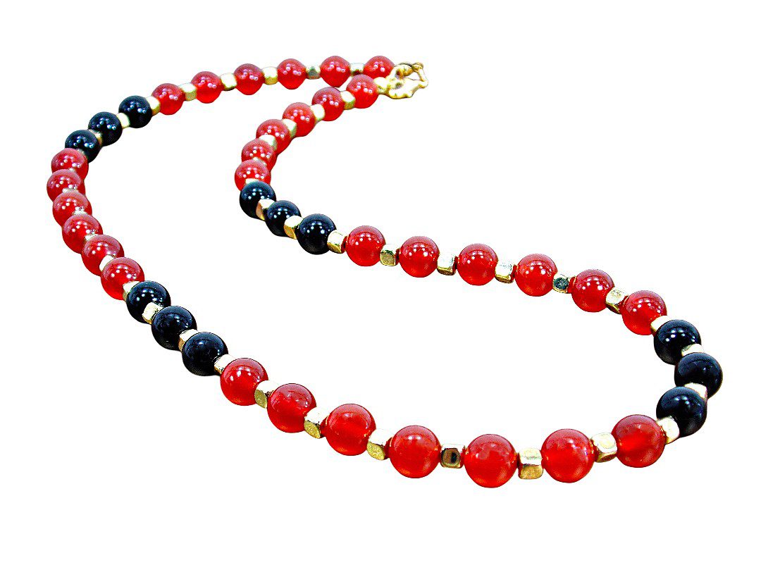 Red carnelian stone necklace made with black agate stones and gold accent bead. Turn heads with this striking 20-inch gemstone necklace featuring rich, deep red genuine carnelian stones beautifully paired with glossy black agate beads and accented by small gold-toned spacer beads. Each 8mm bead is carefully selected for its luster and color, creating a bold, balanced piece that transitions effortlessly from casual daytime wear to elegant evening style.