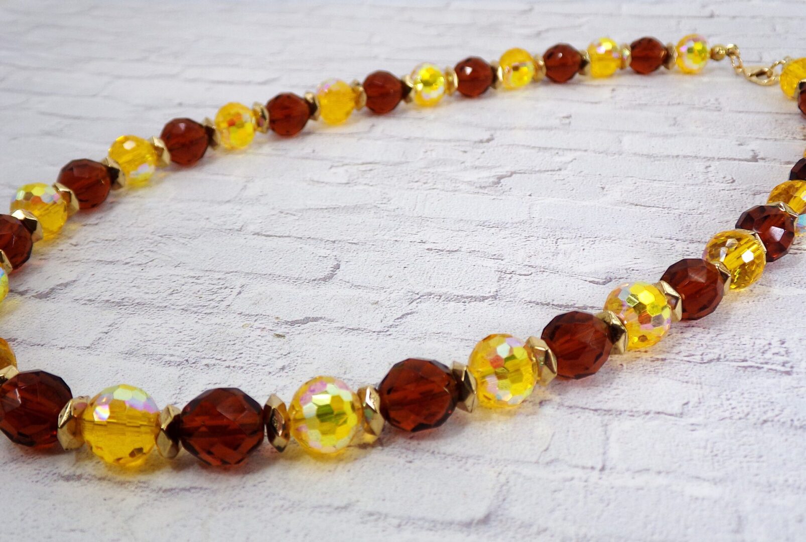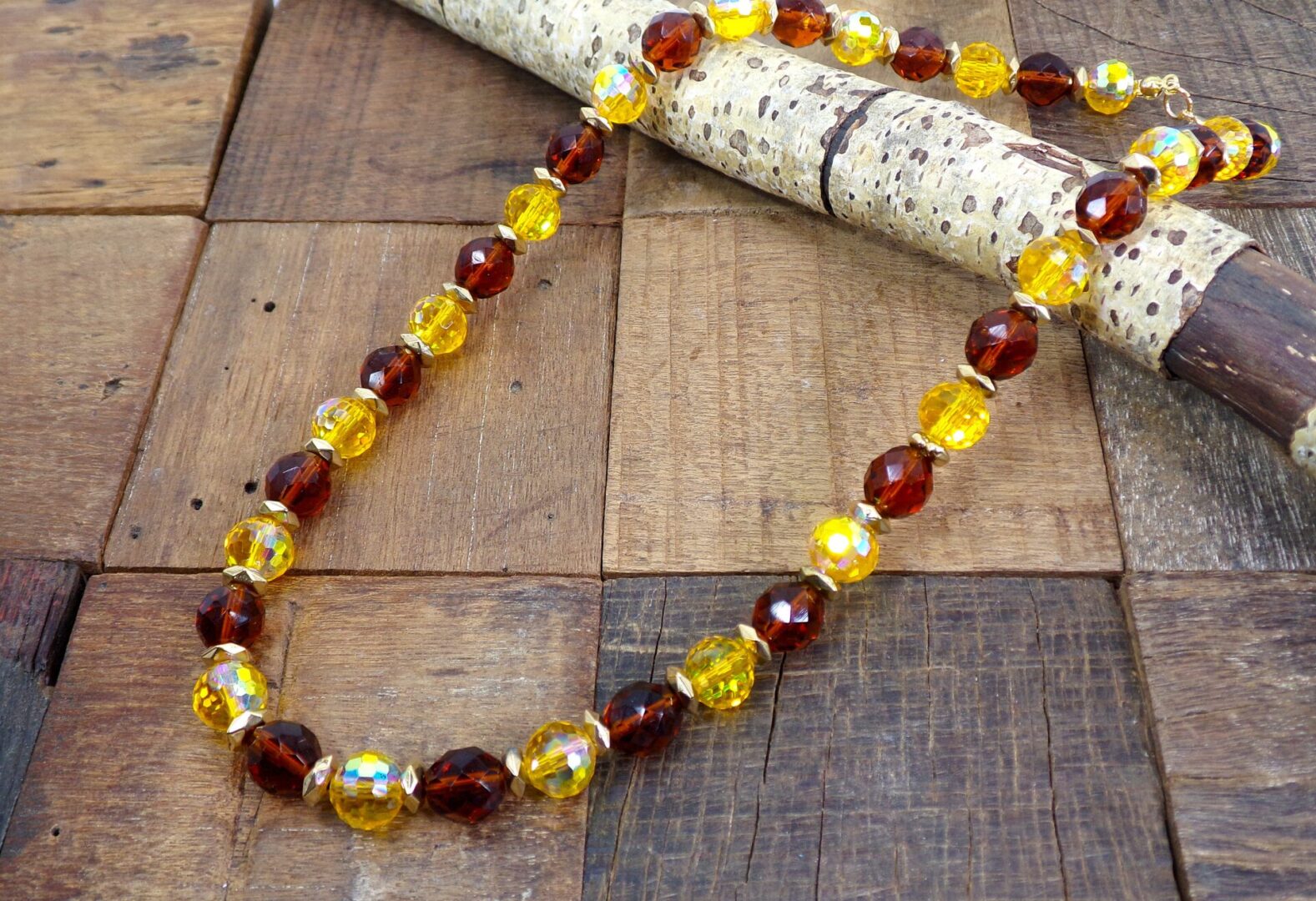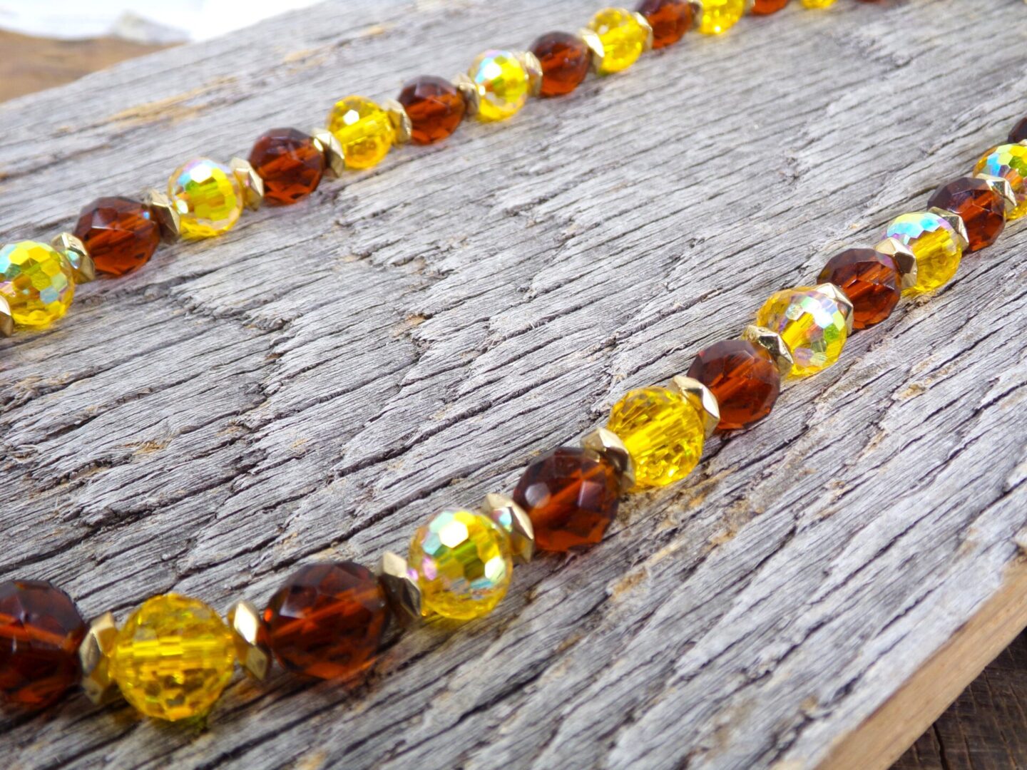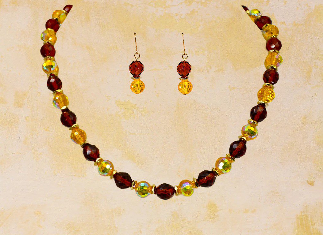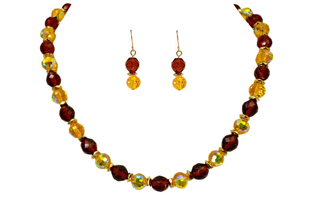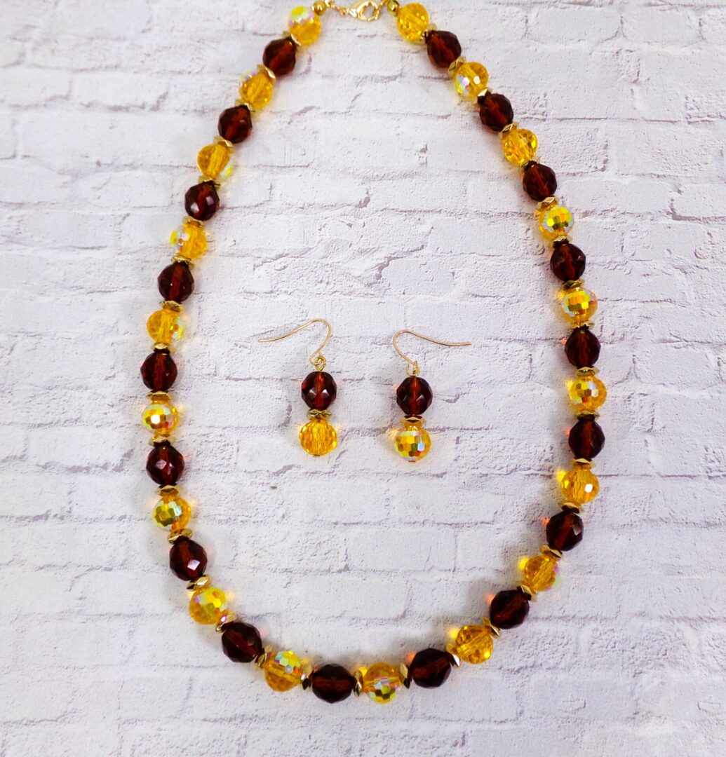 Pretty yellow and brown all glass bead necklace and earring set. It is designed with round glass beads mixed with gold spacer beads. A beautiful color mix that is perfect for any occasion.