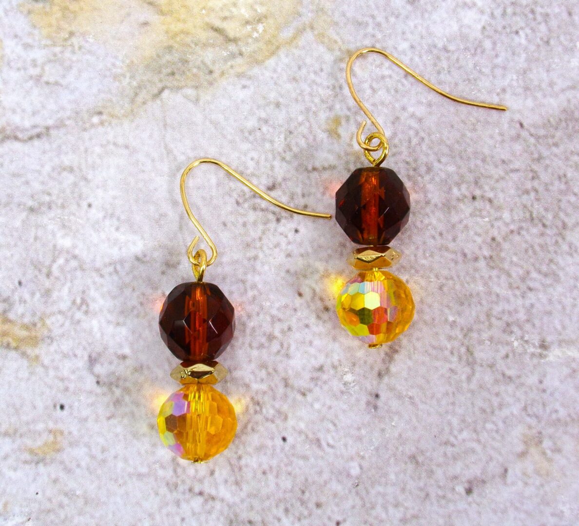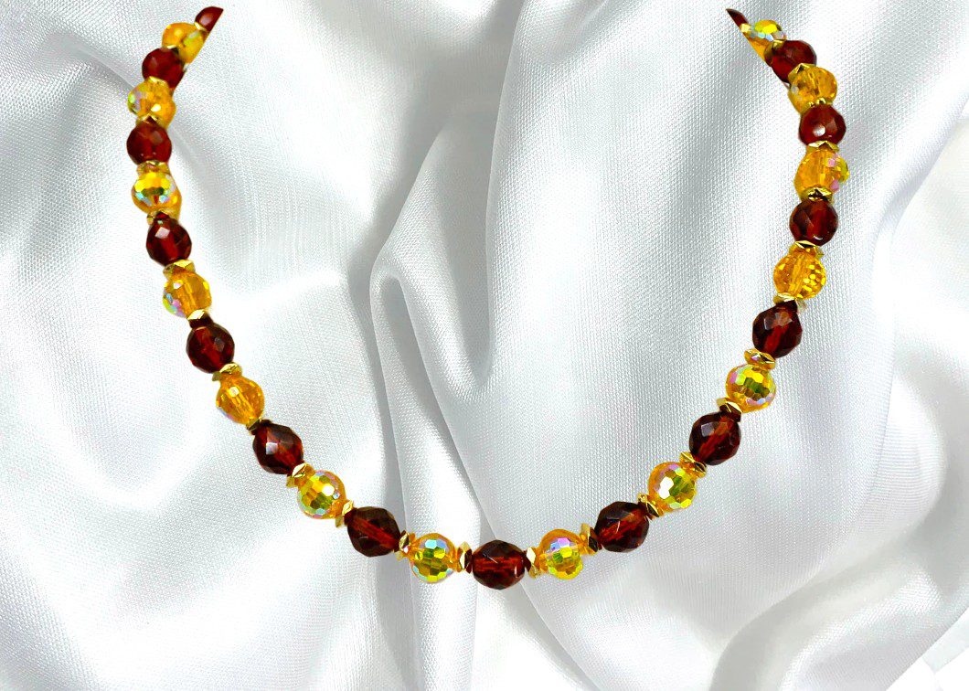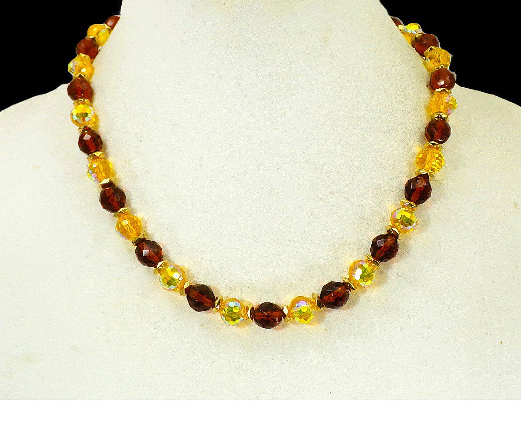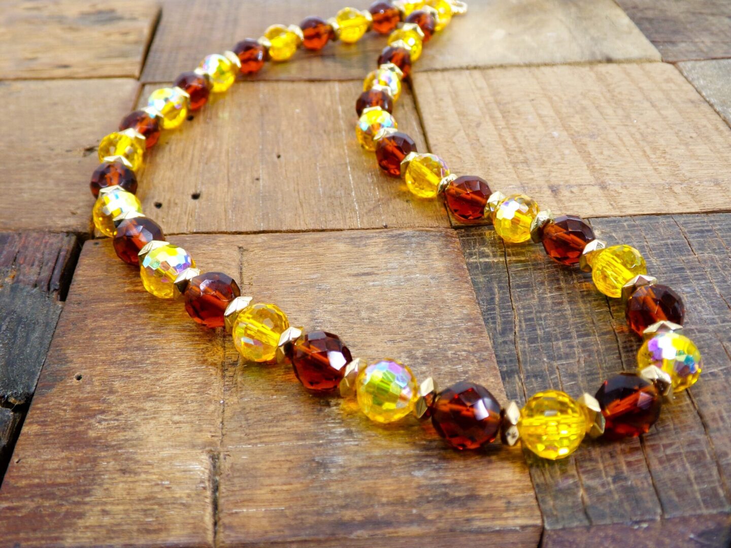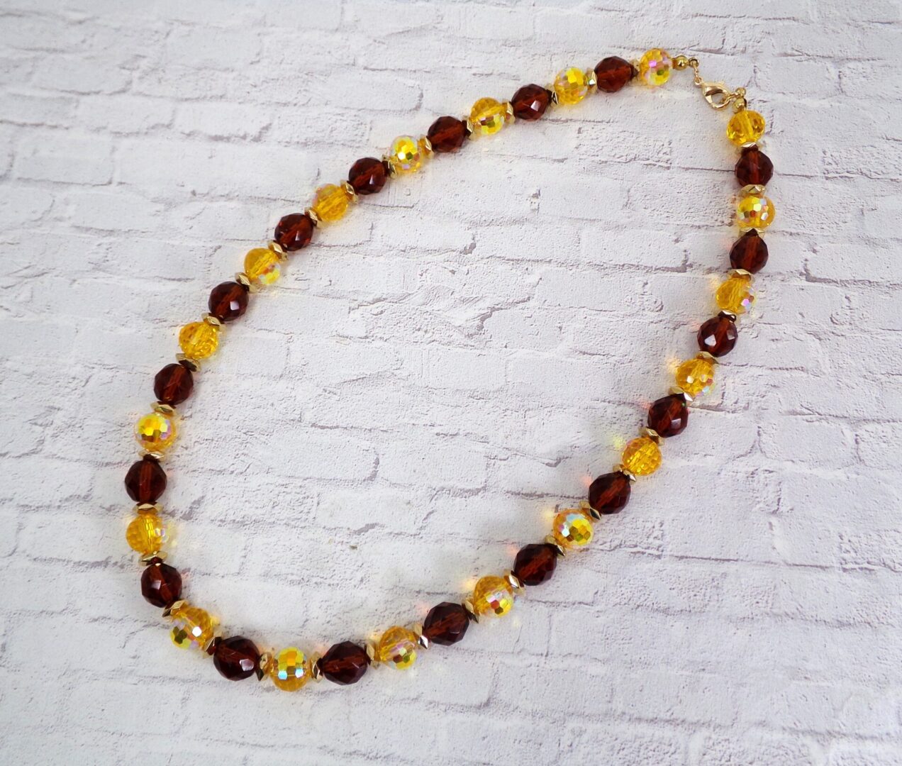 Pretty yellow and brown all glass bead necklace and earring set. It is designed with round glass beads mixed with gold spacer beads. A beautiful color mix that is perfect for any occasion.